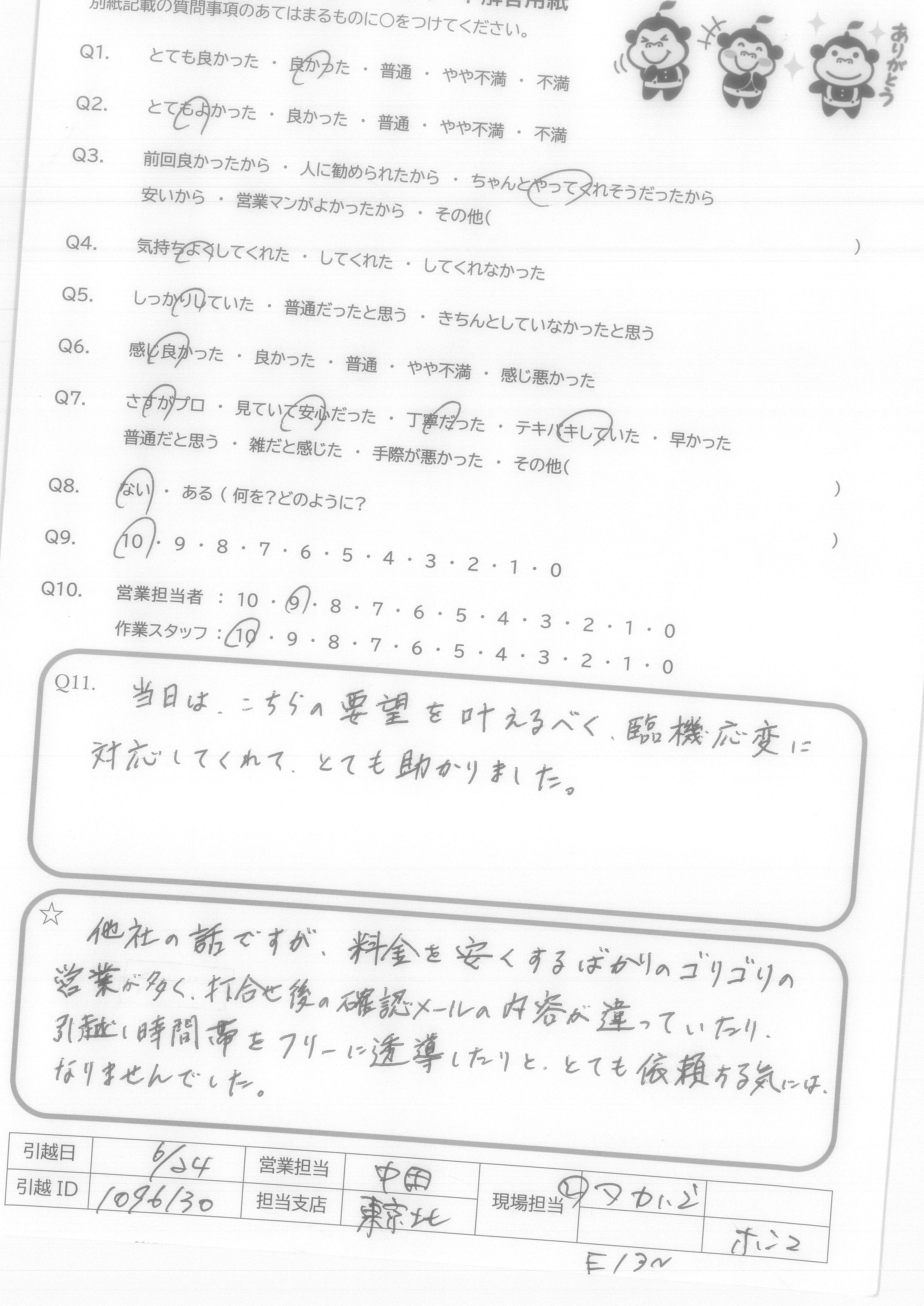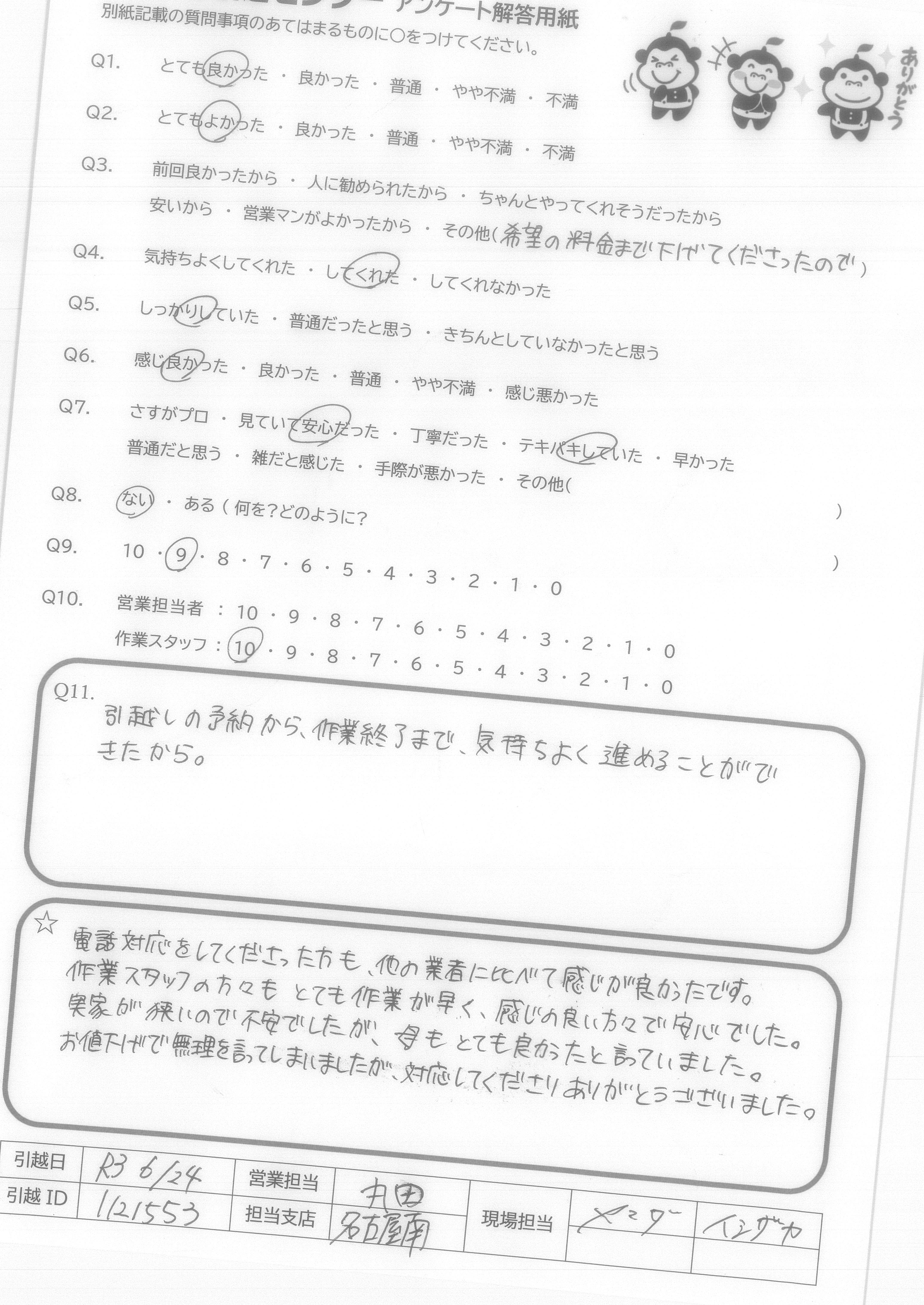 A.2人のうち、1人しか挨拶がなかった。しかし、物の置場など細くきいてくれて、全体的にとても満足、次もお願いしたいと思います!ありがとうございました!