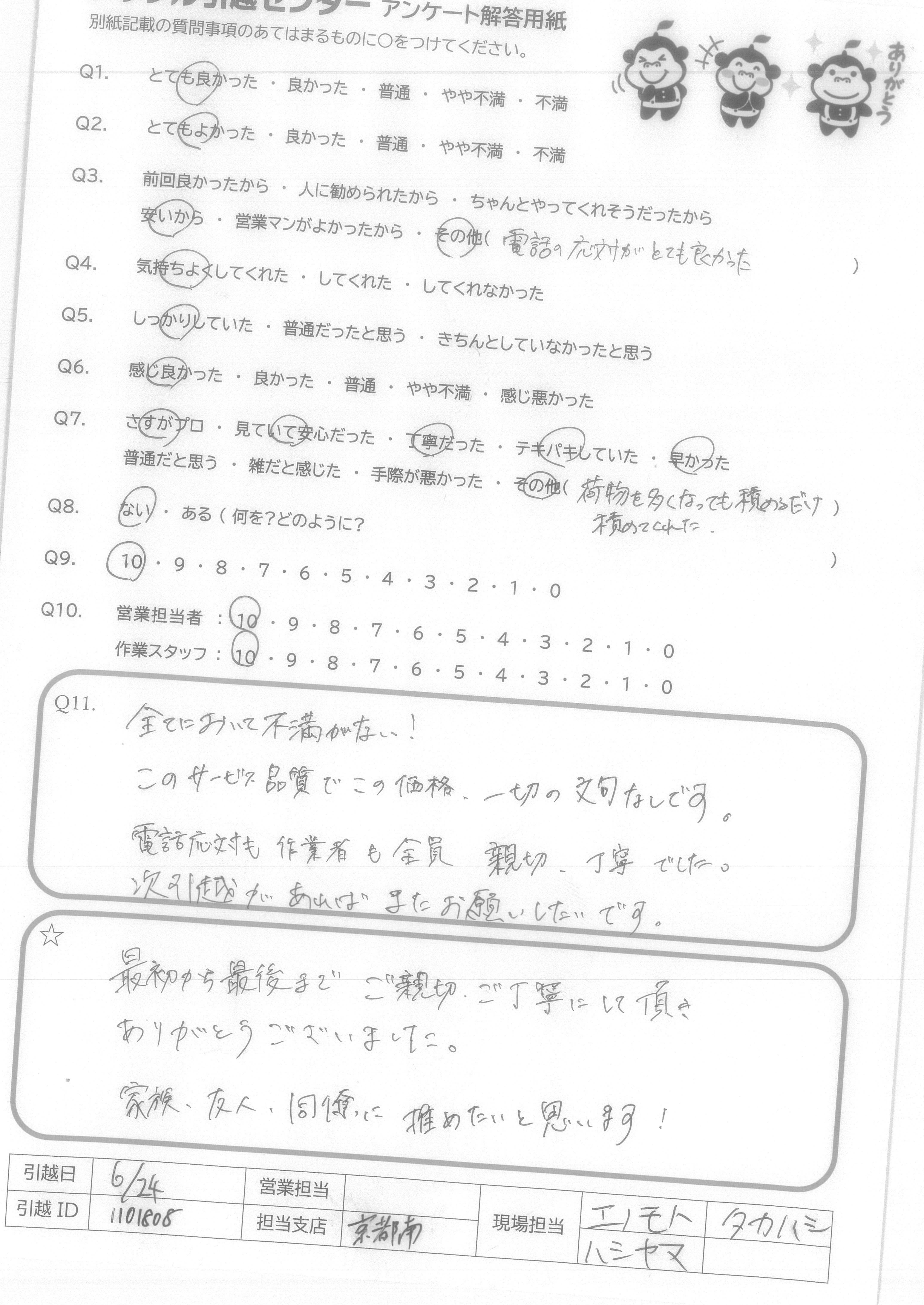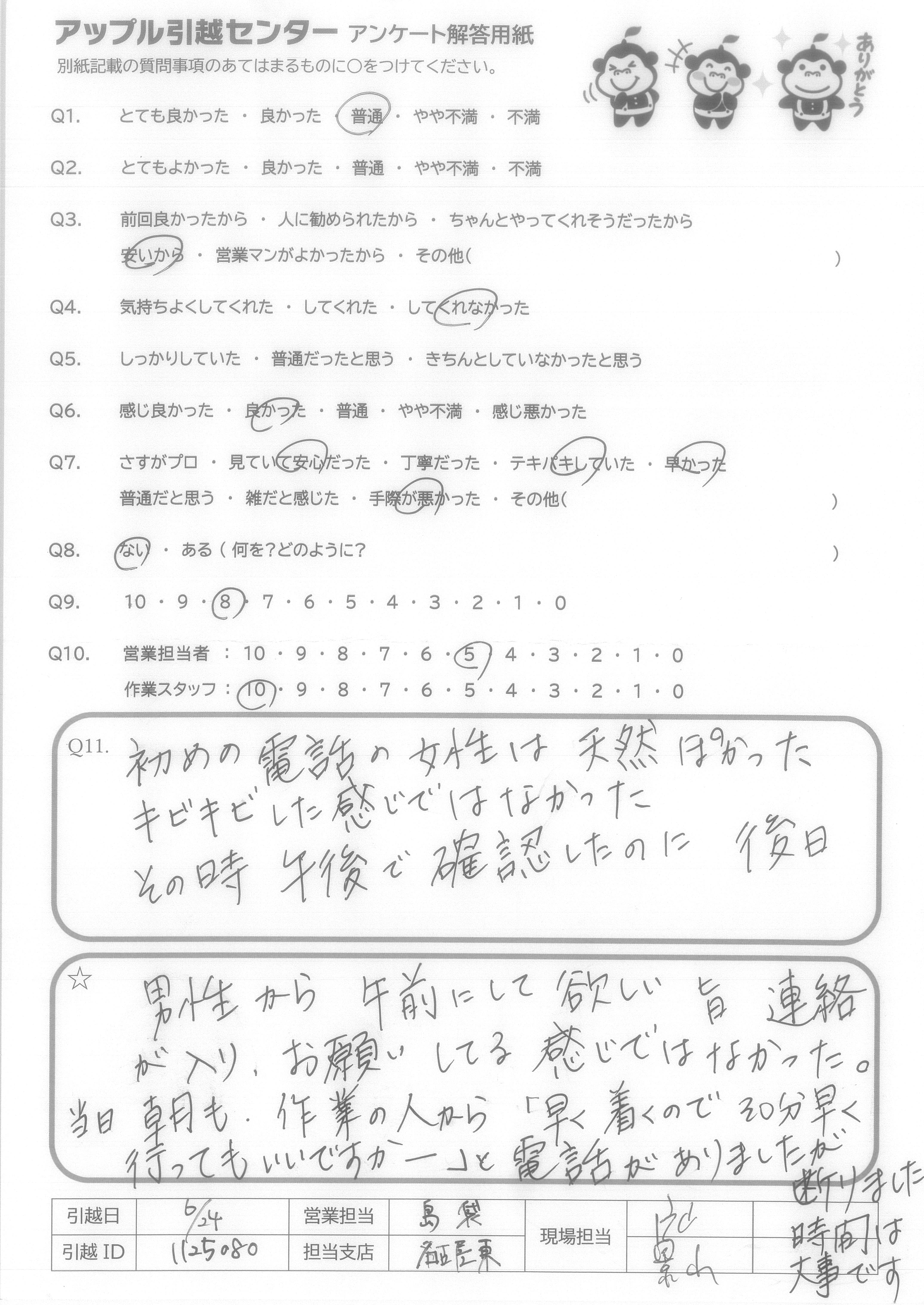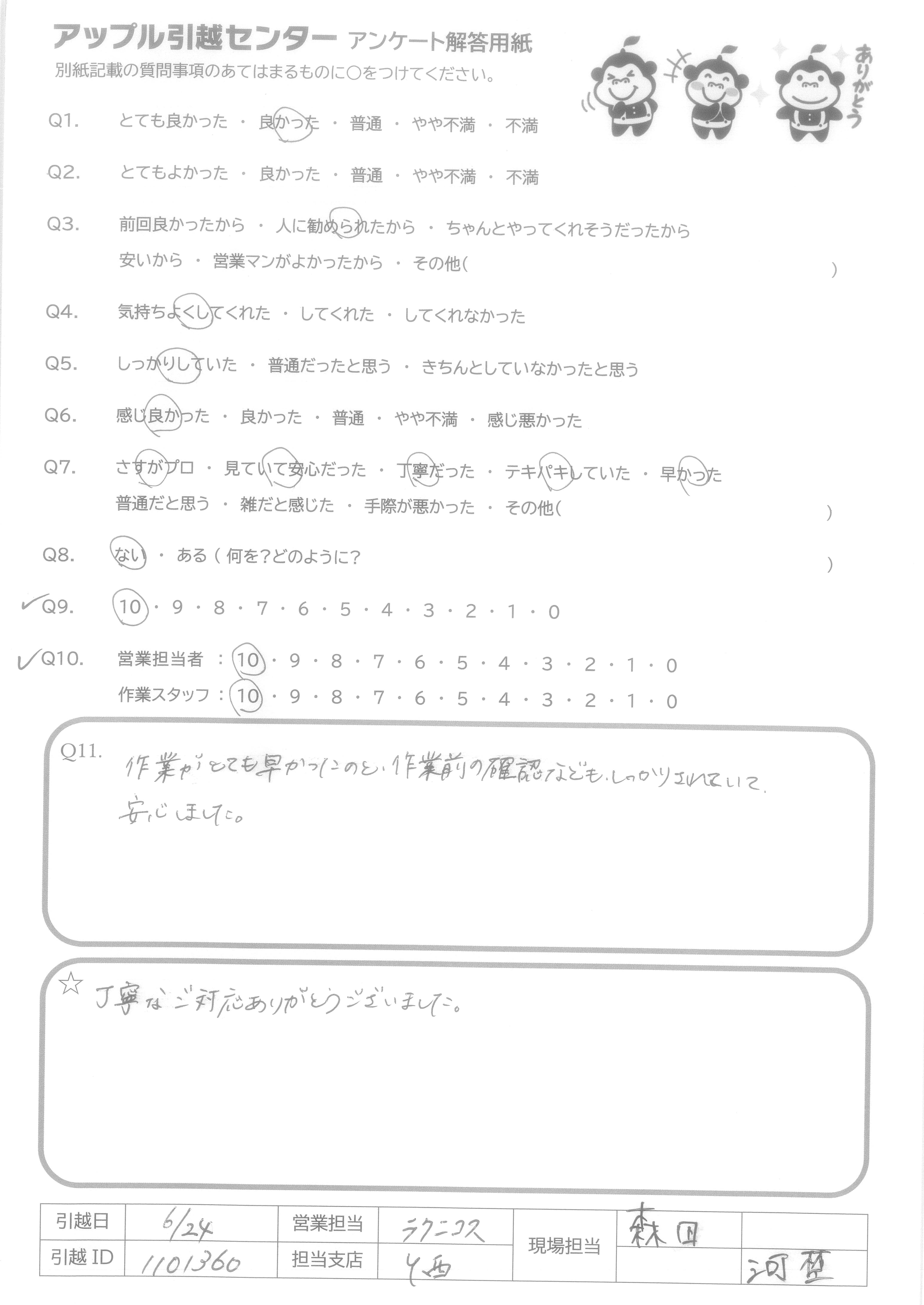A.全てにおいて不満がない! このサービス品質でこの価格、一切の文句なしです。 電話応対も作業者も全員親切、丁寧でした。 次引越があればまたお願いしたいです。