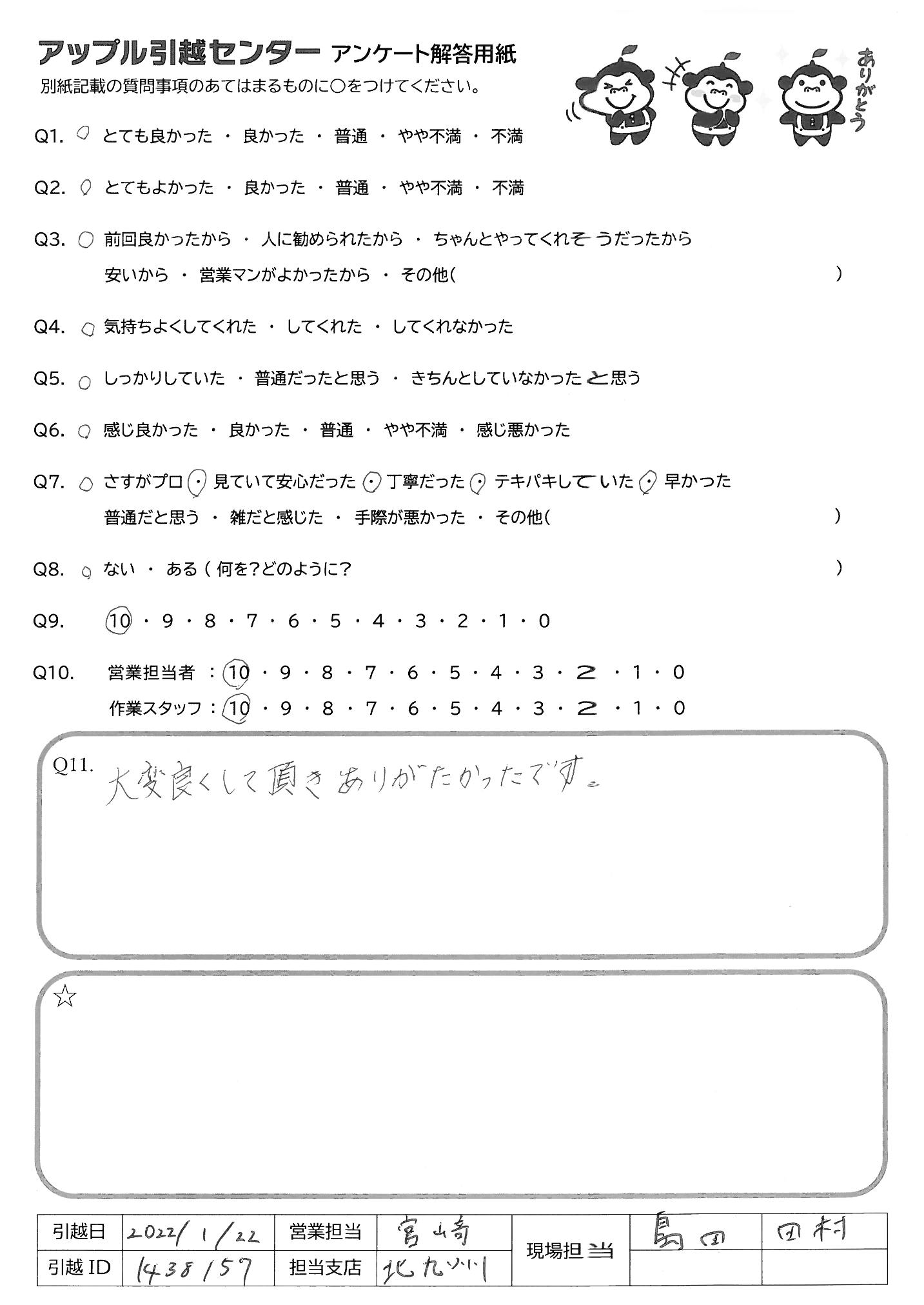 A.今回、2回目の利用となります。前回もそうでしたが、作業が とても早く、かつ丁寧でした(大手引越センターさんよりも) 費用も抑えられ、とても助かりました、もしまた引越す時があったら またお願いしようと決めています。ありがとうございました。