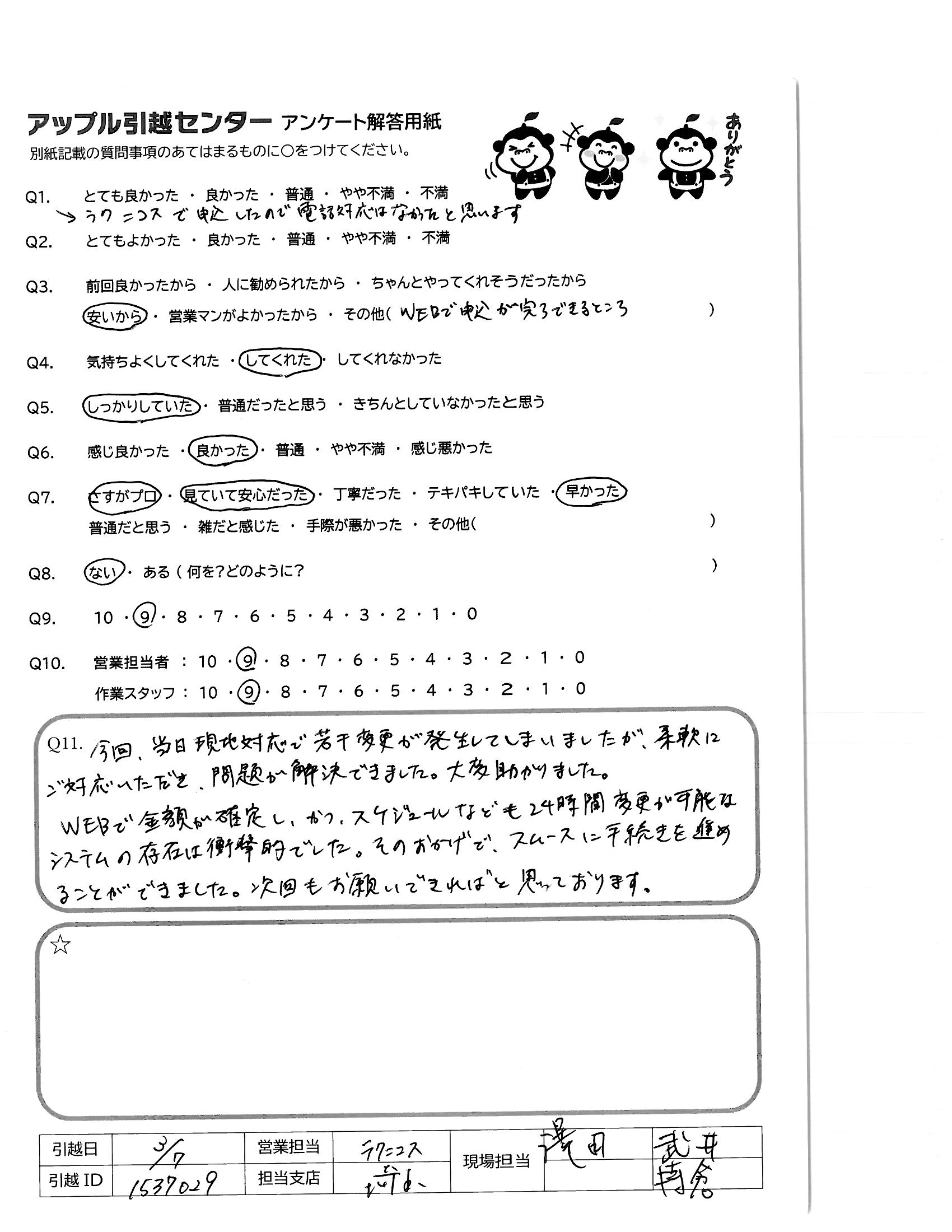 A.初めての引越しで何社か電話をして見積りをしてもらいました。 その中でアップルさんの電話対応は、今回お願いする荷物も少ないのに親切に対応してくれた事にとても安心しました。 そして主人と相談して対応、価格の話をしてアップルさんにお願いする事にしました。 もちろん電話で予約した方と当日来られる方は違うのでどうかな??と心配していましたが若い男性2人、連絡〜挨拶から説明〜積込みととてもテキパキされていて感じもよく気持ちがよかったです。 引越し先では、主人が対応したのですがいつも厳しい事を言う事が多いのですが、とても良かったと言っていました。 今回お願いして本当によかったです。 知人が探していたら勧めようと思います。 お世話になりました。