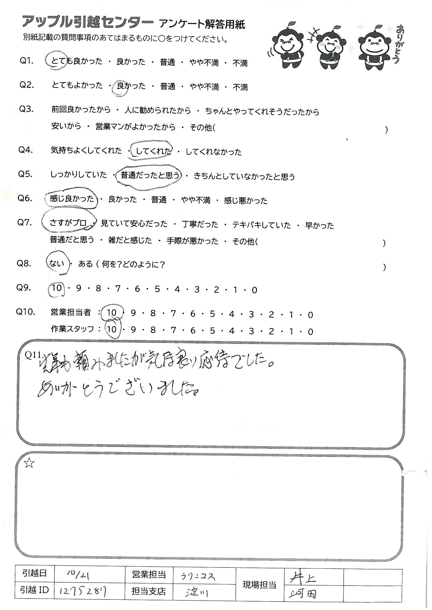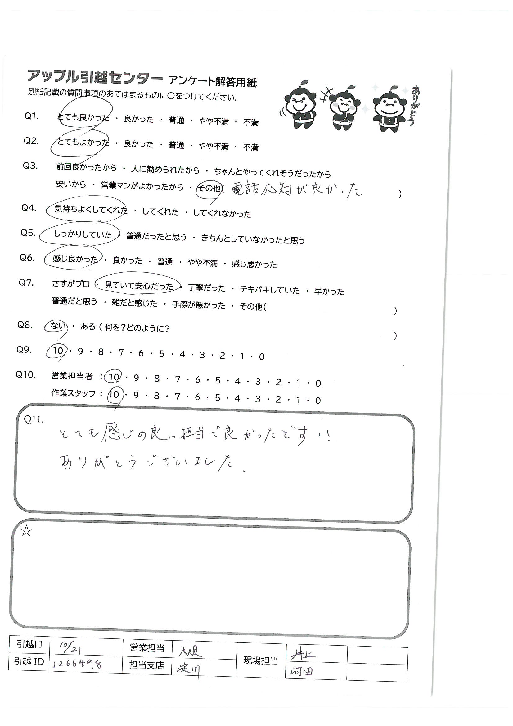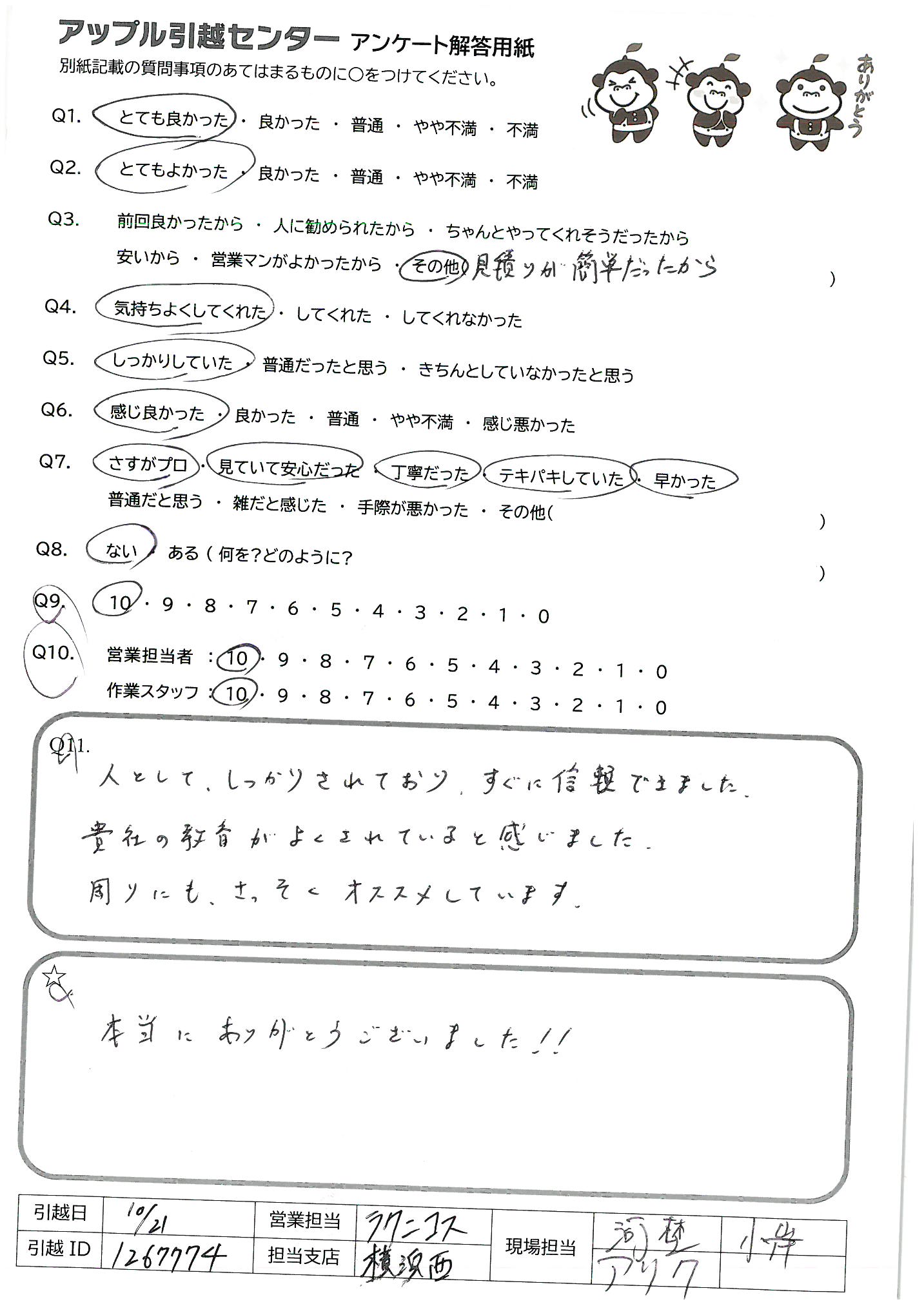 A.大変お世話になりました。終始てきぱきと、笑顔で対応くださり安心して作業をお任せできました。次回があればぜひまたお願いしたいです。ありがとうございました?