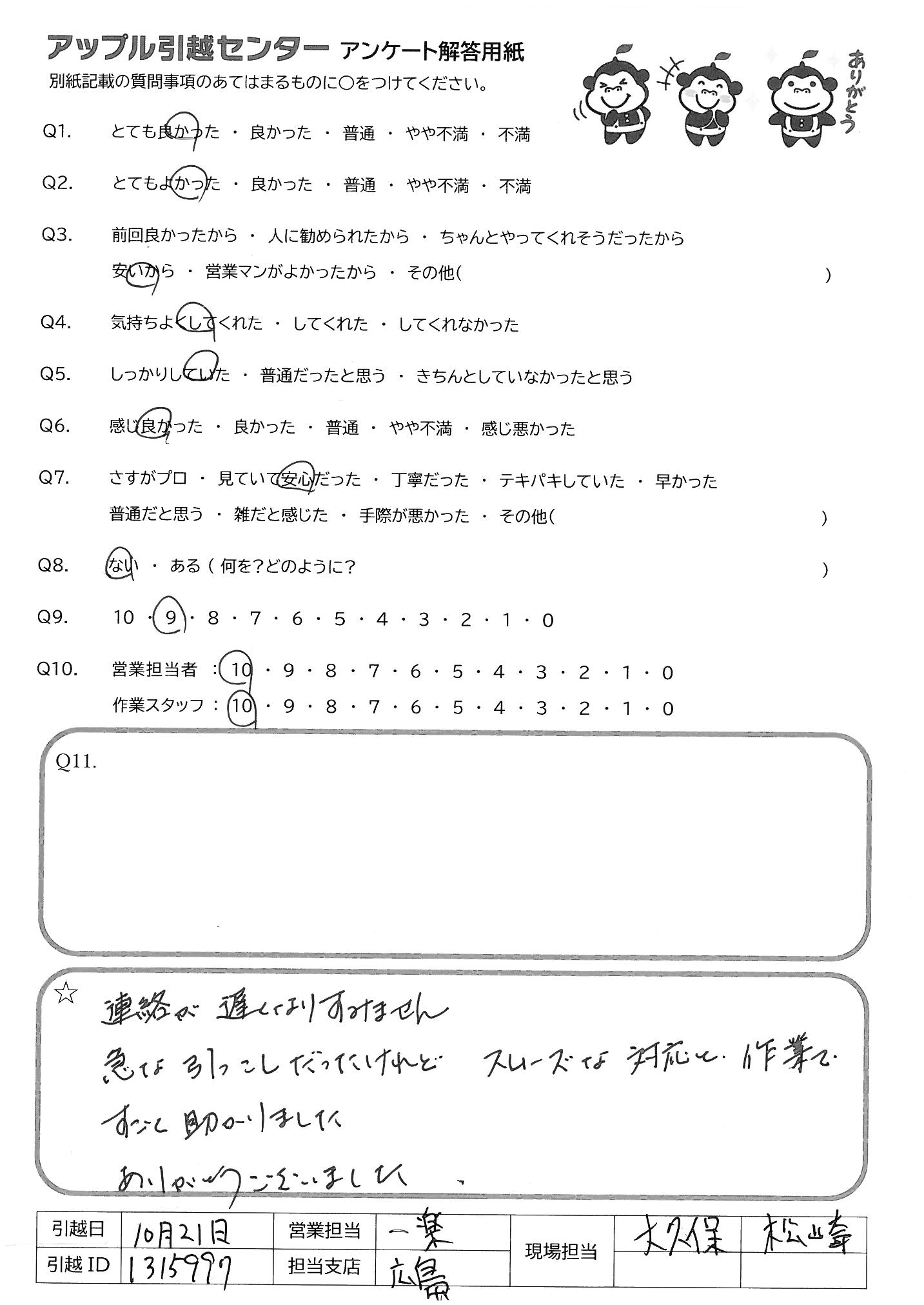 引越し日:2021年10月20日 エリア:広島県広島市南区