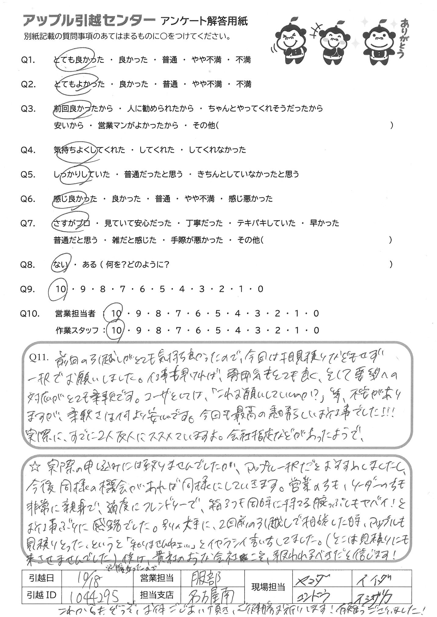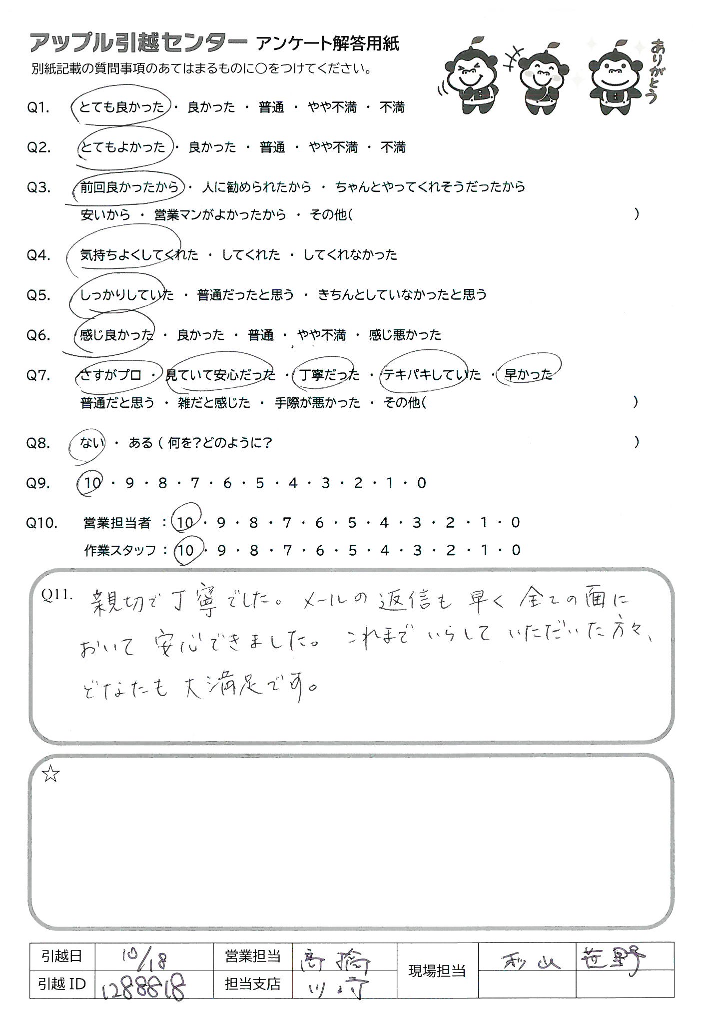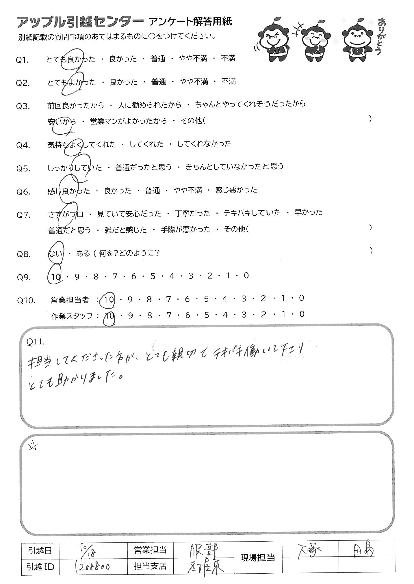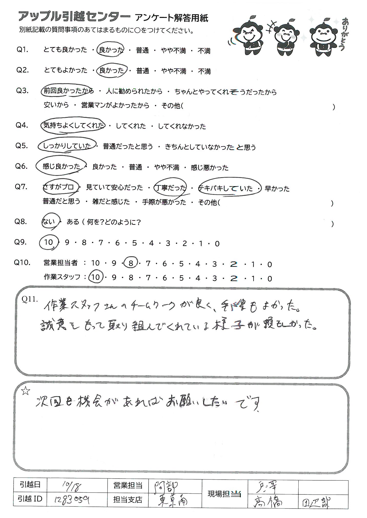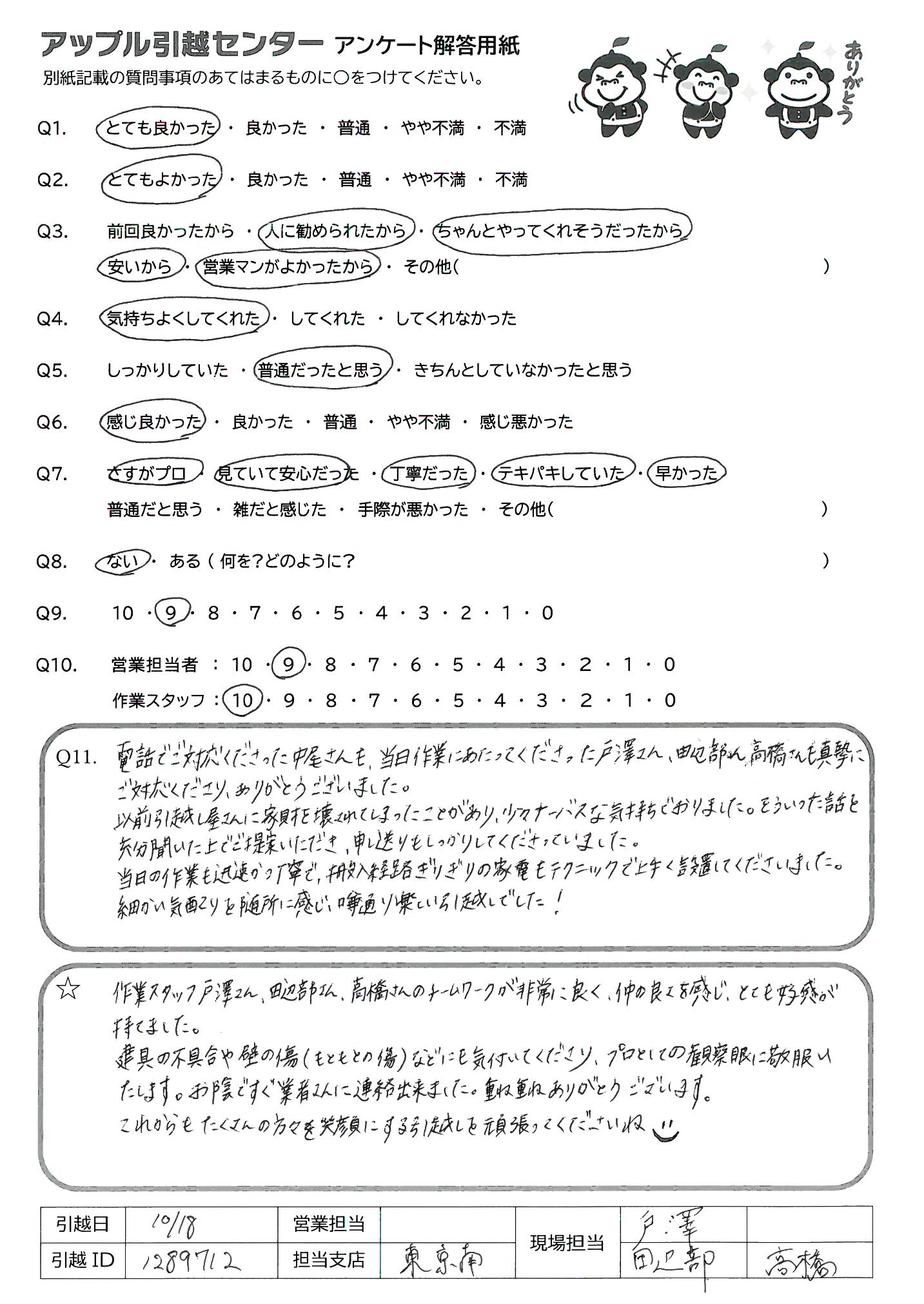 A.電話でご対応くださった中尾さんも、当日作業にあたってくださった戸澤さん、田辺部さん高橋さんも真摯にご対応くださり、ありがとうございました。 以前引越し屋さんに家財を壊されてしまったことがあり、少々ナーバスな気持ちでおりました。そういった話を充分聞いた上でご提案いただき、申し送りをしっかりしてくださっていました。 当日の作業も迅速かつ丁寧で、搬入経路ぎりぎりの家電もテクニックで上手く設置してくださいました。 細かい気配りを随所に感じ、噂通り楽しい引越しでした!