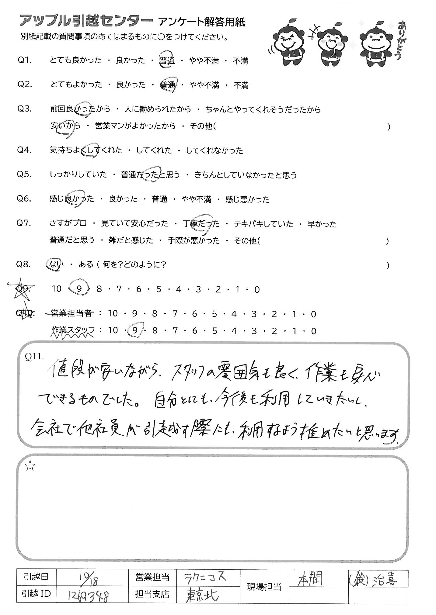 A.値段が安いながら、スタッフの雰囲気も良く、作業も安心できるものでした。 自分はしても、今後も利用していきたいし、会社で他社員が引越す際にも、利用するよう推めたいと思います。