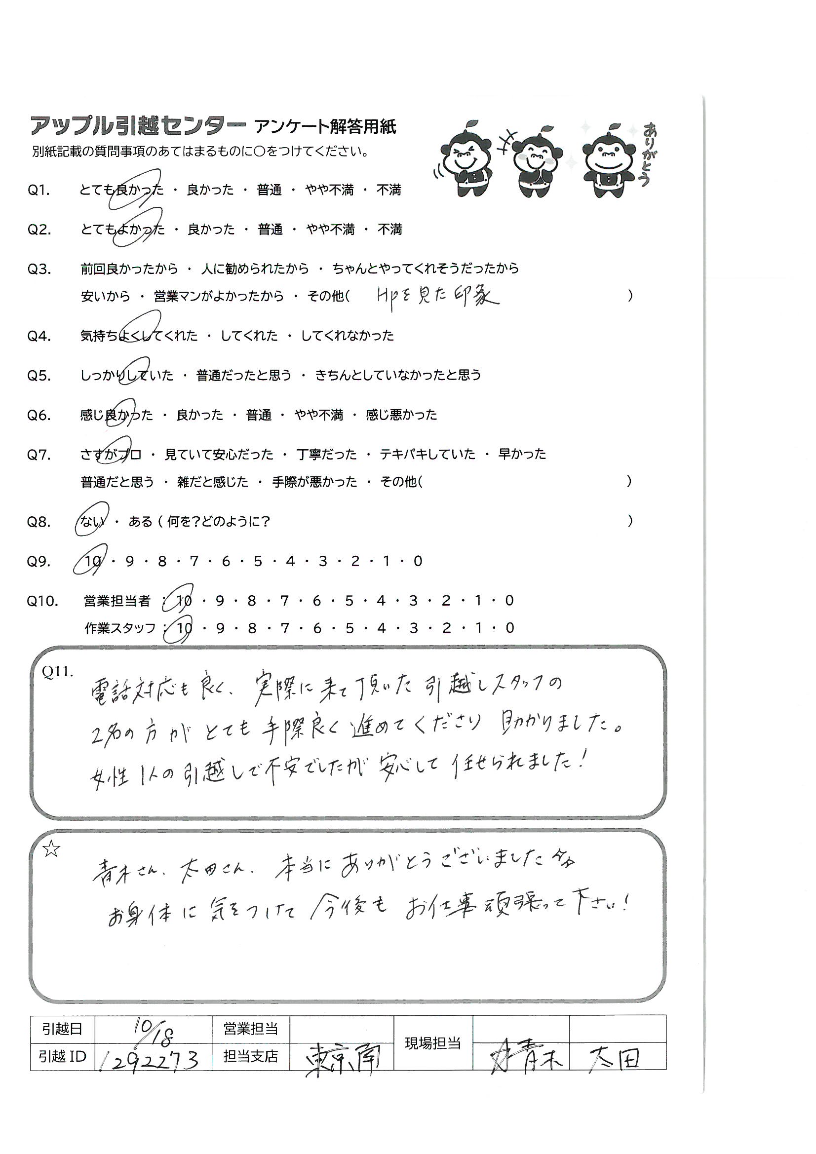 A.電話対応も良く、実際に来て頂いた引越しスタッフの2名の方がとても手際良く進めてくださり助かりました。 女性1人の引越しで不安でしたが、安心して任せられました!