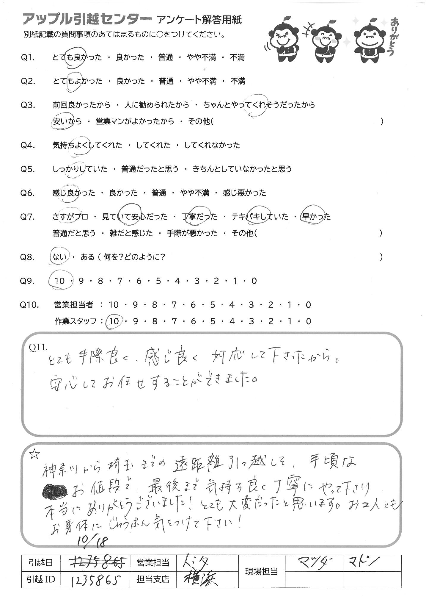A.神奈川から埼玉までの遠距離引っ越しを、手頃なお値段で、最後まで気持ち良く丁寧にやって下さり本当にありがとうございました!とても大変だったと思います。お2人ともお身体にじゅうぶん気をつけて下さい!