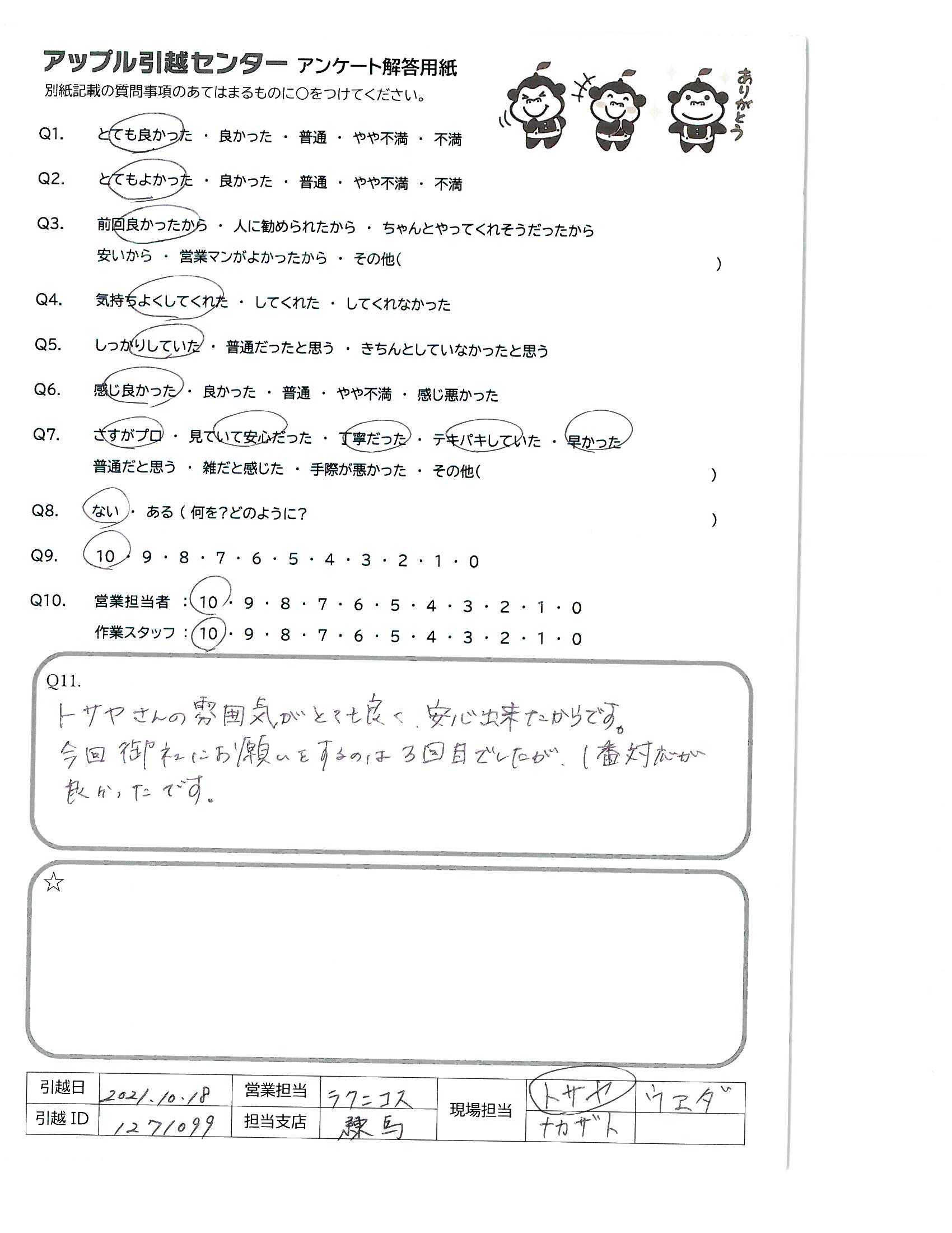 A.トサヤさんの雰囲気がとても良く、安心出来たからです。 今回御社にお願いをするのは3回目でしたが、1番対応が良かったです。