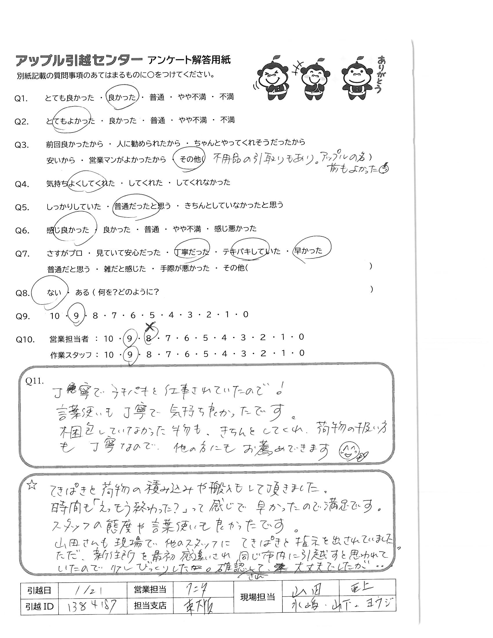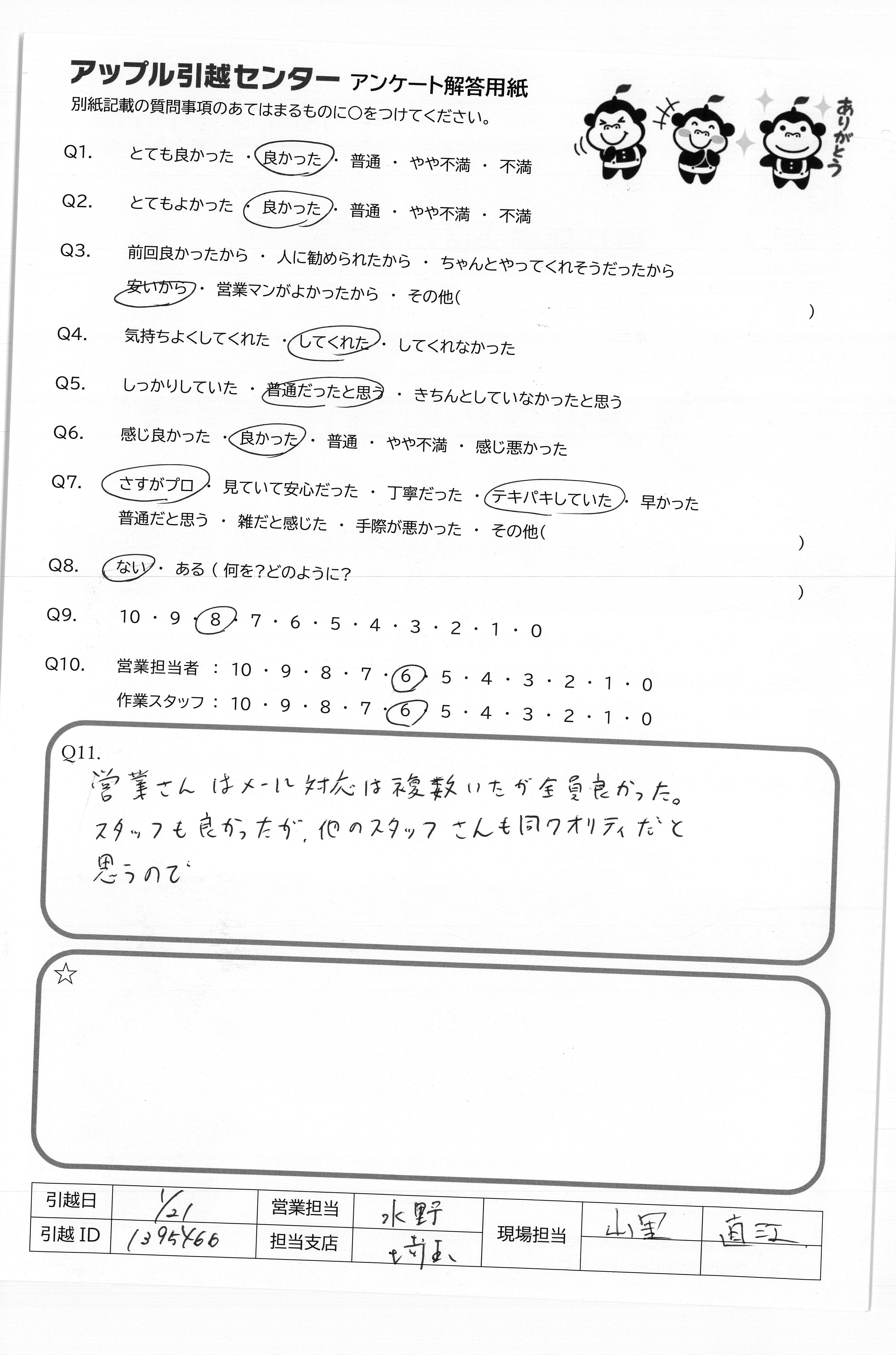 A.てきぱきと荷物の積み込みや搬入もして頂きました。 時間も「えっもう終わった?」って感じで早かったので満足です。 スタッフの態度や言葉使いも良かったです。 山田さんも現場で、他のスタッフにてきぱきと指示を出されていました。 ただ、新住所を最初感違いされ同じ市内に引越すと思われていたので、少しびっくりした。確認されて、大丈夫でしたが…