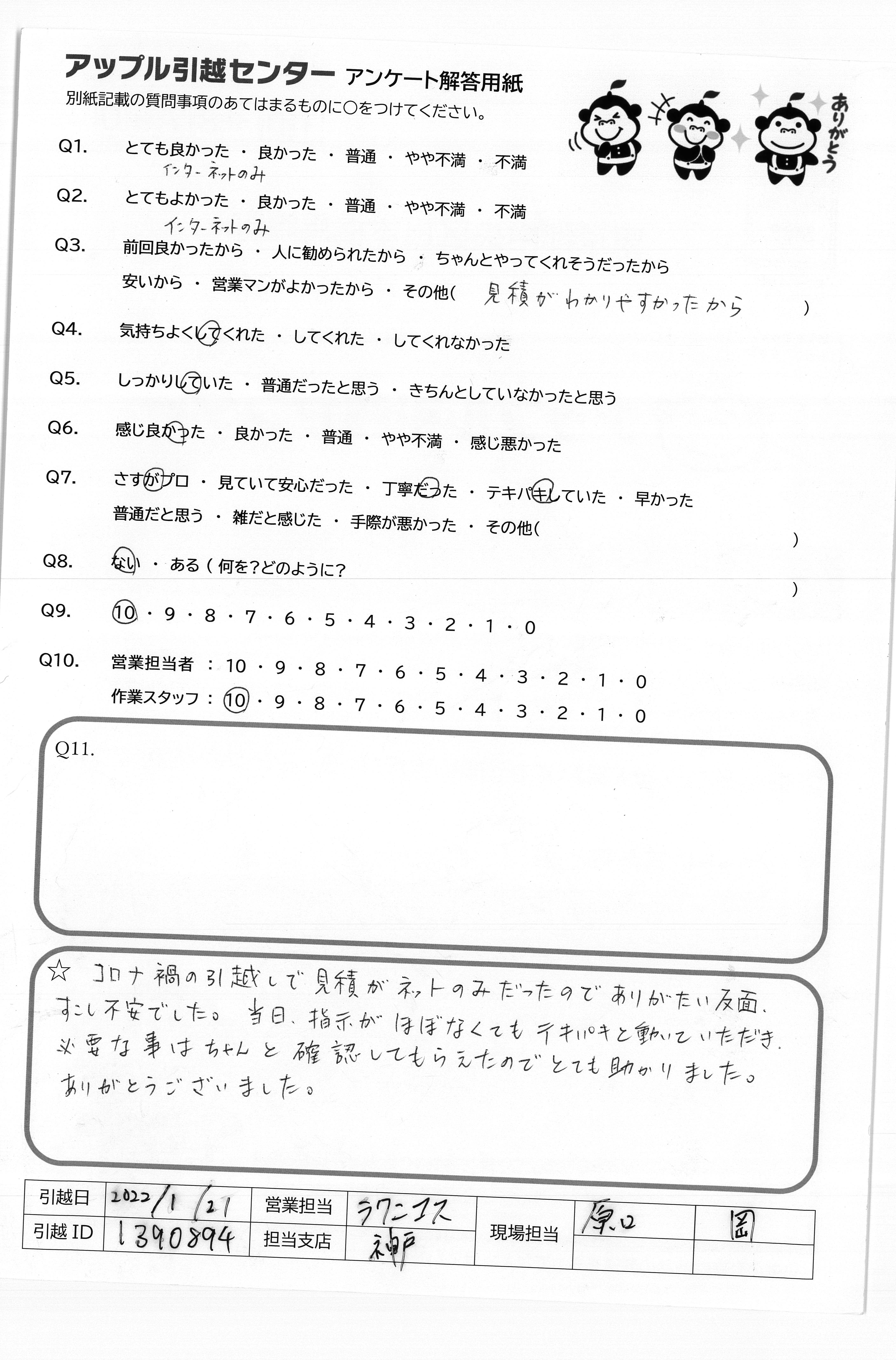 A.コロナ禍の引越しで見積がネットのみだったのでありがたい反面、すこし不安でした。当日、指示がほぼなくてもテキパキと動いていただき、必要な事はちゃんと確認してもらえたのでとても助かりました。ありがとうございました。