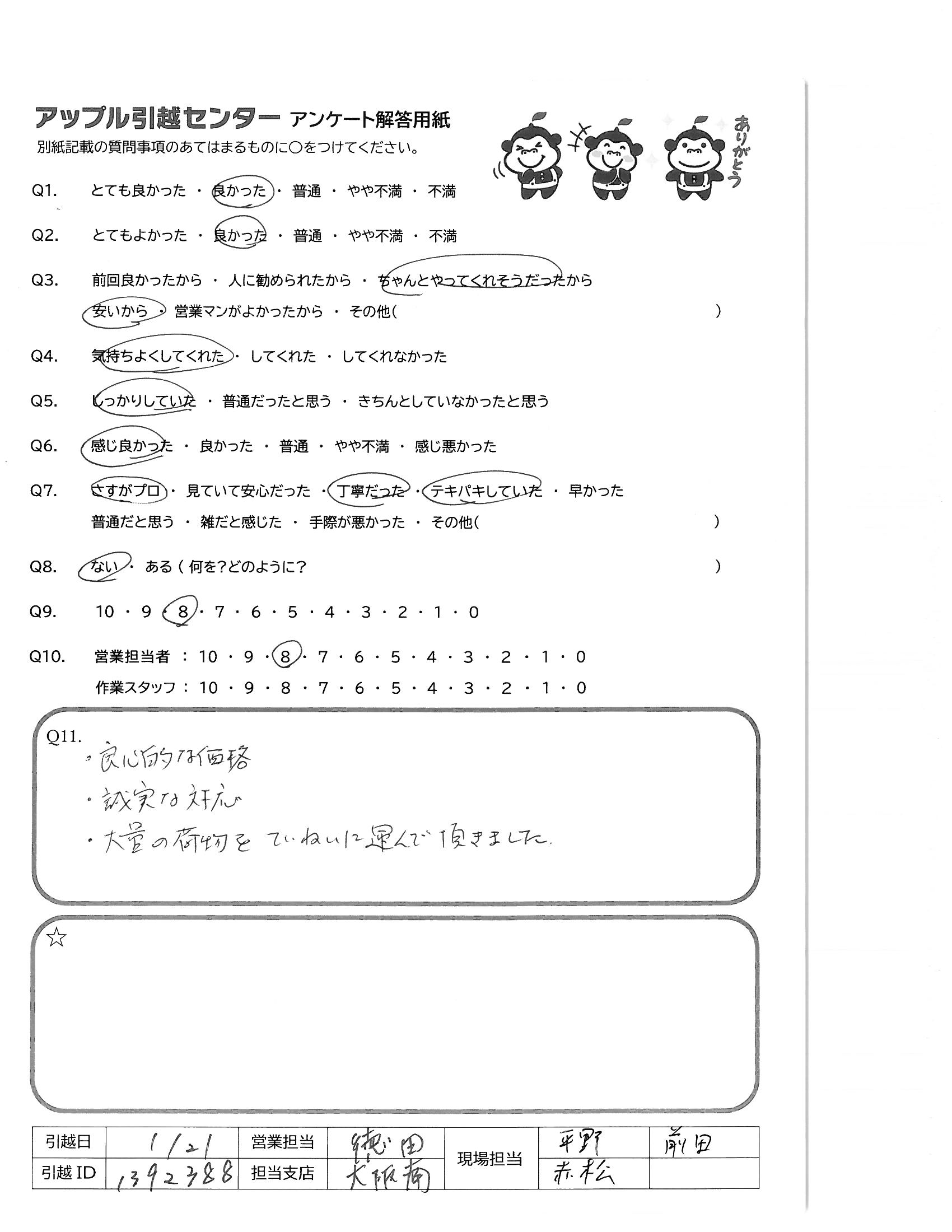 A.・良心的な価格 ・誠実な対応 ・大量の荷物をていねいに運んで頂きました。