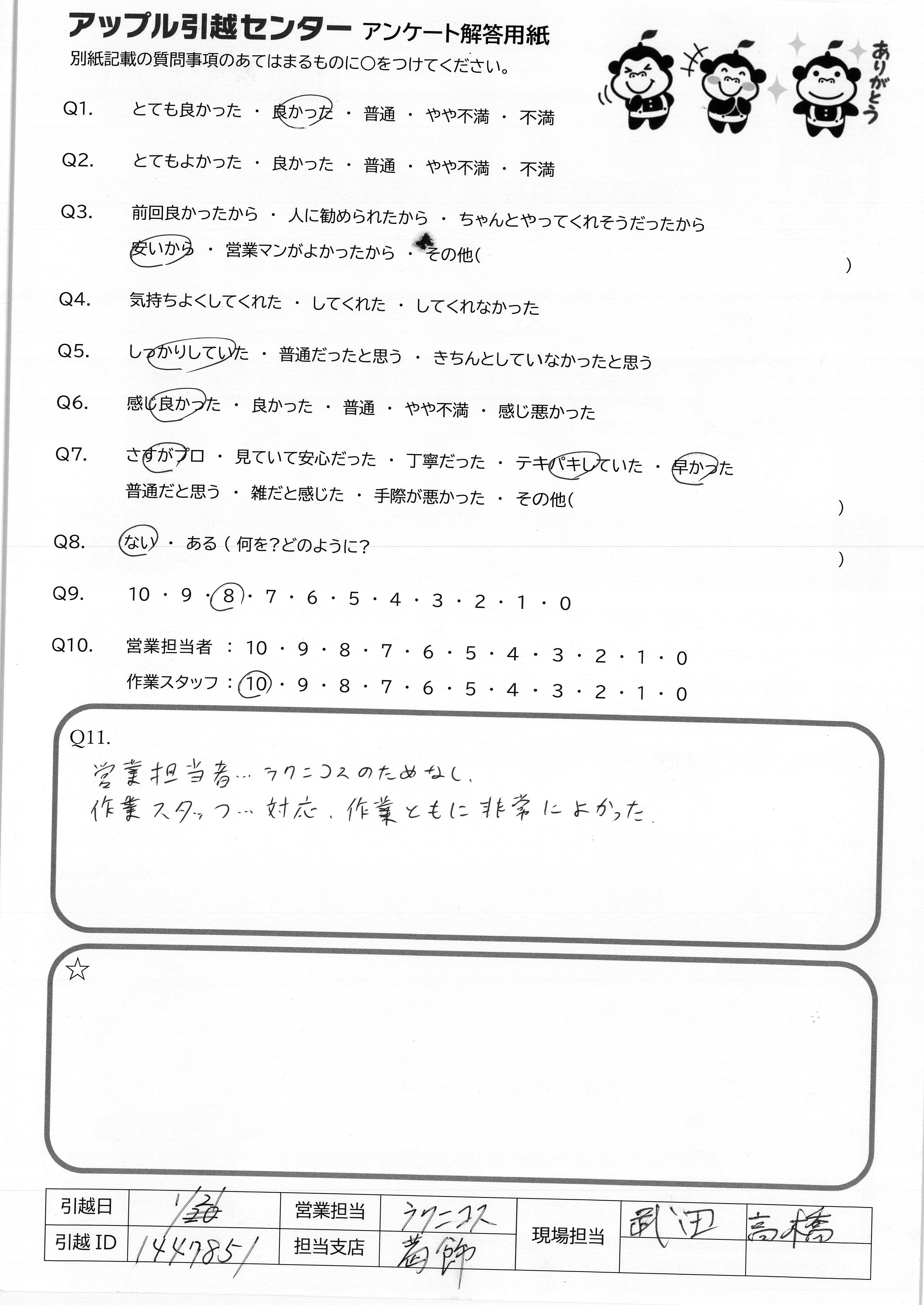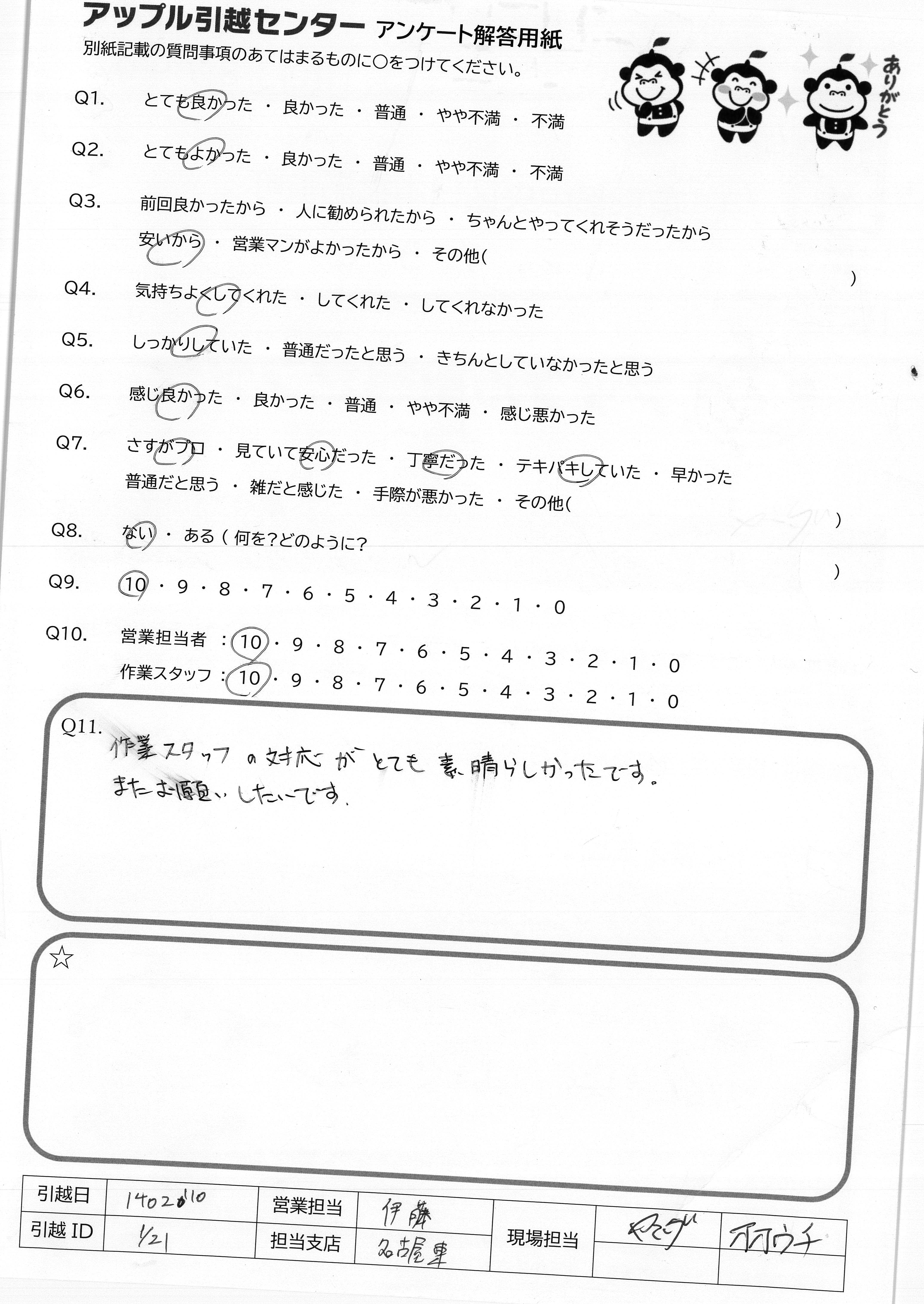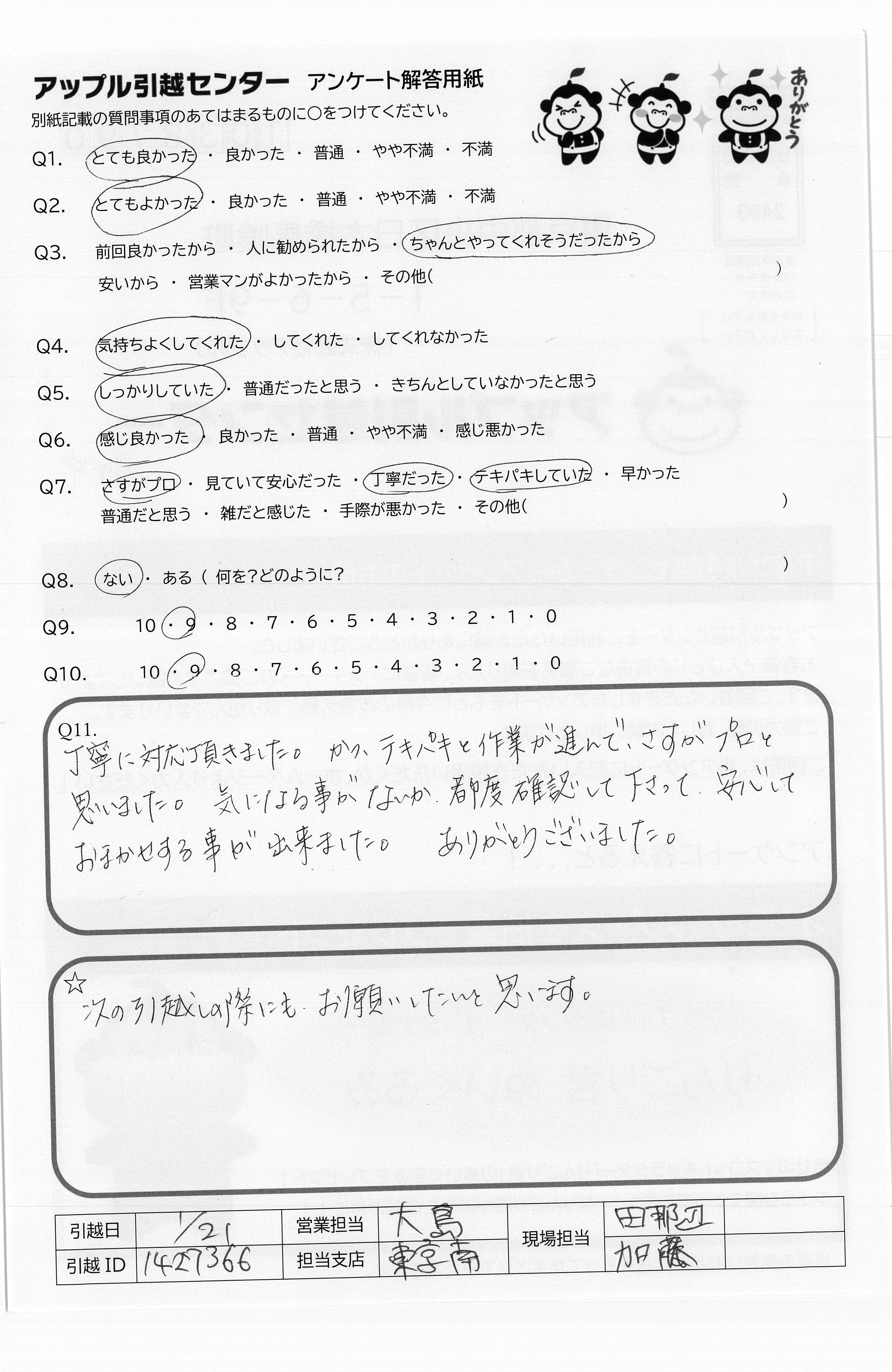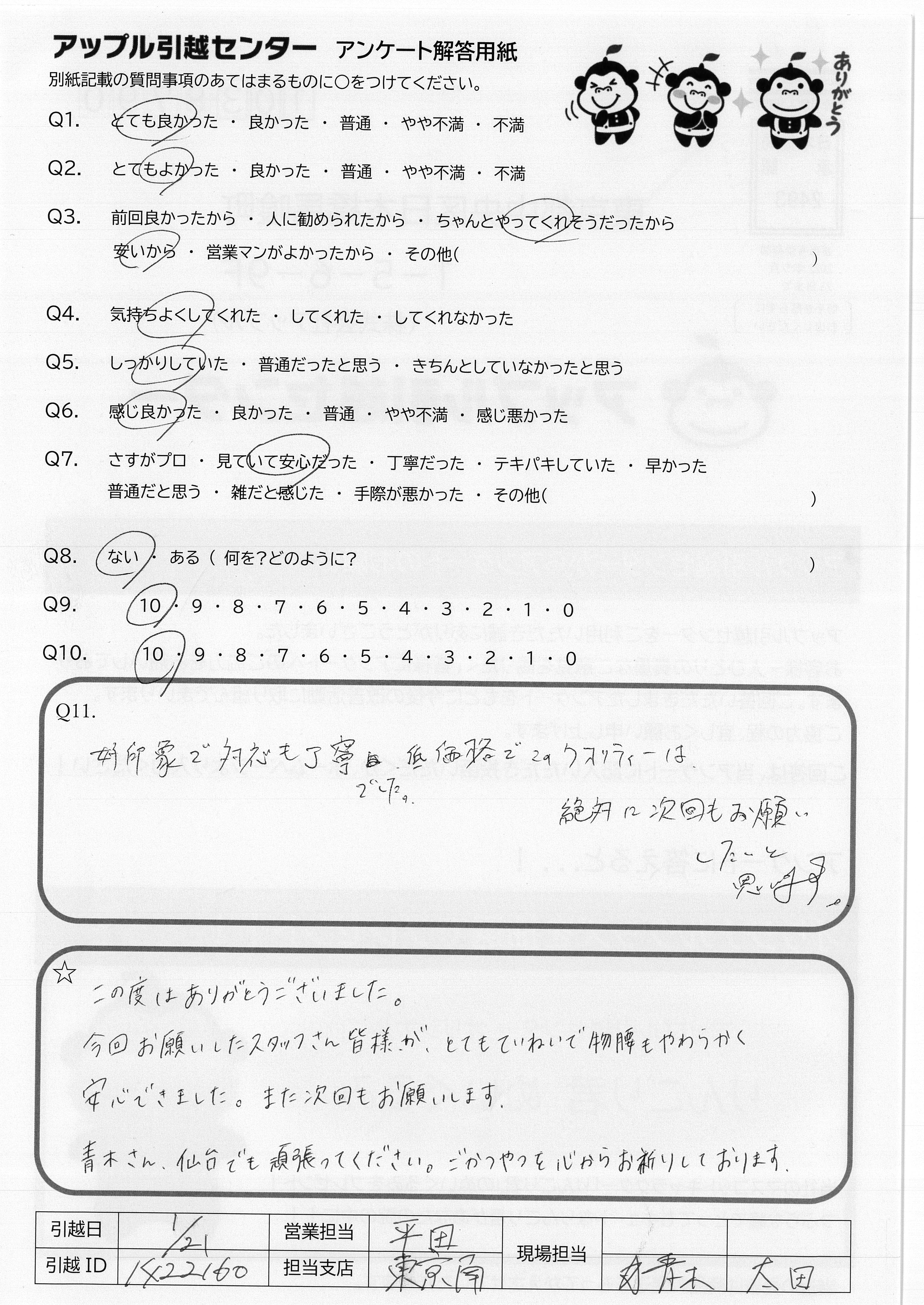 A.この度はありがとうございました。 今回お願いしたスタッフさん皆様が、とてもていねいで物腰もやわらかく安心できました。また次回もお願いします。 青木さん、仙台でも頑張ってください。ごかつやくを心からお祈りしております。
