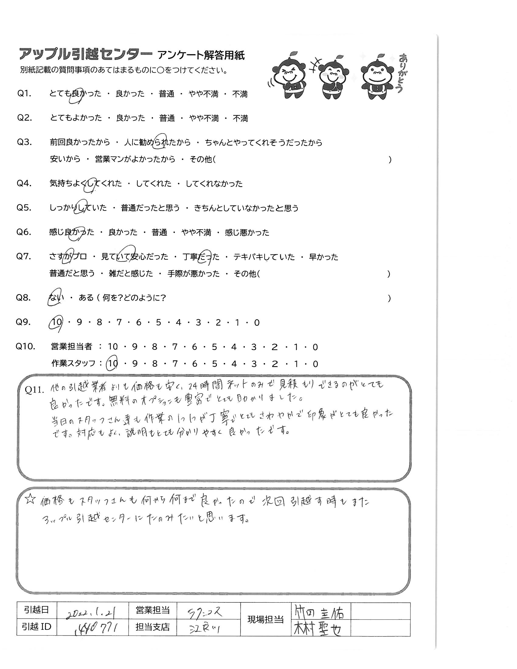 A.他の引越業者よりも価格も安く、24時間ネットのみで見積もりできるのがとても良かったです。無料のオプションも豊富でとても助かりました。 当日のスタッフさん達も作業の1つ1つが丁寧でとてもさわやかで印象がとても良かったです。対応もよく、説明もとても分かりやすく良かったです。