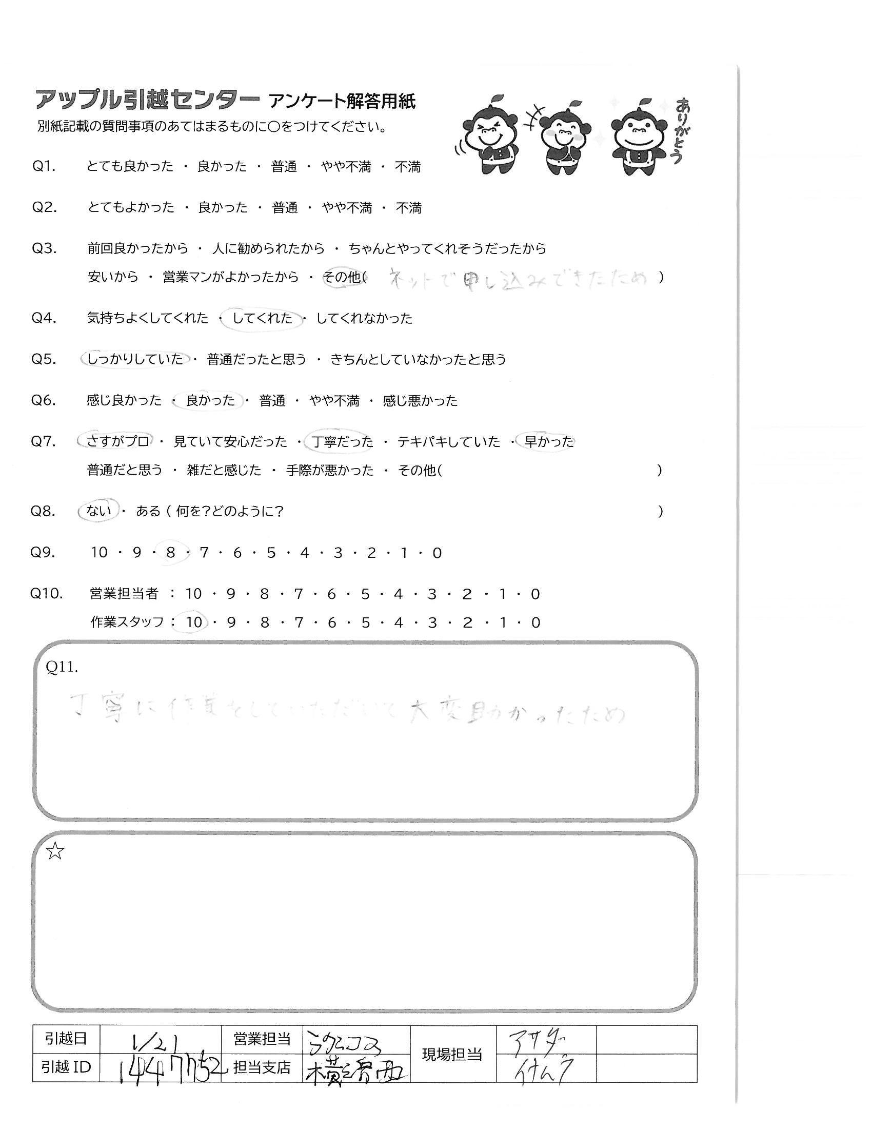 A.ひとつひとつとても丁寧にテキパキと作業して下さり。 細かなところにまで心をくばって頂いたので、 荷出しも荷おろしもとても安心してお任せできました。 ありがとうございました。