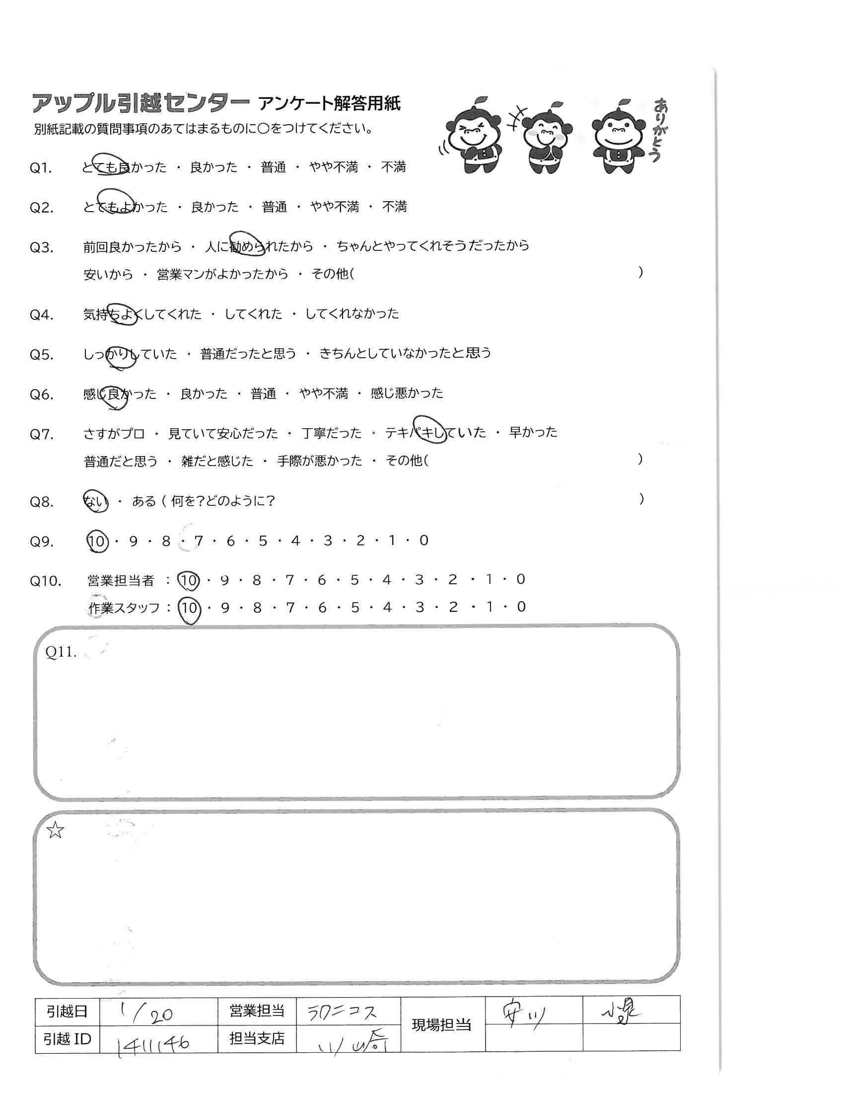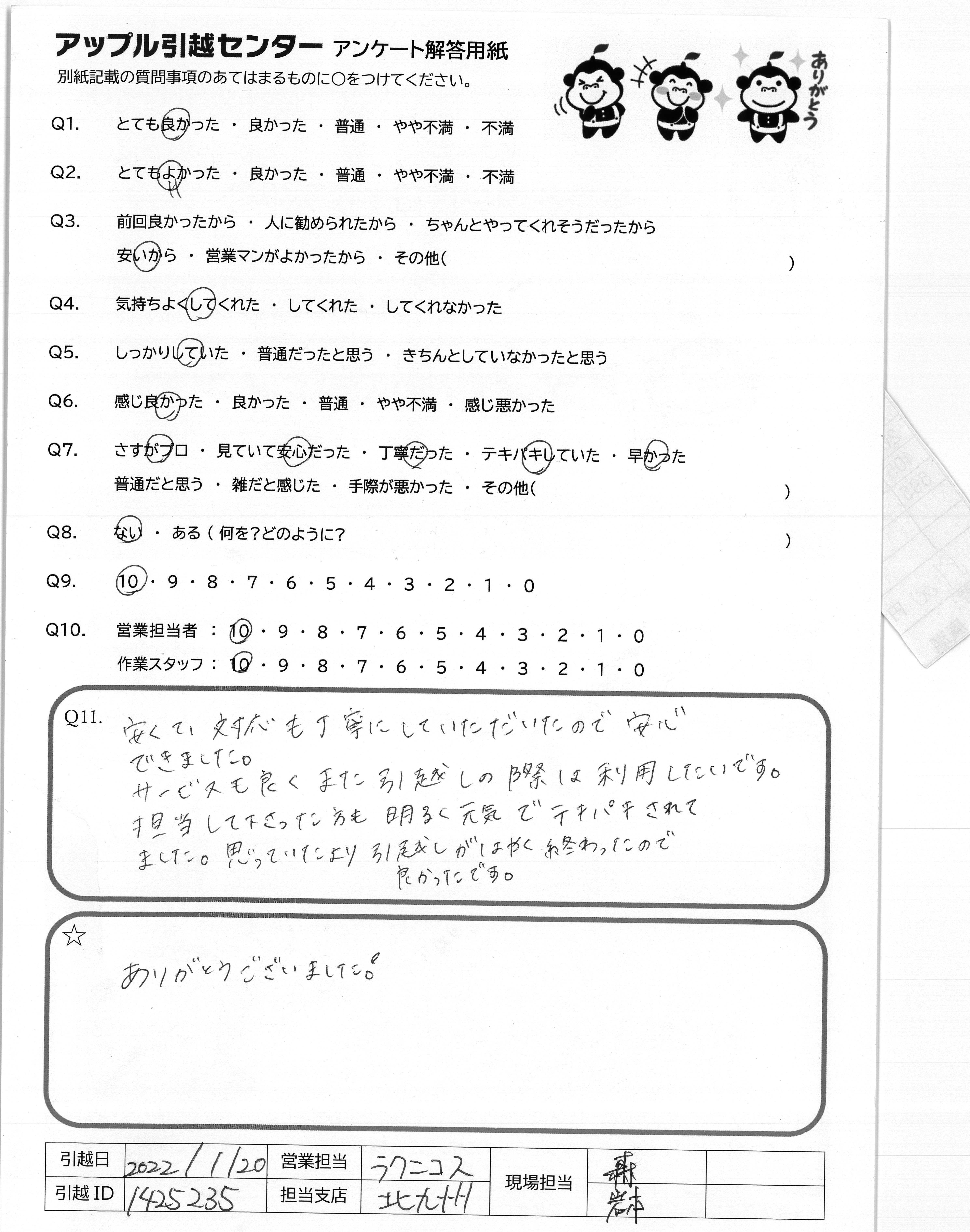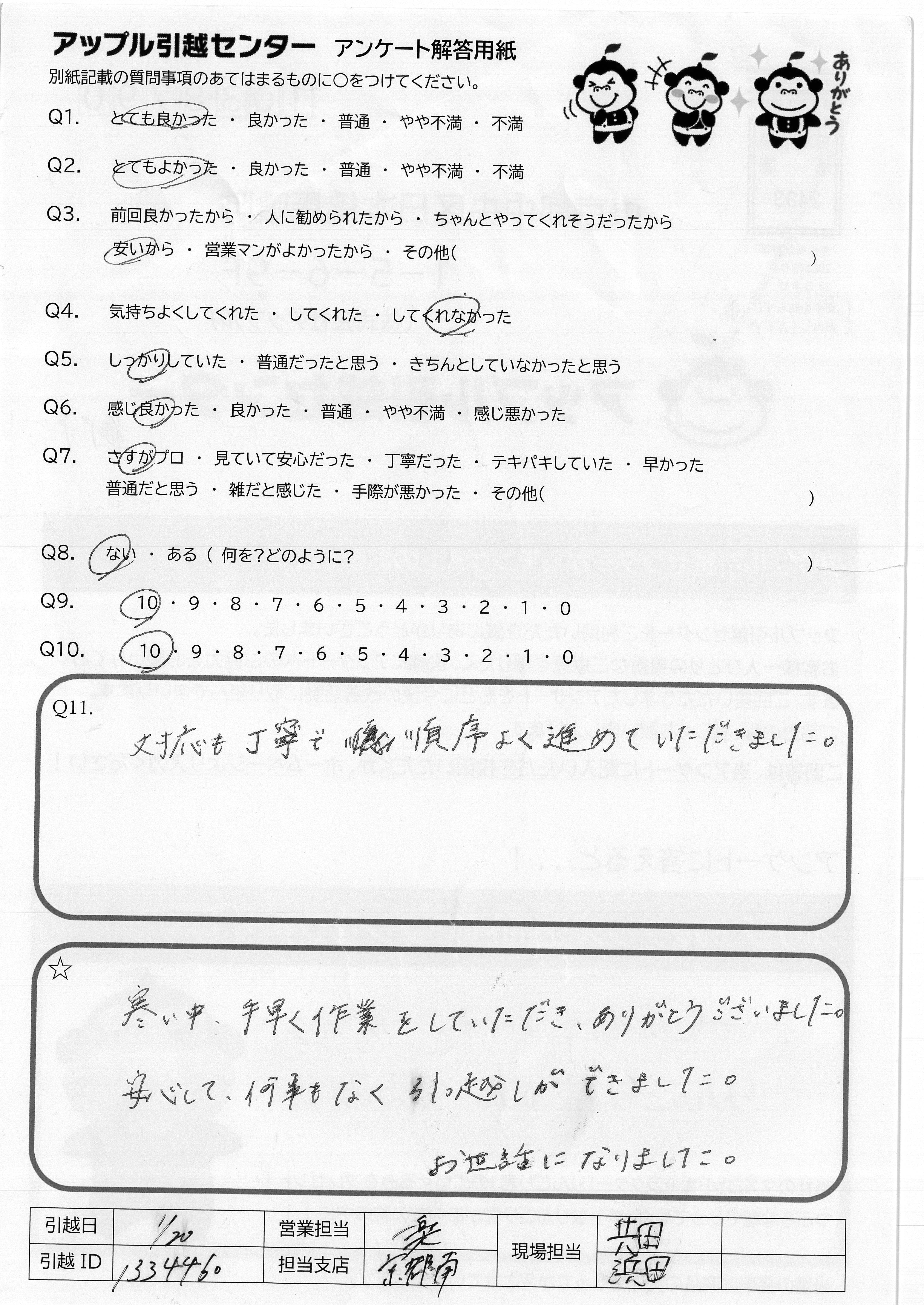 A.寒い中、手早く作業をしていただき、ありがとうございました。 安心して、何事もなく引っ越しができました。 お世話になりました。
