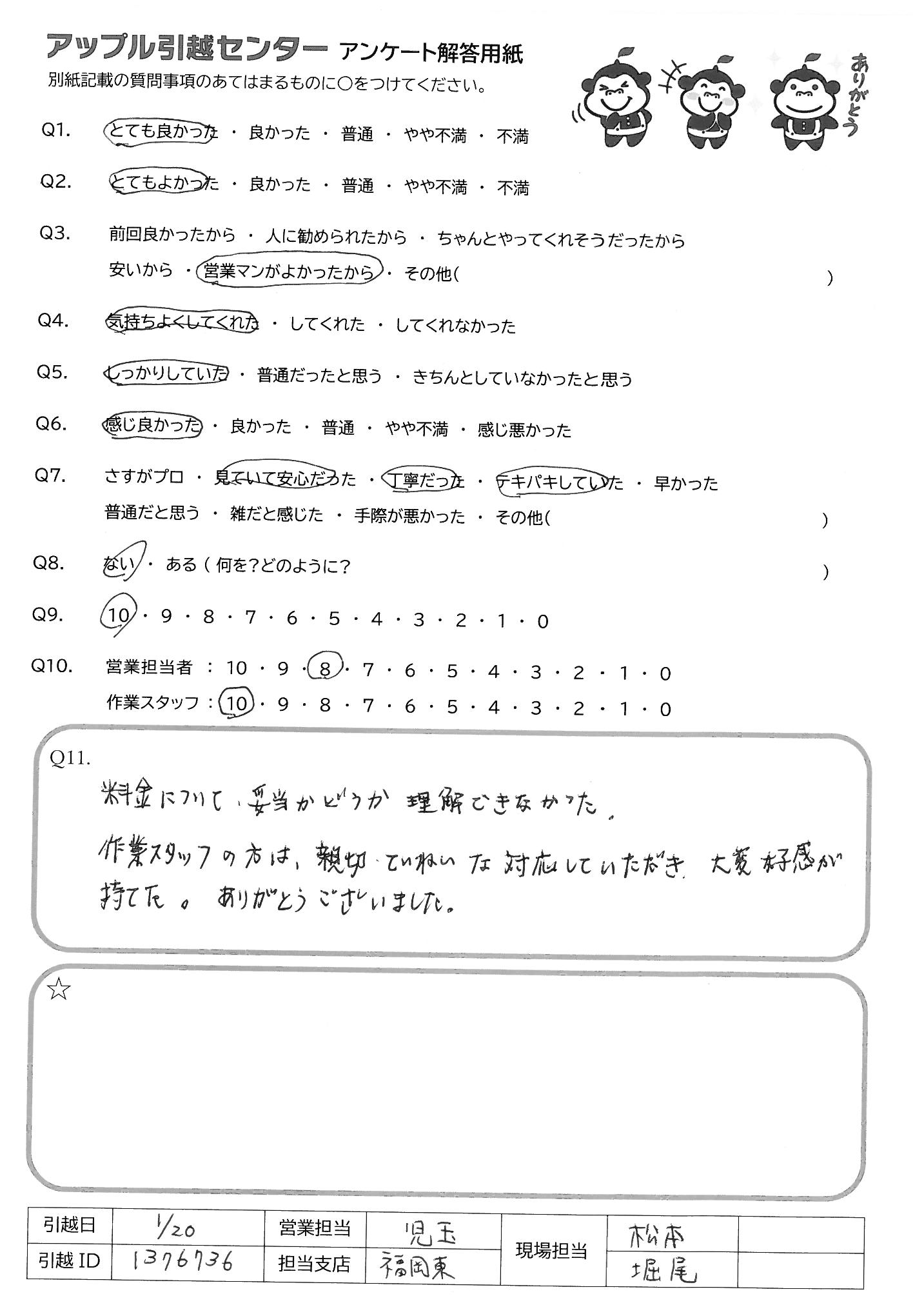 A.料金について、妥当かどうか理解できなかった。 作業スタッフの方は、親切、ていねいな対応していただき、大変好感が持てた。ありがとうございました。