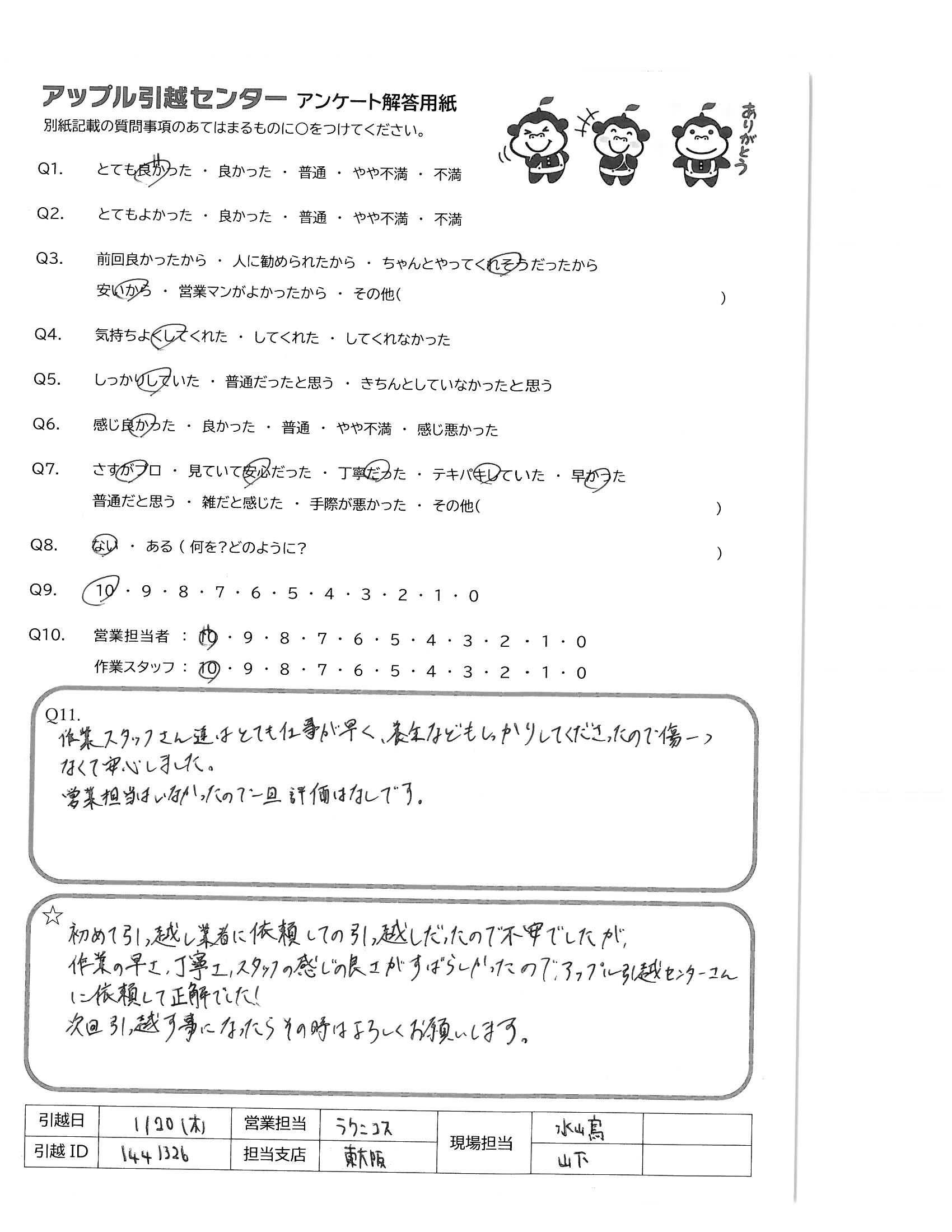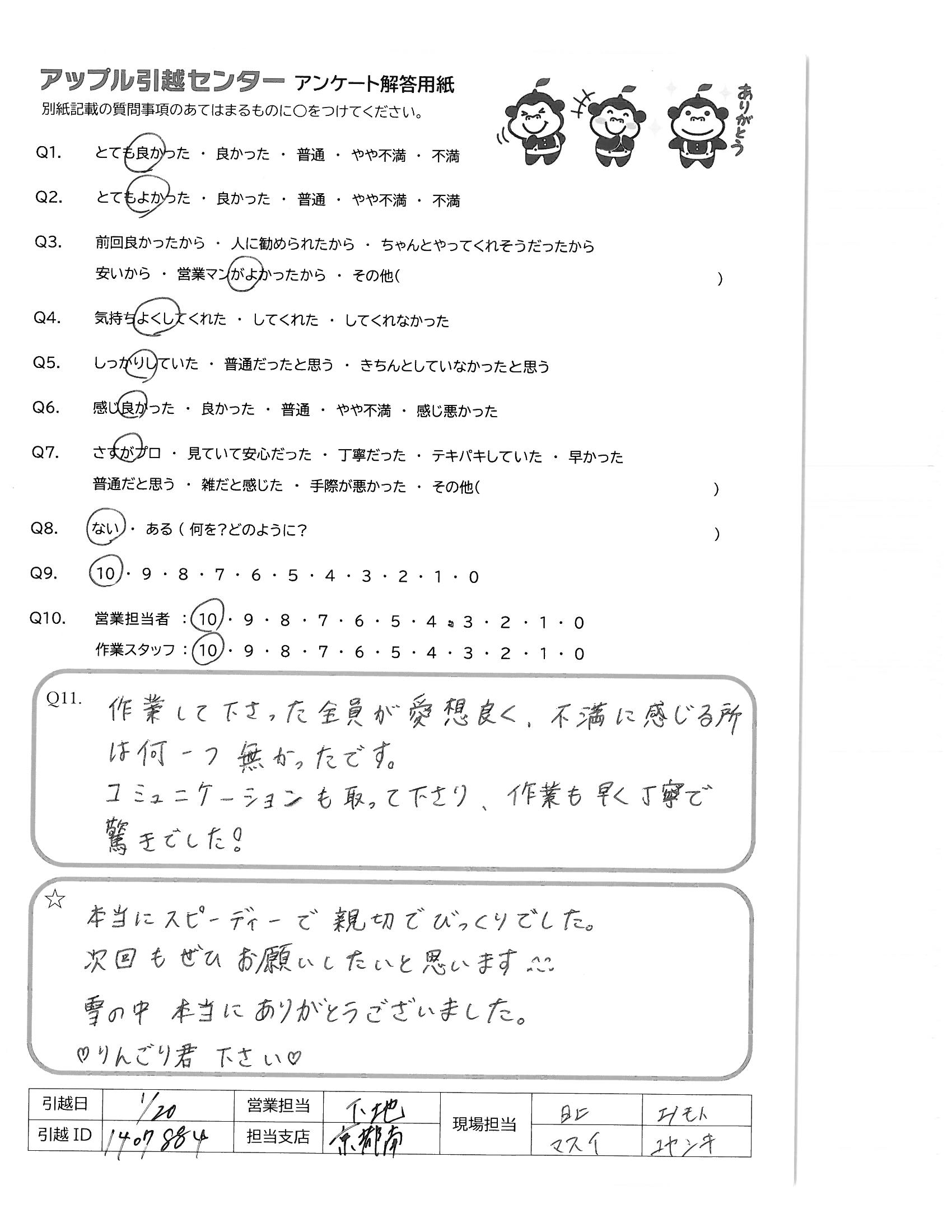 A.初めて引っ越し業者に依頼しての引っ越しだったので不安でしたが、作業の早さ、丁寧さ、スタッフの感じの良さがすばらしかったので、アップル引越センターさんに依頼して正解でした!次回引っ越す事になったらその時はよろしくお願いします。