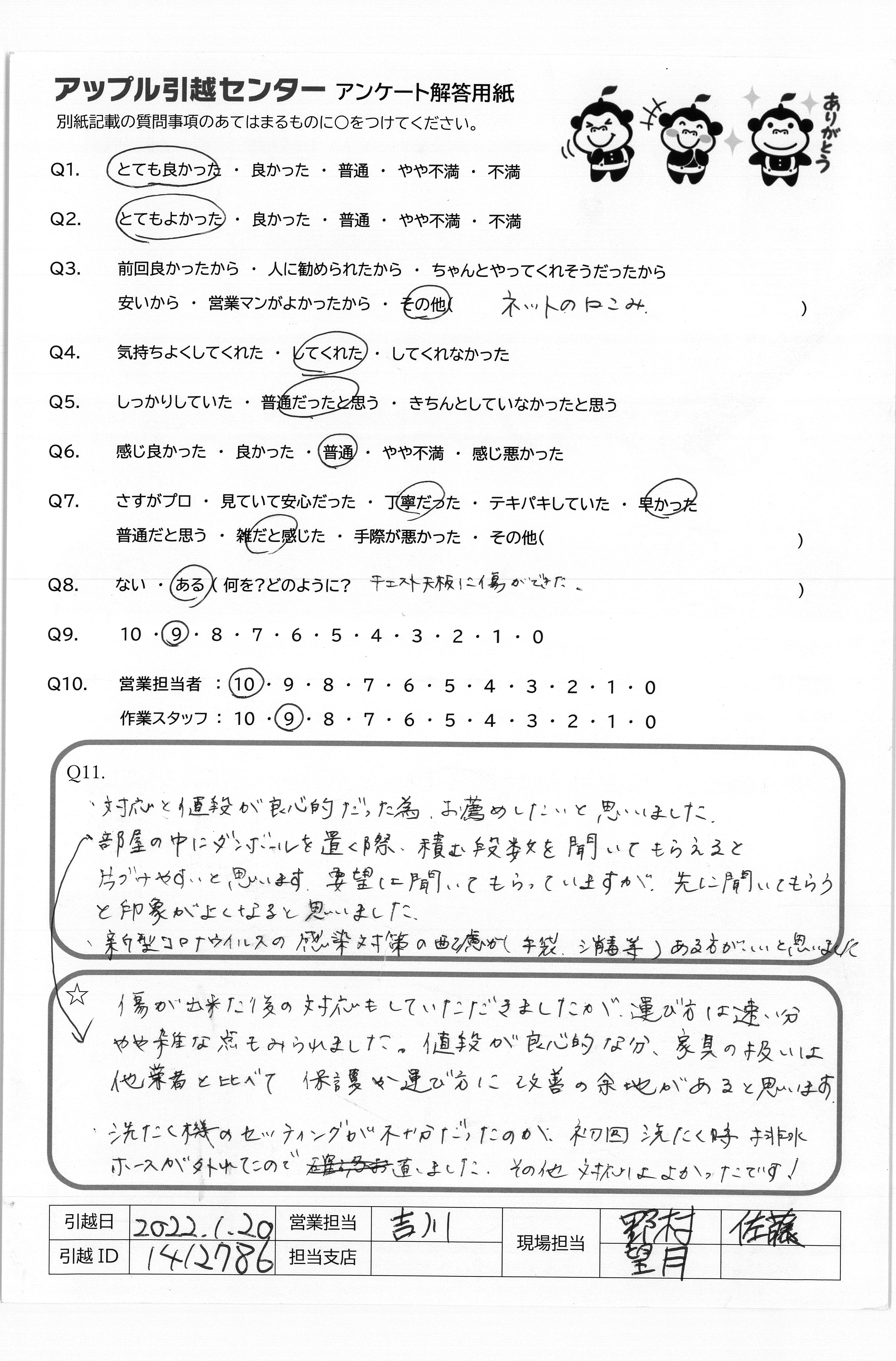 A.・対応と値段が良心的だった為、お薦めしたいとお澪ました。 部屋の中にダンボールを置く際、積む段数を聞いてもらえると片づけやすいと思います。要望は聞いてもらっていますが、先に聞いてもらうと印象がよくなると思いました。 ・新型コロナウイルスの感染対策の配慮が(手袋、消毒等)ある方がいいと思いました。
