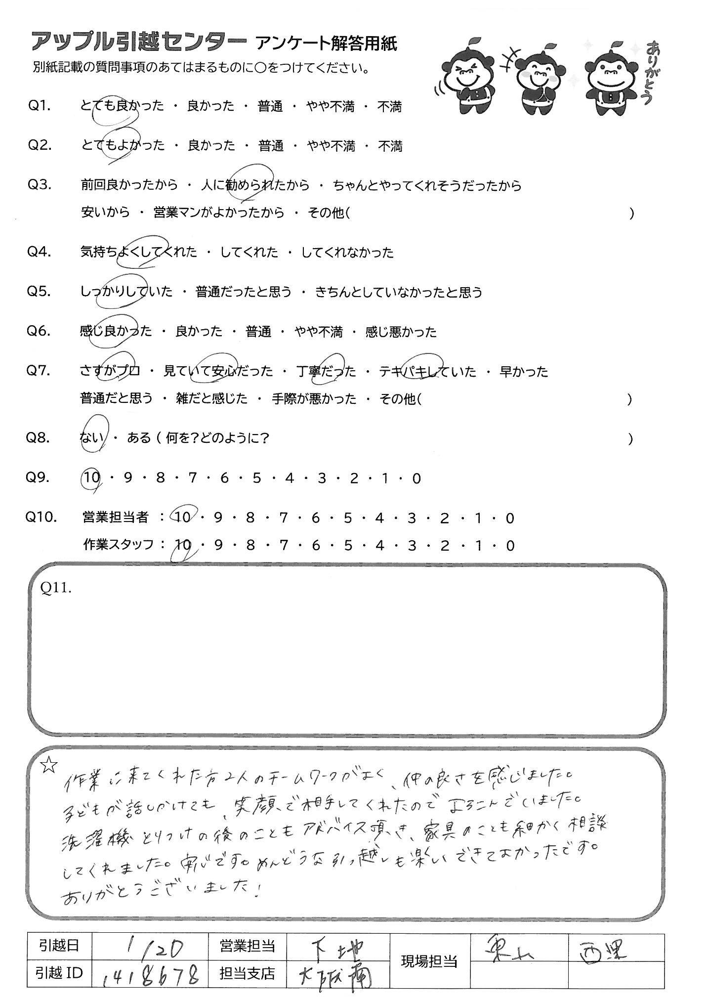 A.作業に来てくれた方2人のチームワークがよく、仲の良さを感じました。 子どもが話しかけても、笑顔で相手してくれたのでよろこんでいました。 洗濯機とりつけの後のこともアドバイス頂き、家具のことも細かく相談してくれました。安心です。めんどうな引っ越しも楽しくできてよかったです。 ありがとうございました!