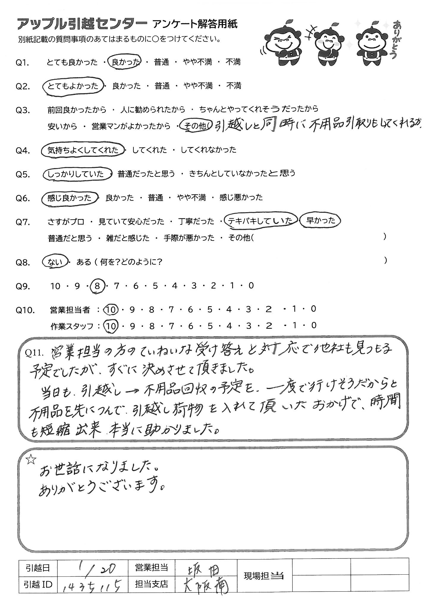 引越し日:2022年01月20日 エリア:大阪府大阪市都島区