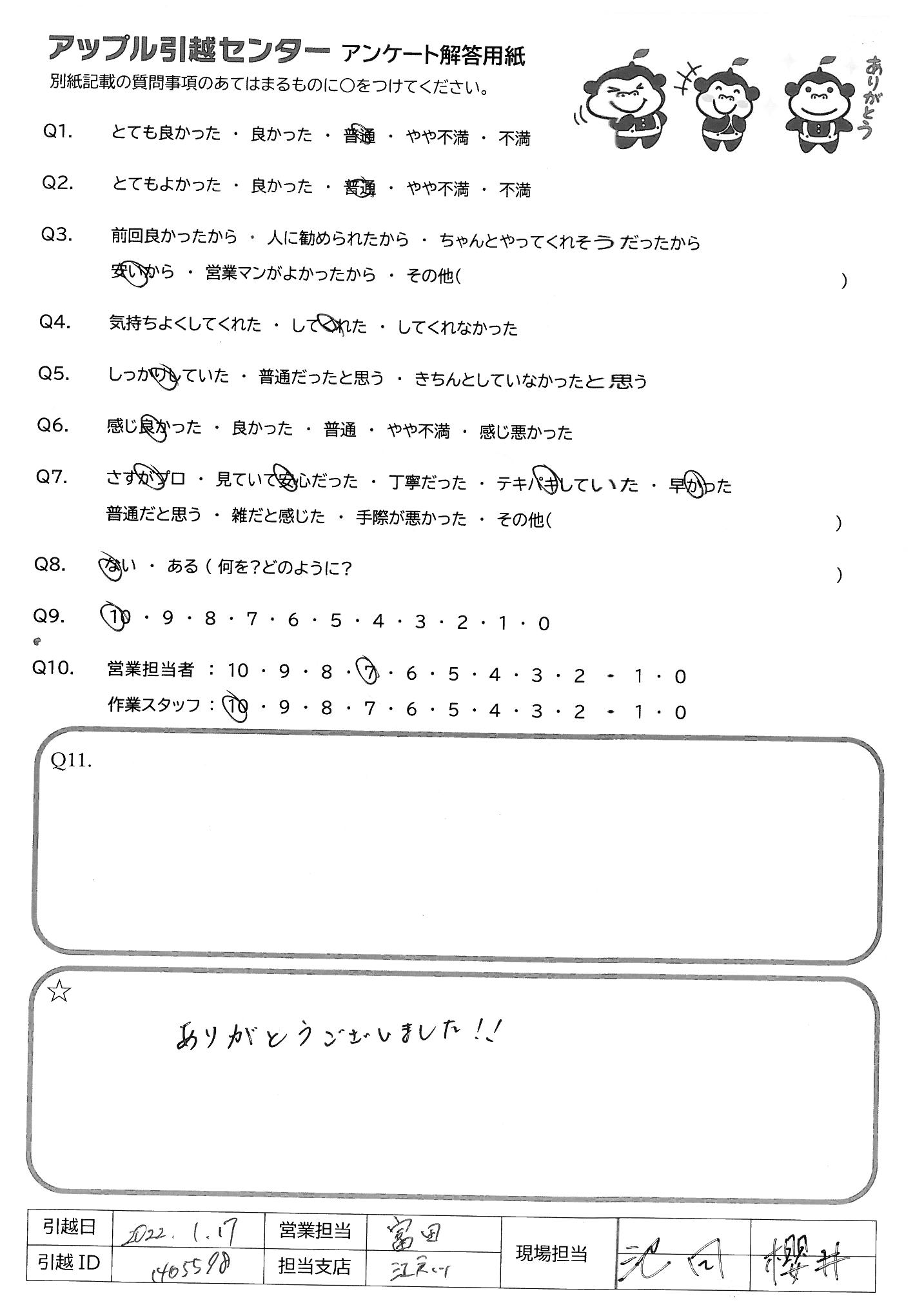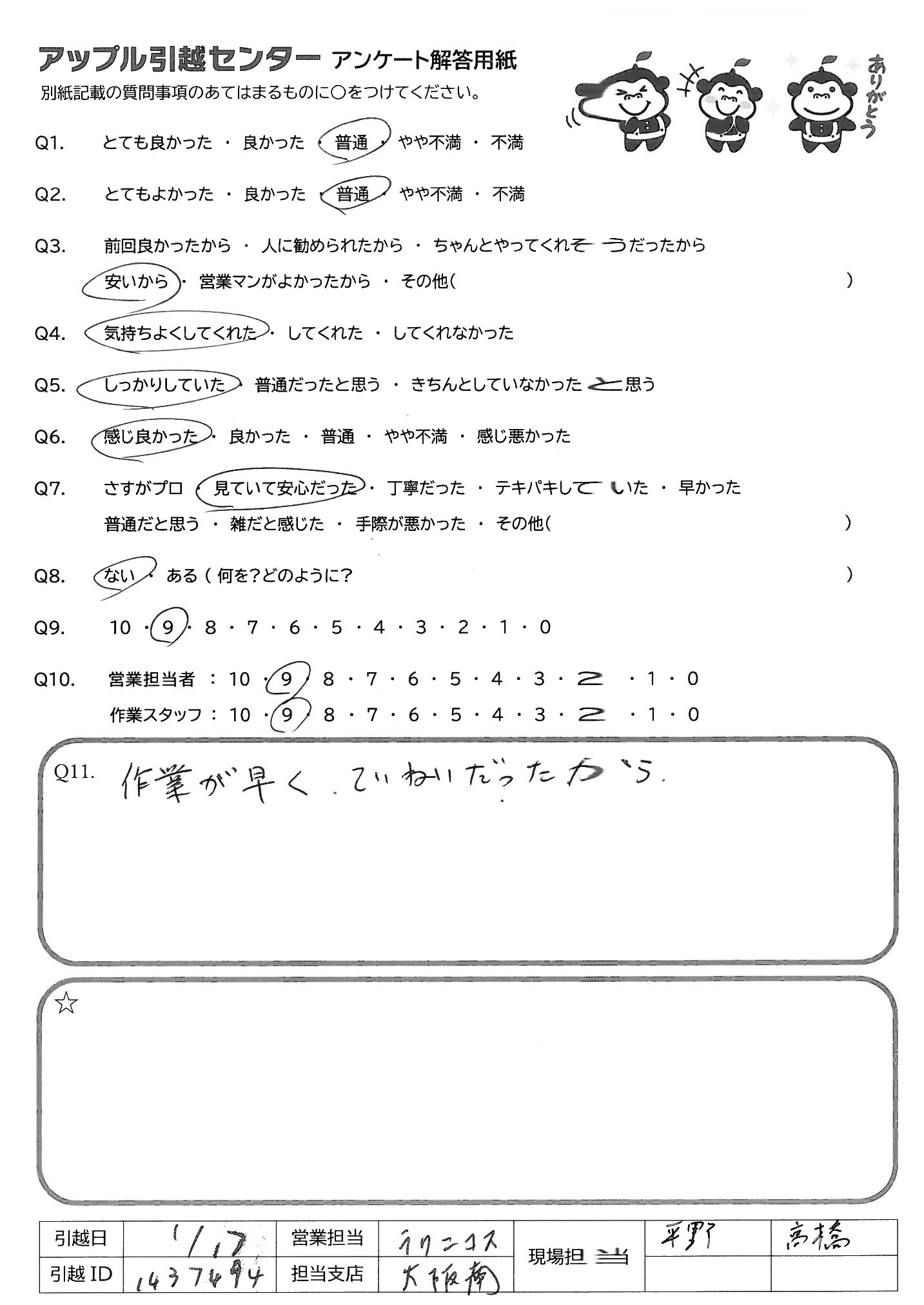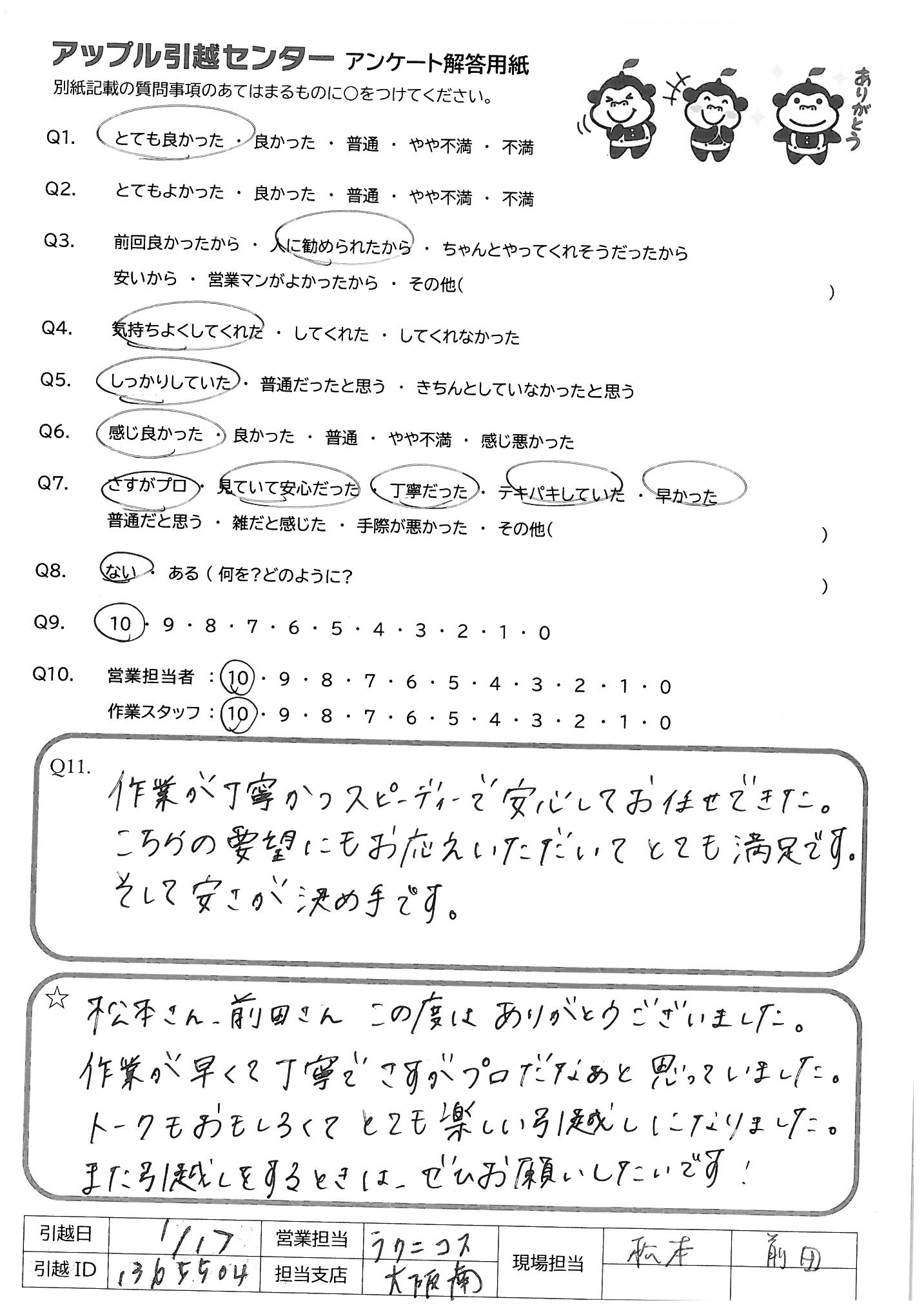 引越し日:2022年01月17日 エリア:大阪府大阪市生野区