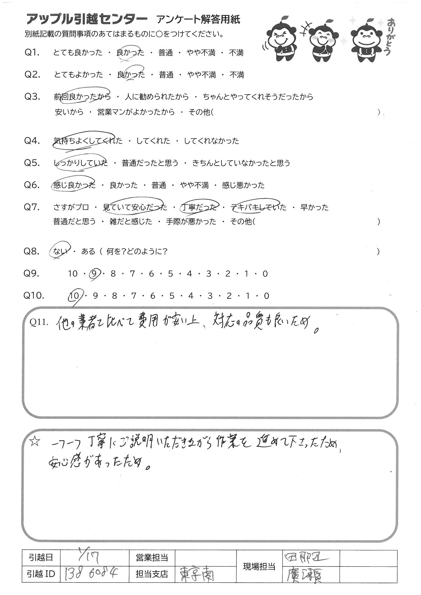 A.見積りの時から他社と比べ丁寧で明確な料金が分かり、人数や時間もすぐご提案頂きまた安かったです。 ありがとうございました。