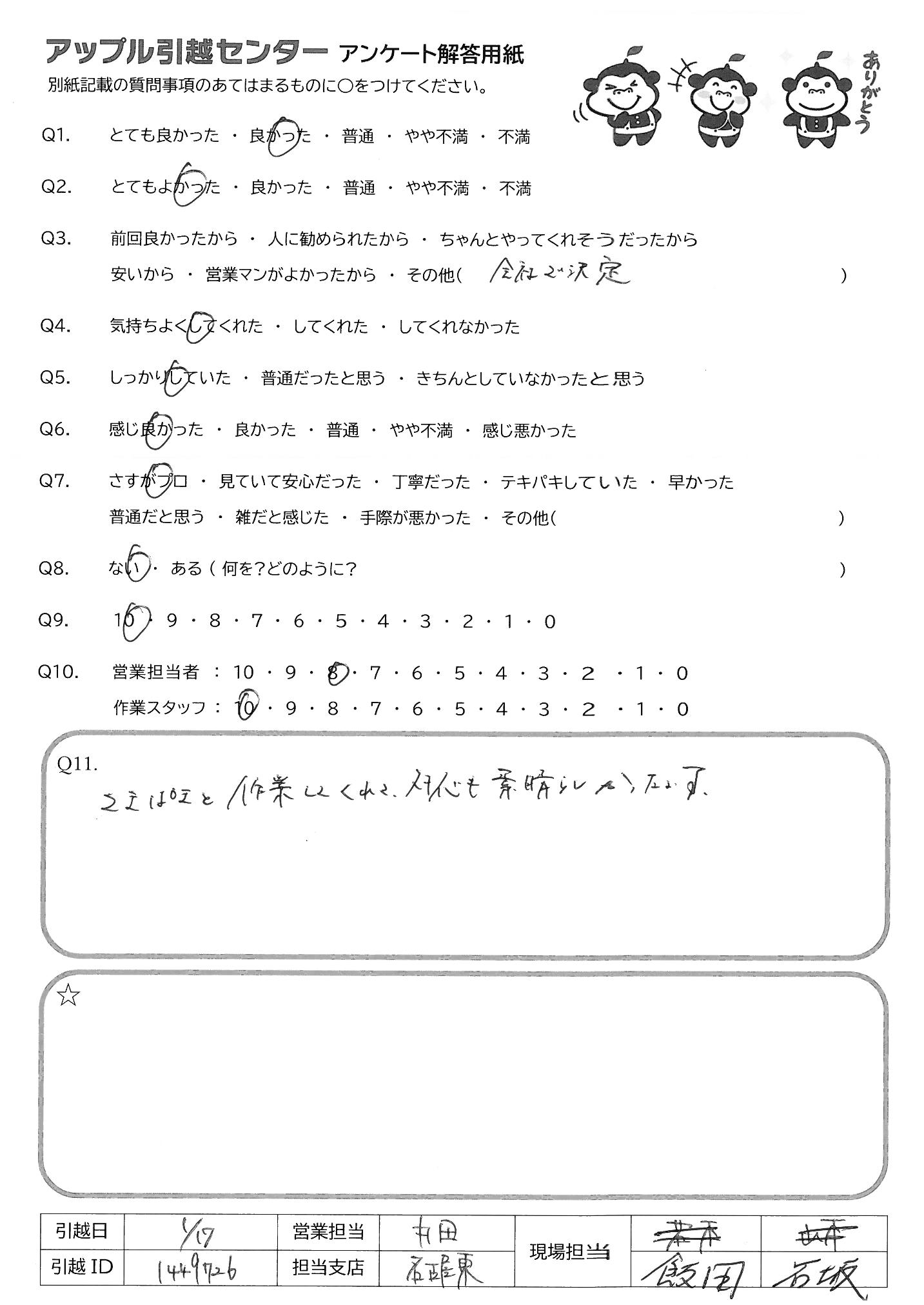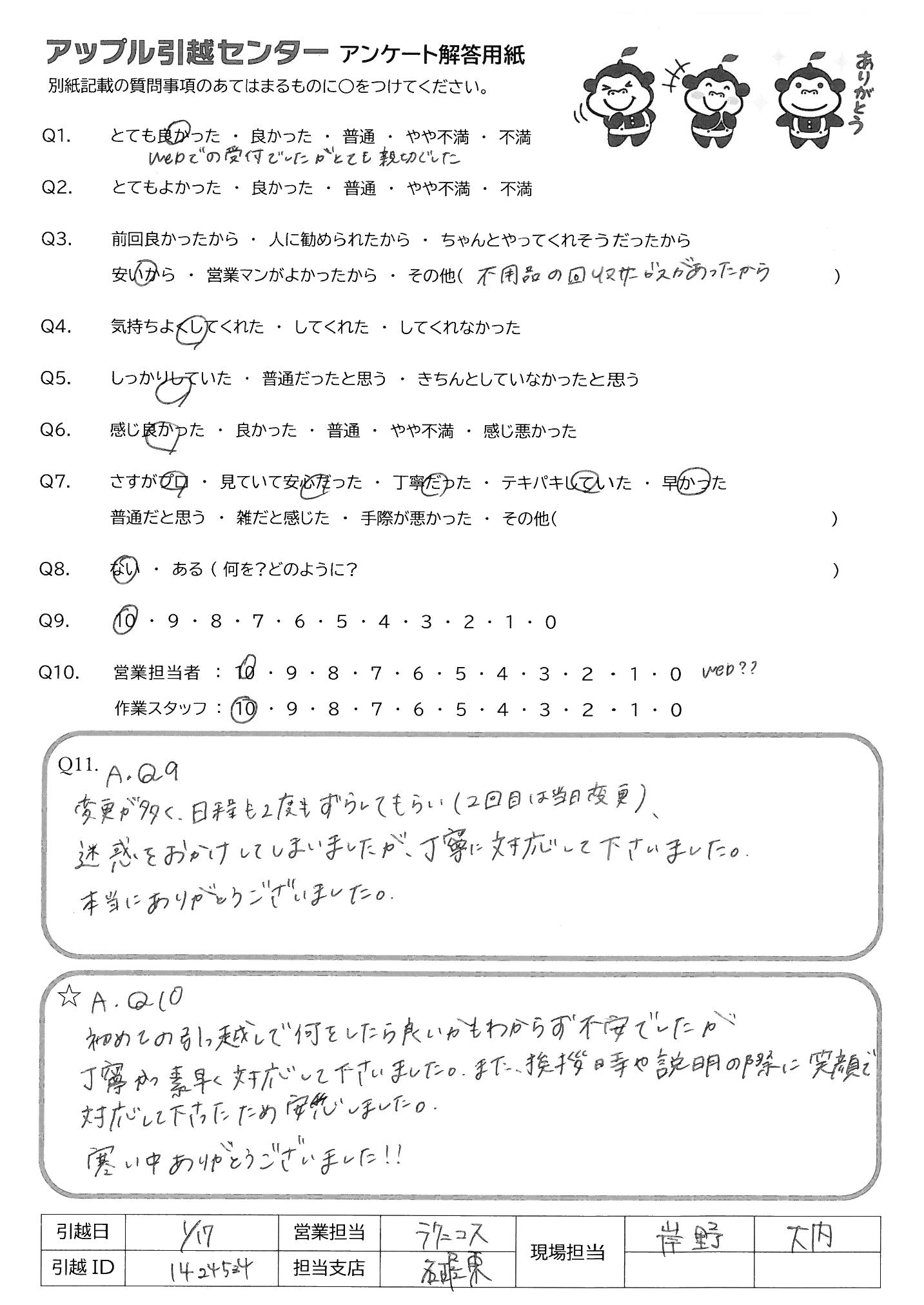 A.A.Q10 初めての引っ越しで何をしたら良いかもわからず不安でしたが 丁寧かつ素早く対応して下さいました。また、挨拶時や説明の際に笑顔で対応して下さったため、安心しました。 寒い中ありがとうございました!!
