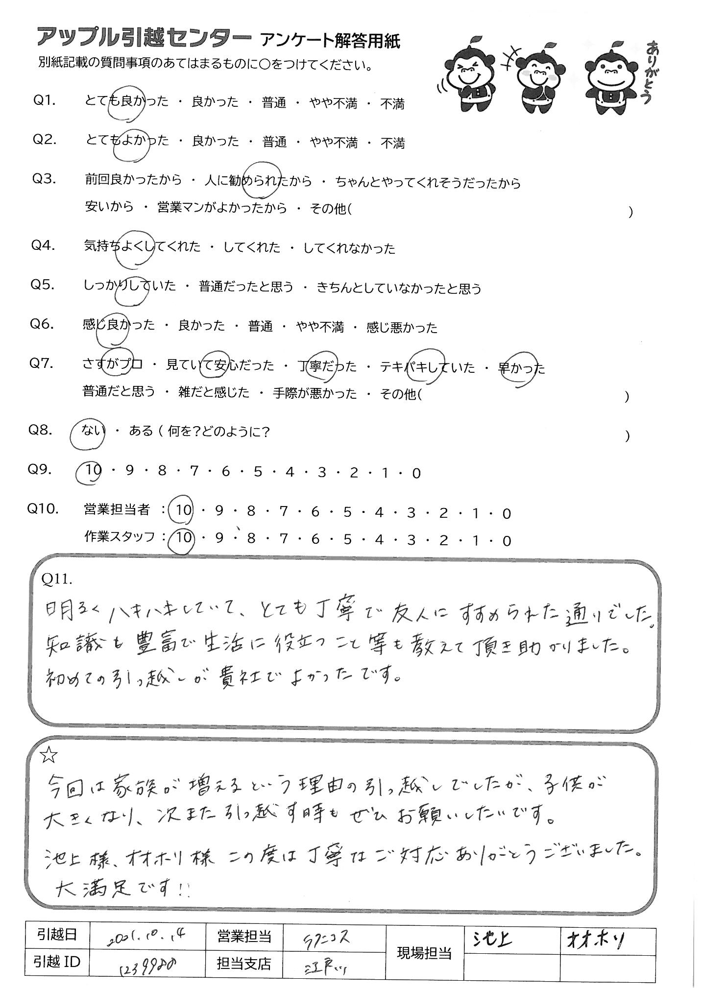 A.今回は家族が増えるという理由の引っ越しでしたが、子供が大きくなり、次また引っ越す時もぜひお願いしたいです。 池上様、オオホリ様この度は丁寧なご対応ありがとうございました。 大満足です!!