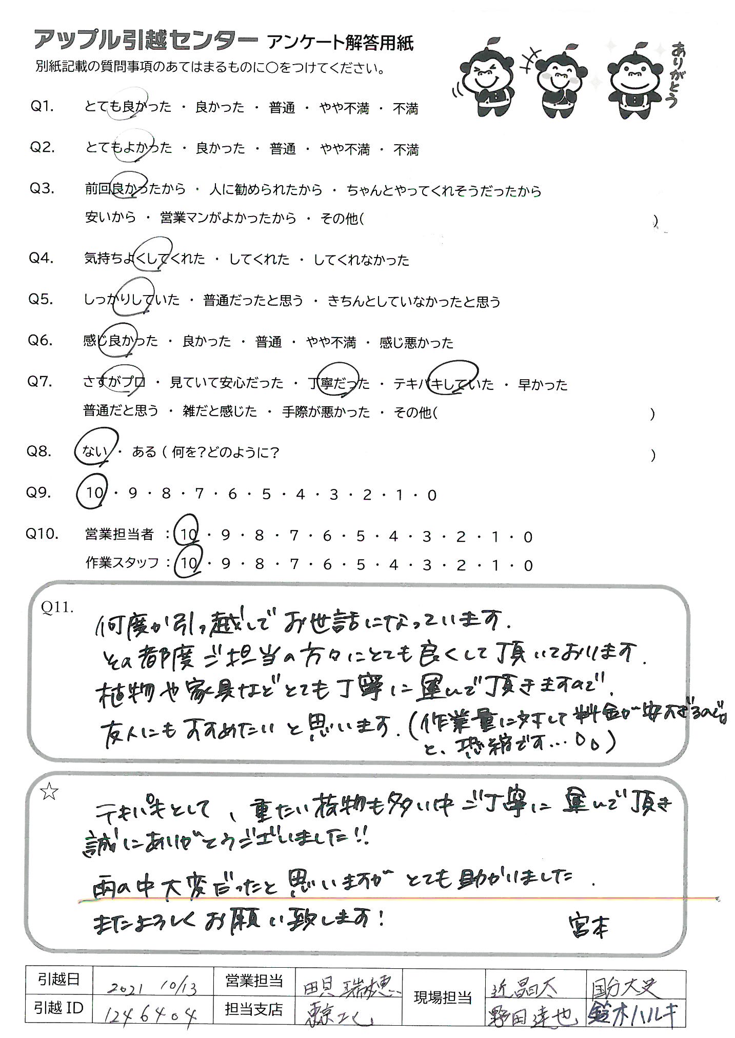 A.テキパキとして、重たい荷物も多い中ご丁寧に運んで頂き誠にありがとうございました!! 雨の中大変だったと思いますがとても助かりました。 またよろしくお願い致します! 宮本
