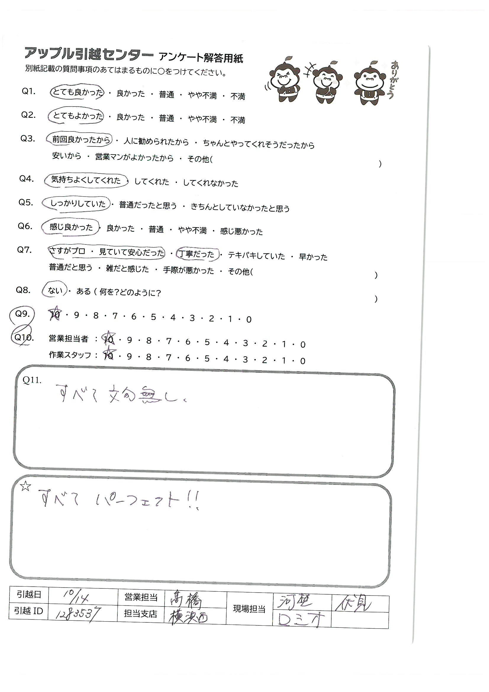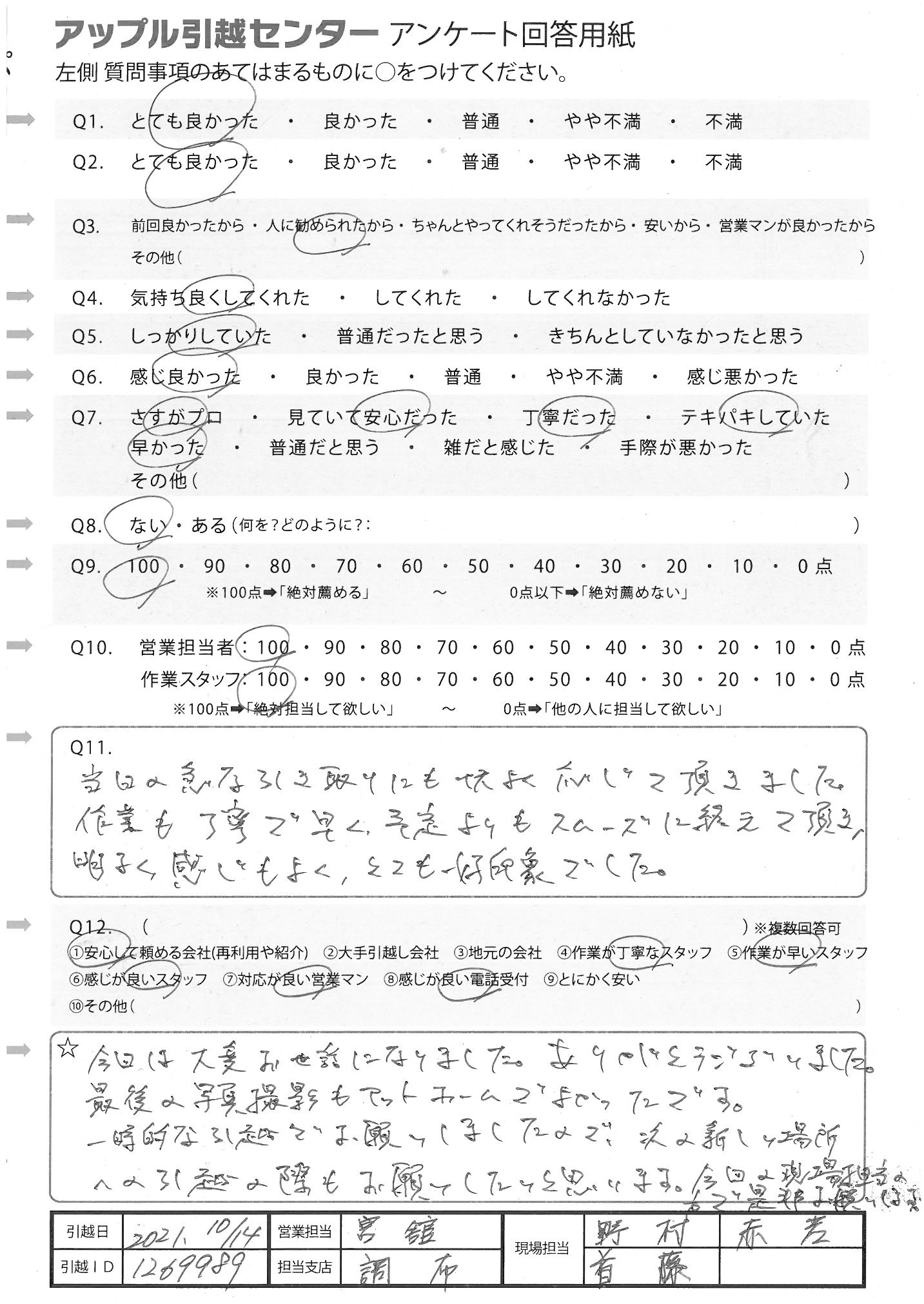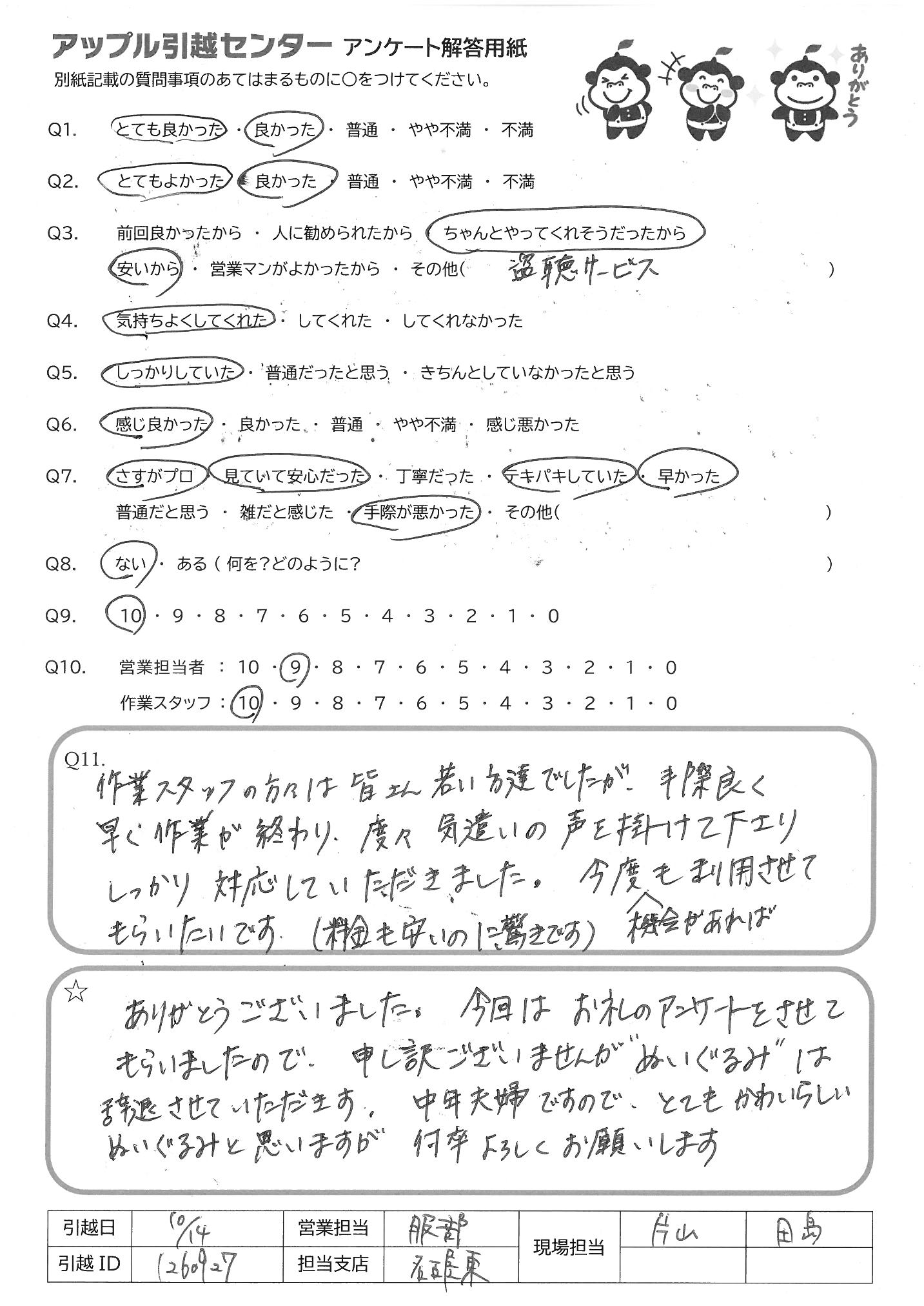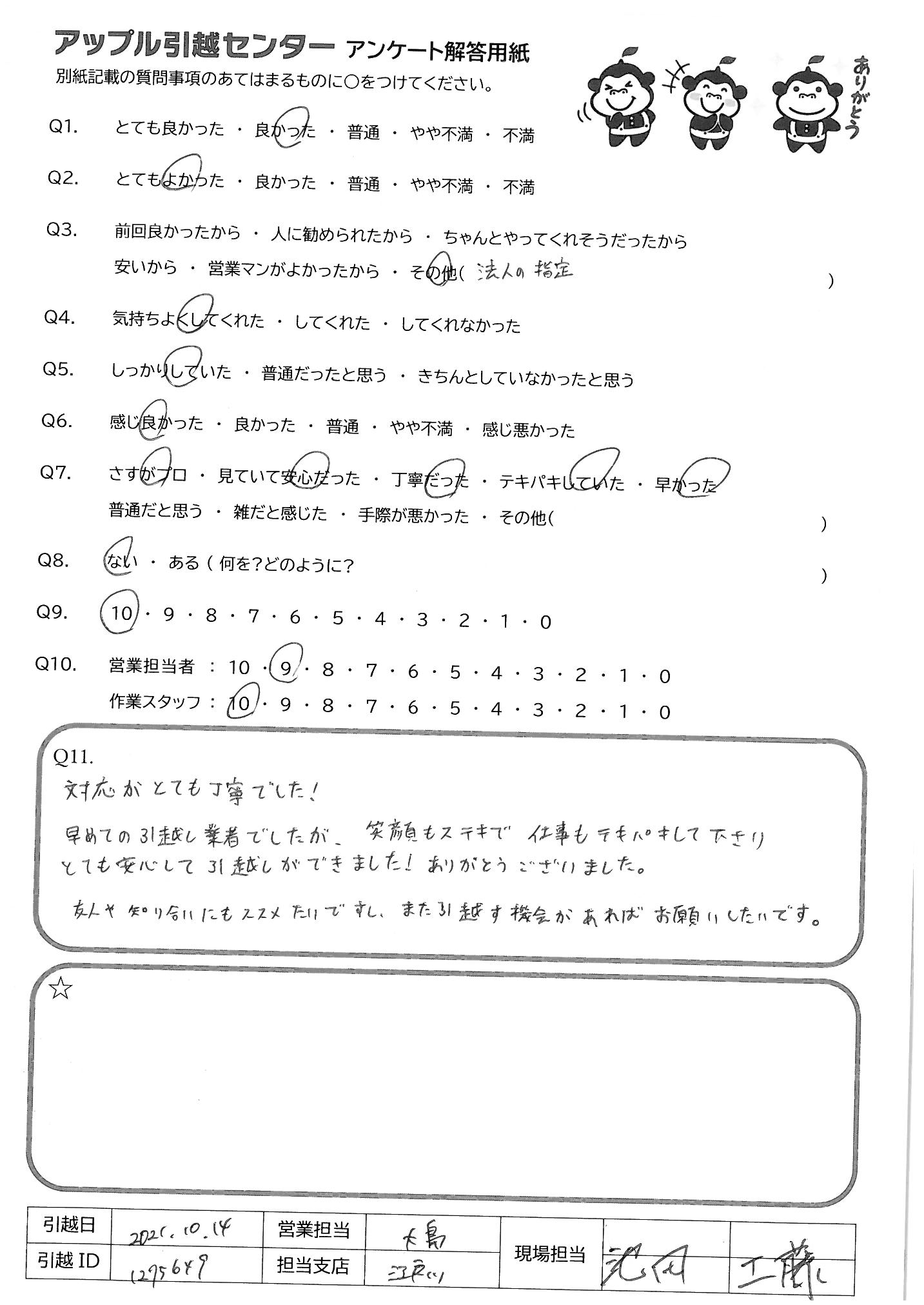 A.今回は大変お世話になりました。ありがとうございました。最後の写真撮影もアットホームでよかったです。一時的な引越でお願いしましたので、次の新しい場所への引越の際もお願いしたいと思います。今回の現場担当の是非お願いします。