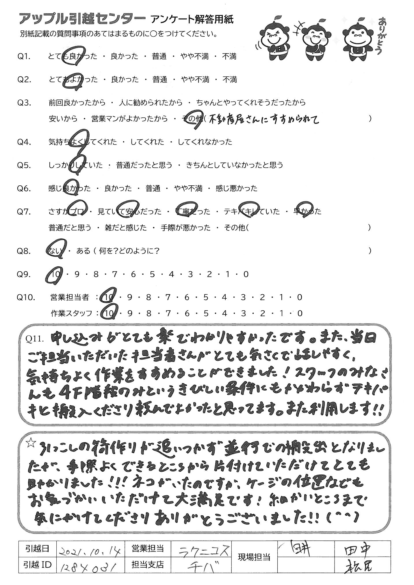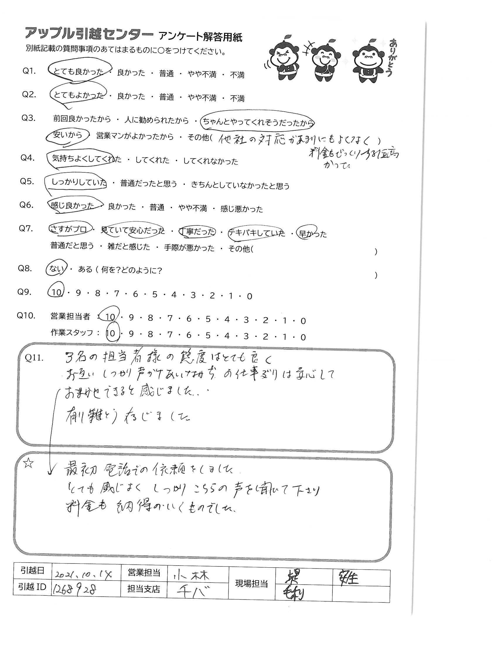 引越し日:2021年10月14日 エリア:千葉県千葉市若葉区