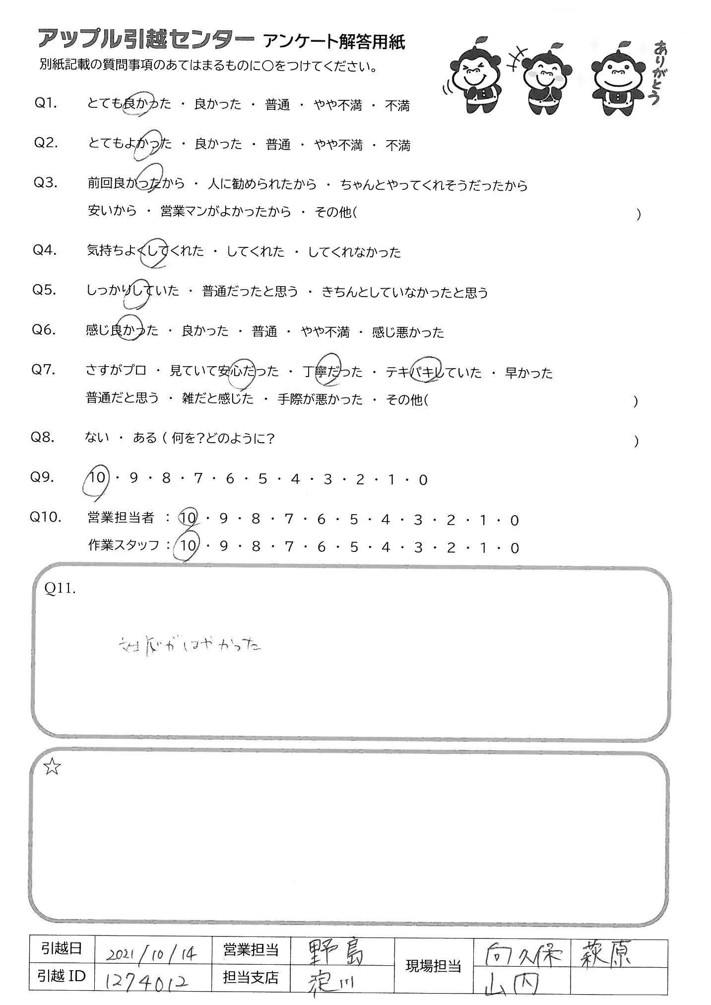 A.引っこしの荷作りが追いつかず並行での搬出となりましたが、手際よくできるところから片付けていただけてとても助かりました!!!ネコがいたのですが、ケージの位置などもお気づかいいただけて大満足です!細かいところまで気にかけてくださりありがとうございました!!