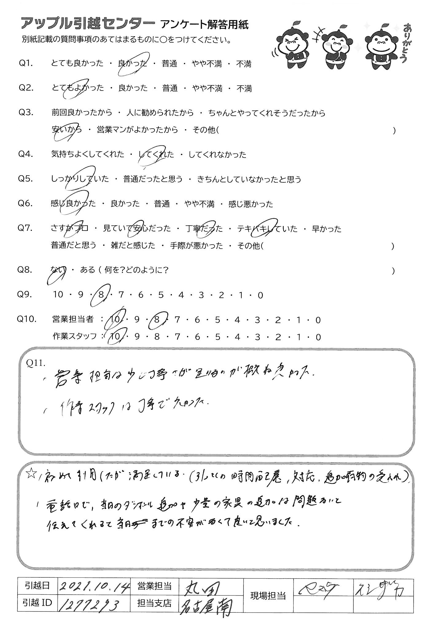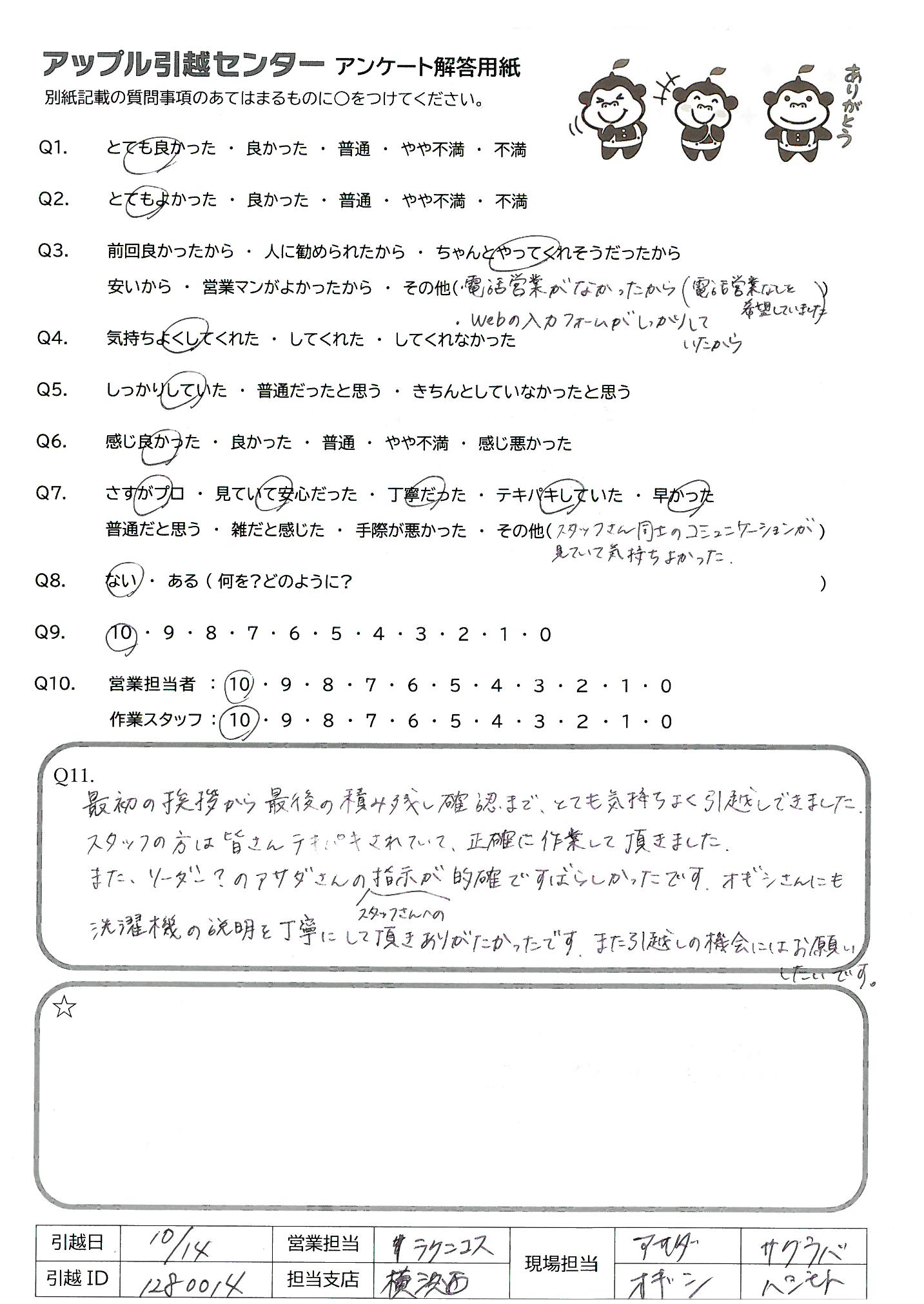 A.最初の挨拶から最後の積み残し確認まで、とても気持ちよく引越しできました。 スタッフの方は皆さんテキパキされていて、正確に作業して頂きました。また、リーダー?のアサダさんのスタッフさんへの指示が的確ですばらしかったです。オギシさんにも洗濯機の説明を丁寧にして頂きありがたかったです。また引越しの機会にはお願いしたいです。