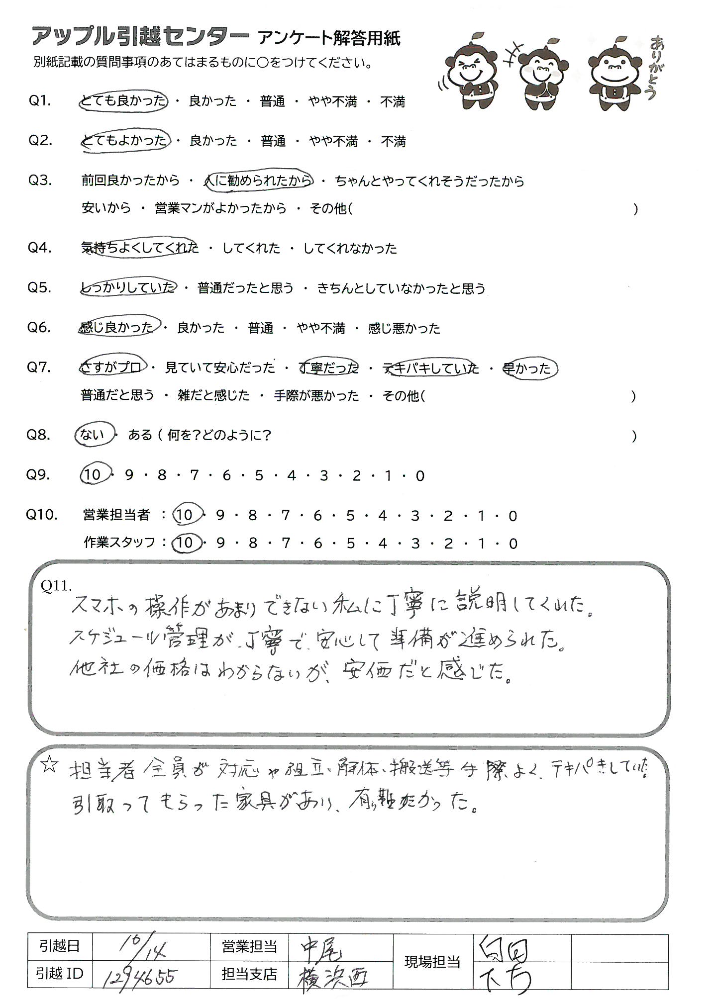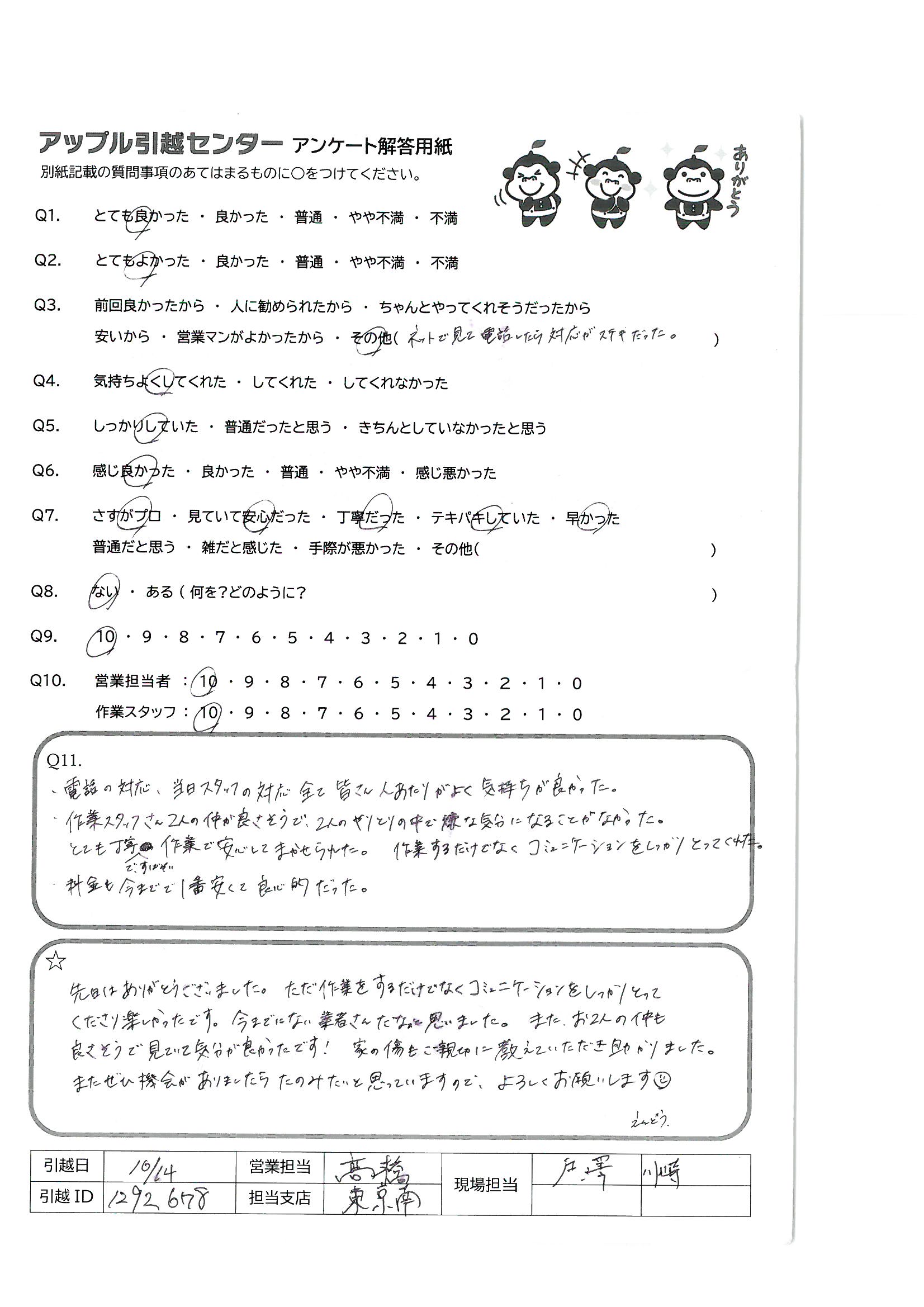 A.・電話の対応、当日スタッフの対応、全て皆さん人あたりがよく気持ちが良かった。 ・作業スタッフさん2人の仲が良さそうで、2人のやりとりの中で嫌な気分になることがなかった。 とても丁寧ですばやい作業で安心してまかせられた。作業するだけでなくコミュニケーションをしっかりとってくてた。 ・料金も今までで1番安くて良心的だった。