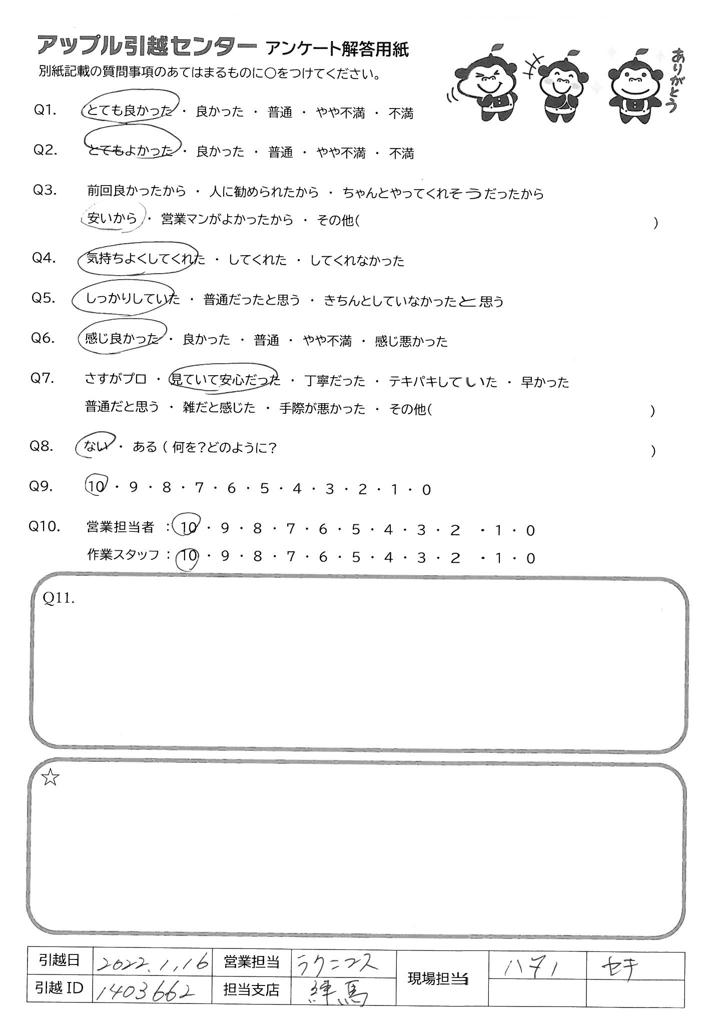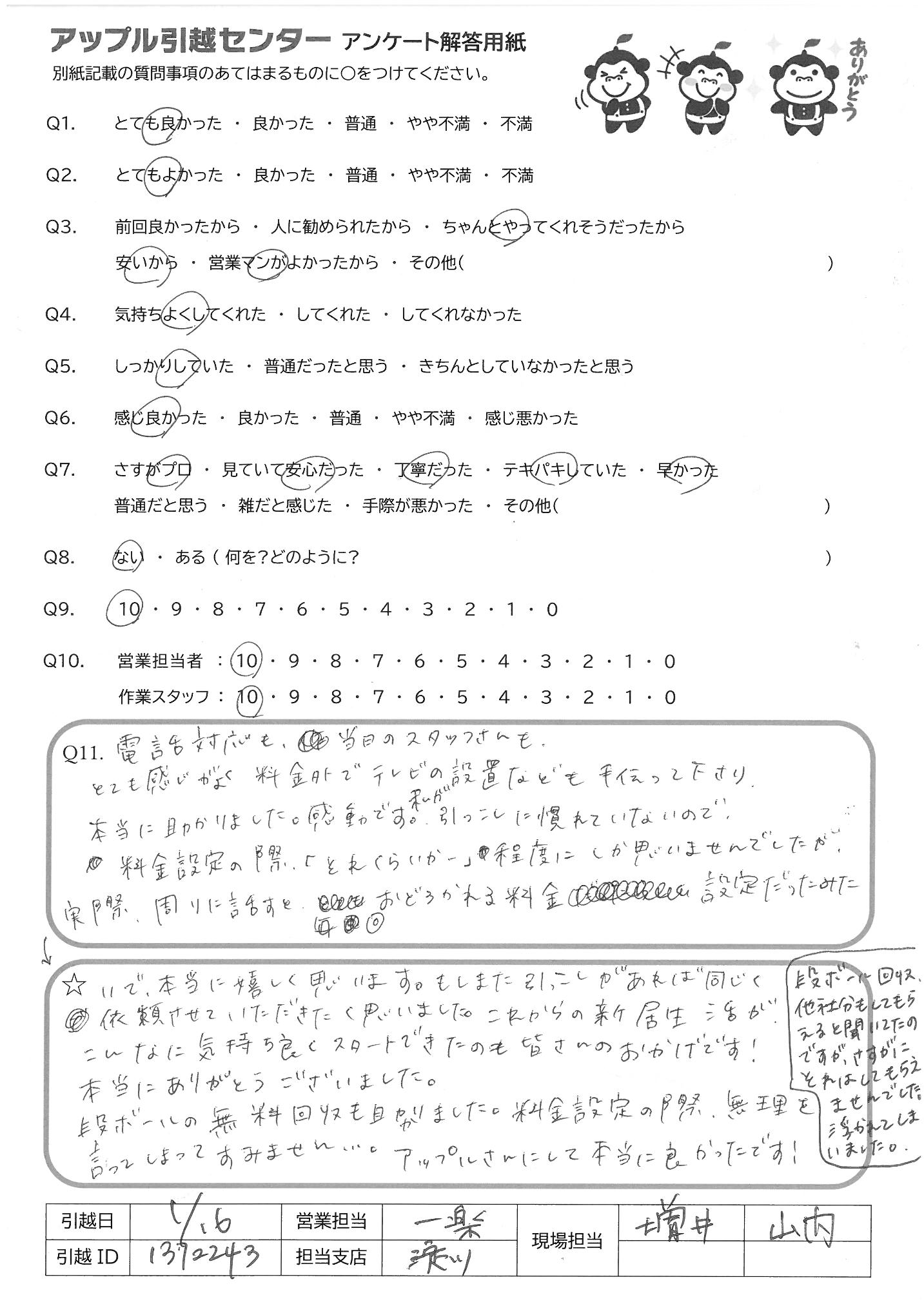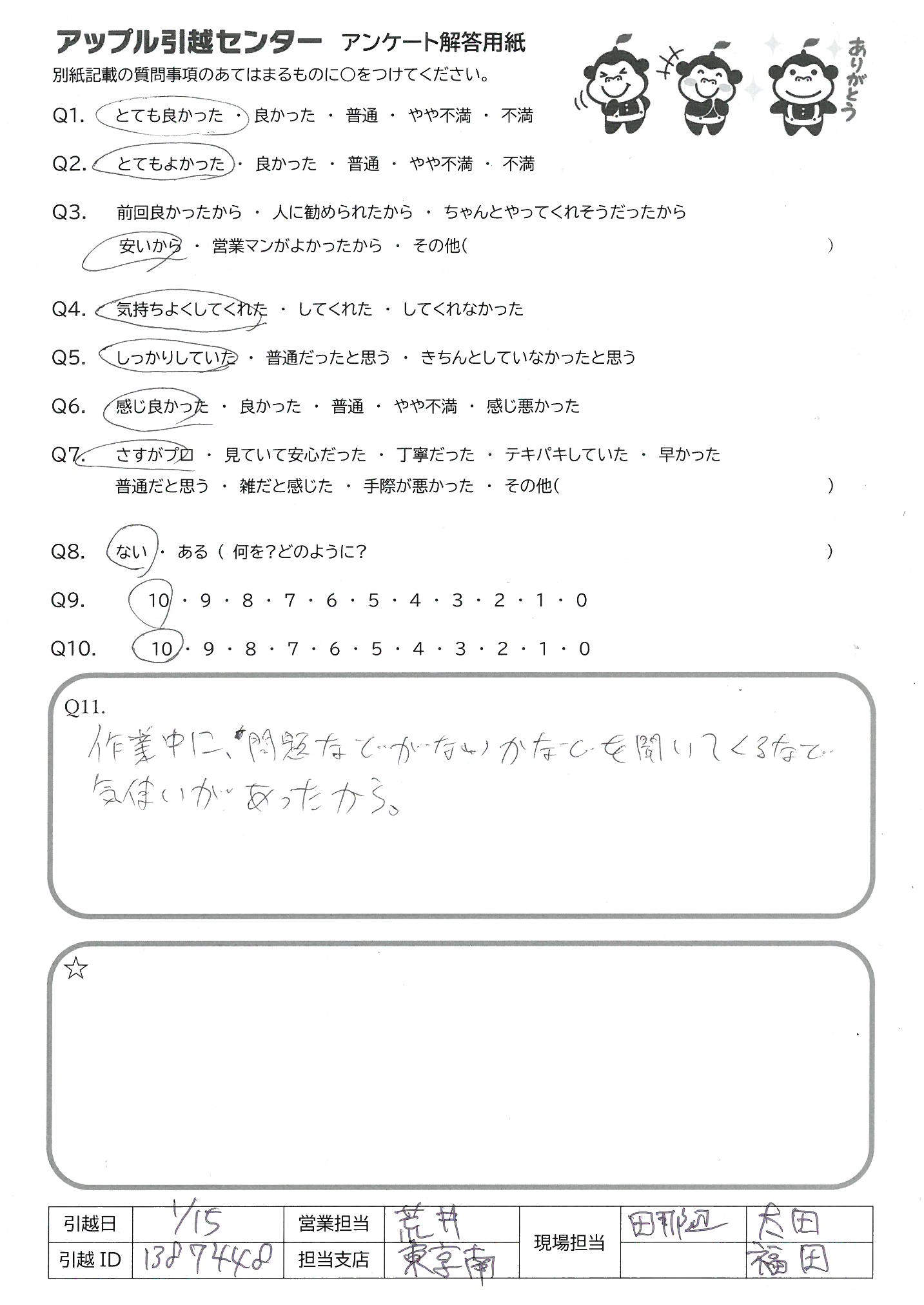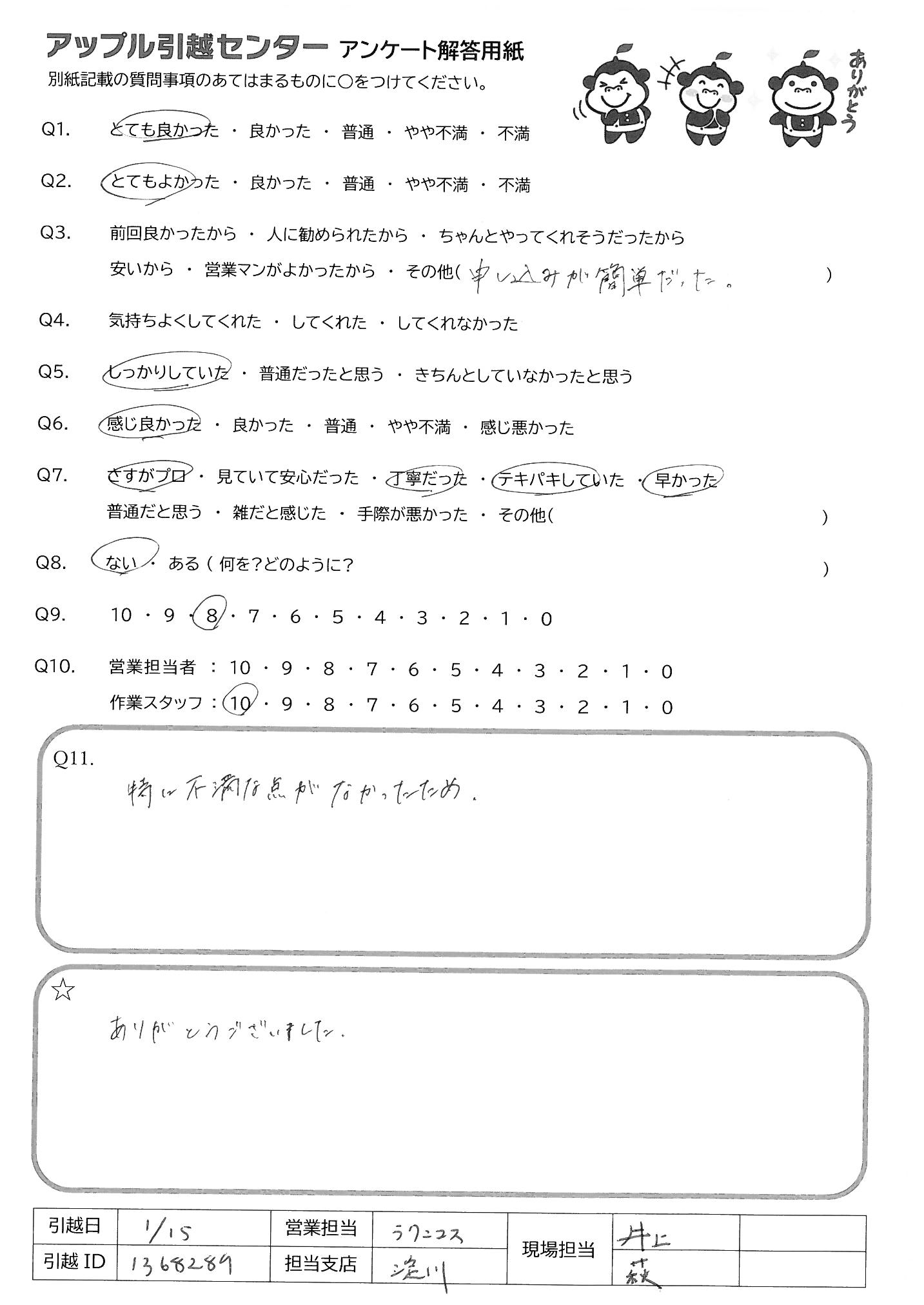 A.最初から最後までとても丁寧に対応いただきありがとうございました。事前の電話のやりとりも含め、全て安心してお任せすることができました。来年も引越しを予定していますが、またお願いしたいとおもいます。