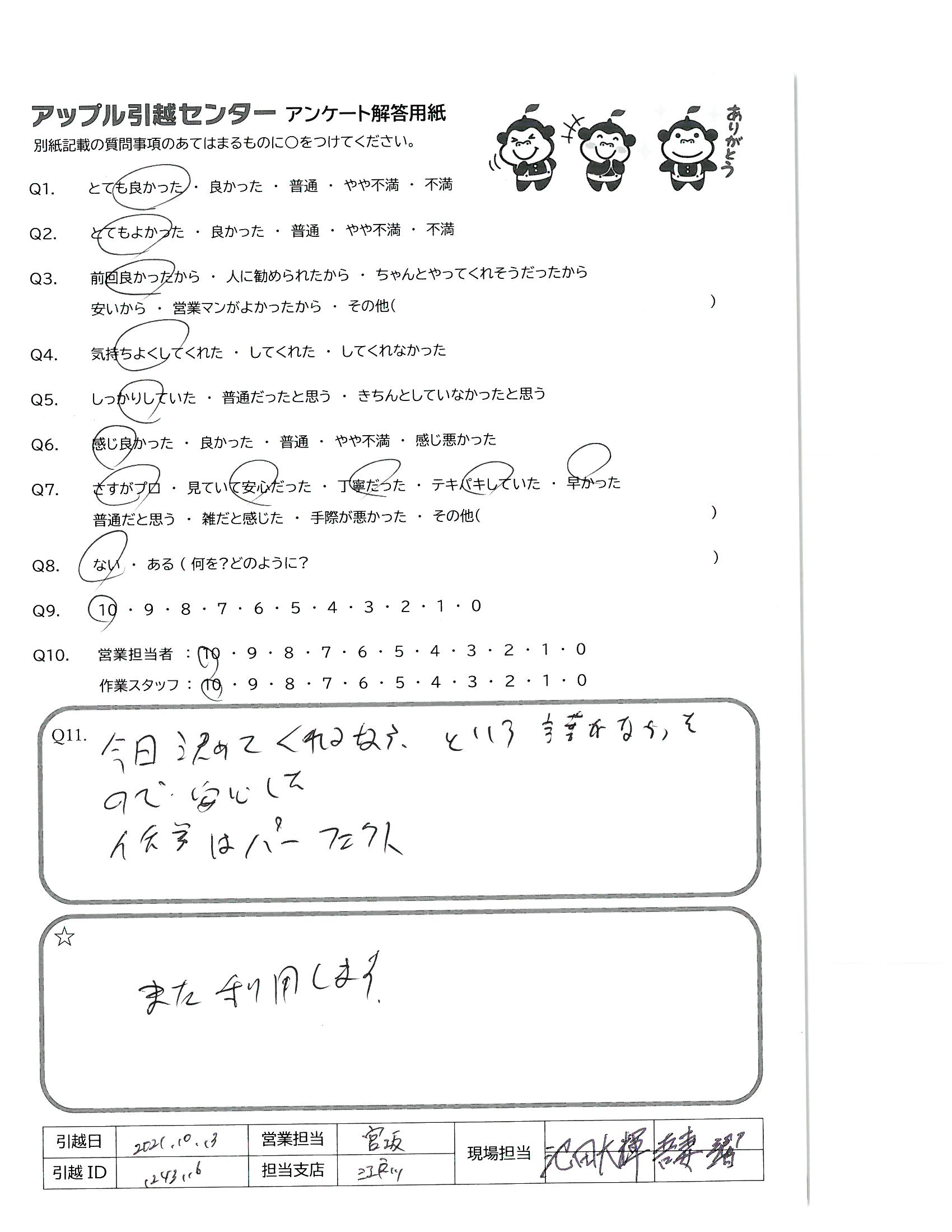 A.営 説明など分かりやすかった。 作 荷物を運ぶ時とても丁寧に運んでくれているように見えました。運ぶ前にぞうきんでふいて頂いたり、重たい物がある中、テキパキとされ早く終わって良かったです。 次に引っ越す時もお願いしたいと思いました。本当にありがとうございました。