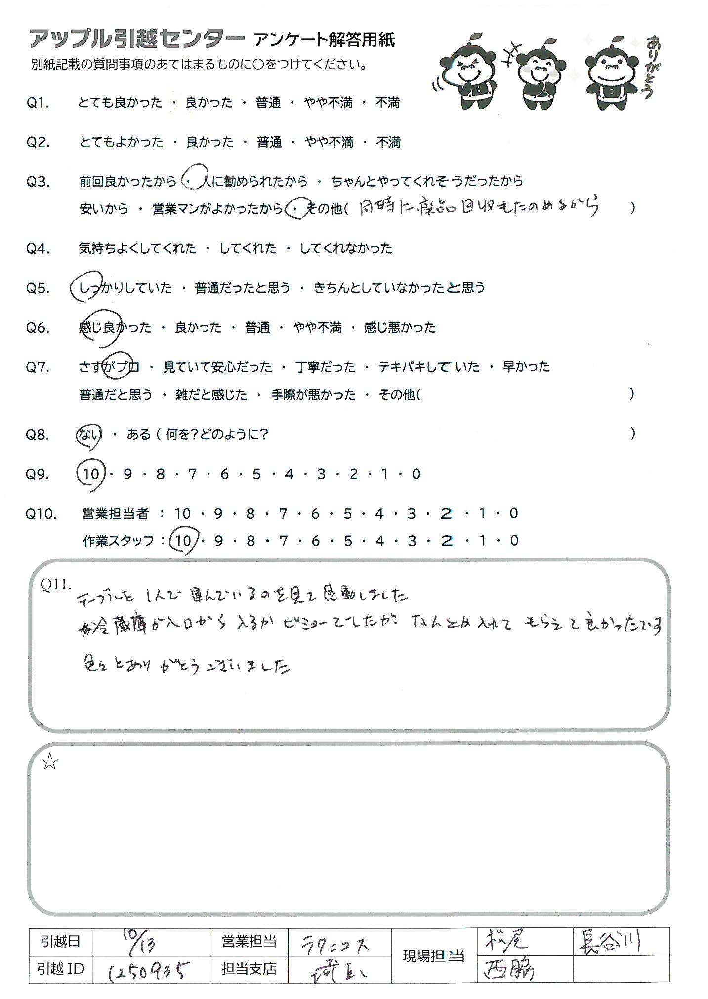 A.こちらの事情を考慮して頂いた上で、対応・運搬・作業内容等全てにおいて大満足でした。 知人に引越しを考えている人が居れば、是非増井さんと井上さんを紹介したいと思います。 本当にありがとうございました。