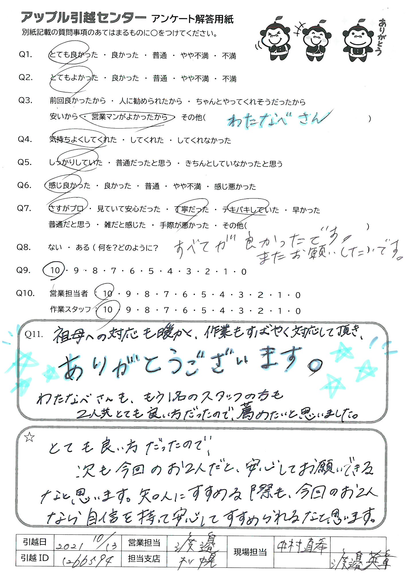 A.祖母への対応も暖かく、作業もすばやく対応して頂き、ありがとうございます。 わたなべさんも、もう1名のスタッフの方も2人共とても良い方だったので、薦めたいと思いました。