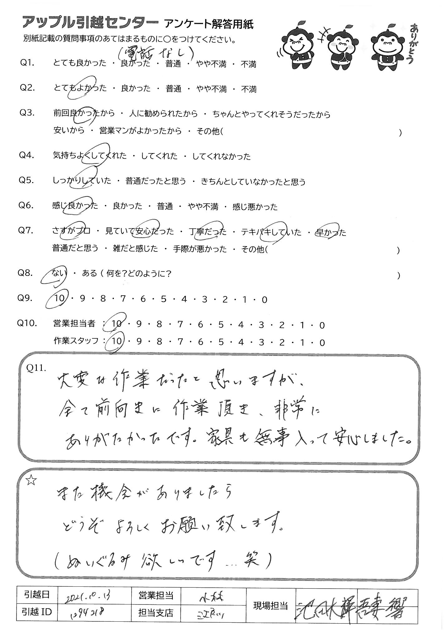A.引っ越し業者に頼むのが初めてでいまいちイメージが出来なかったが、アップルさんは引っ越しまで全てWeb(メール)で完結するので簡単でした。そして費用も事前に確定しているのがとても安心で、他社と比べるとかなりお安いにも関わらず評価が良かったのでこちらに決めましたが、当日は想像以上で文句なしの一言です。 当日のお電話でも到着後の挨拶もとても丁寧で、作業も驚くほど早く、かつ丁寧で無駄話も一切なく雨で暗い中あっという間に荷物を運んでくださいました。 妊娠中の私の身体も気遣っていただき、不快な思いをするどころか夫婦共に全てを通して大満足でした。 次引越しをするのはかなり先だと思いますが絶対にアップルさんにお願いしたいし、周りにも自信を持って全力でお勧めしたいと思います。 担当してくださったお三方、皆さま素晴らしかったですが特に中心となり対応していただいた小岸さんがとても良かったです。 あまりにもしっかりされているので思わず年齢を聞いて驚きました。 夫婦共にアップルさん、小岸さんのファンになりました! 担当してくださった小岸さん、森田さん、鮫島さん、本当にありがとうございました。 アップルさんにお願いして心から良かったです。