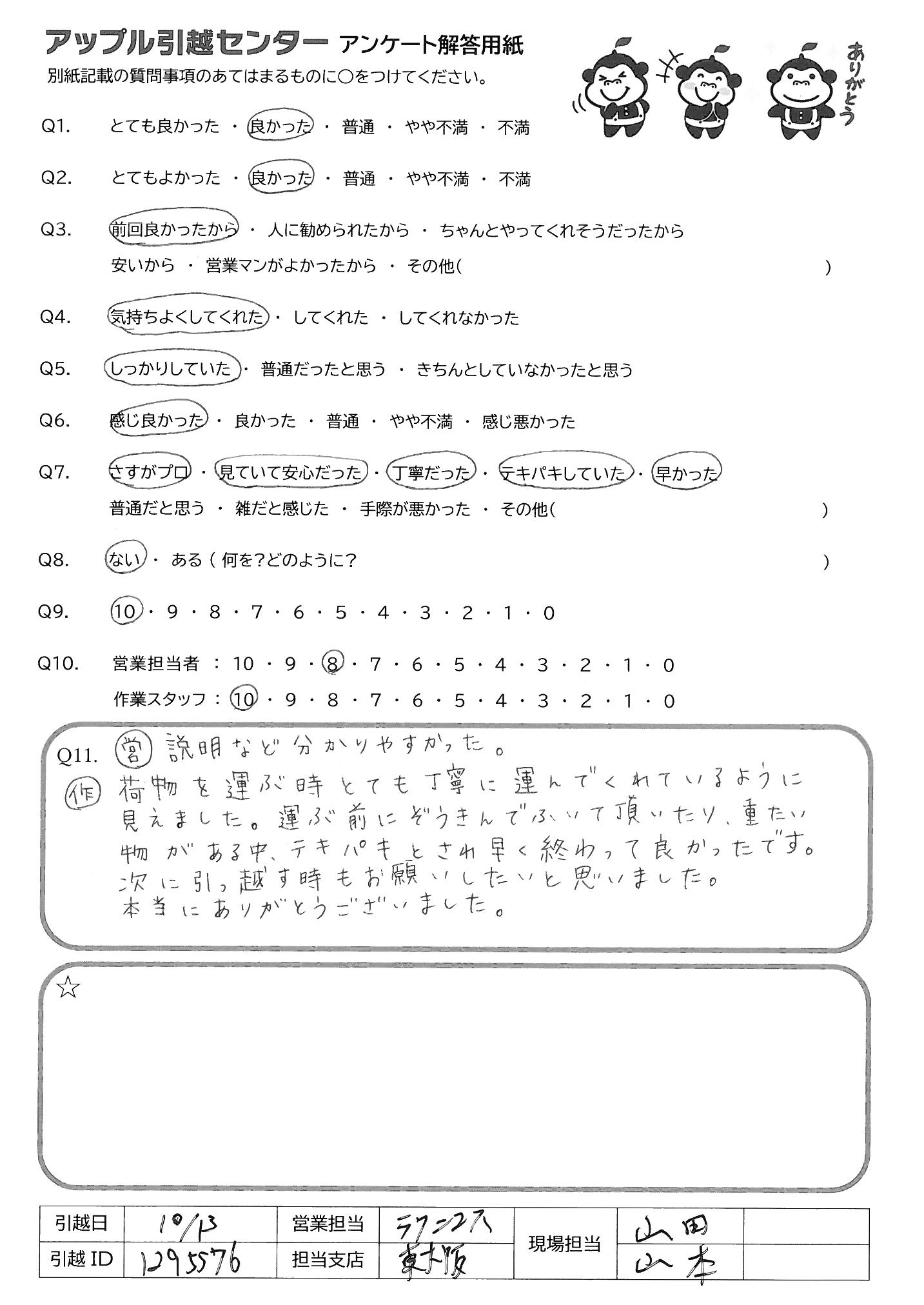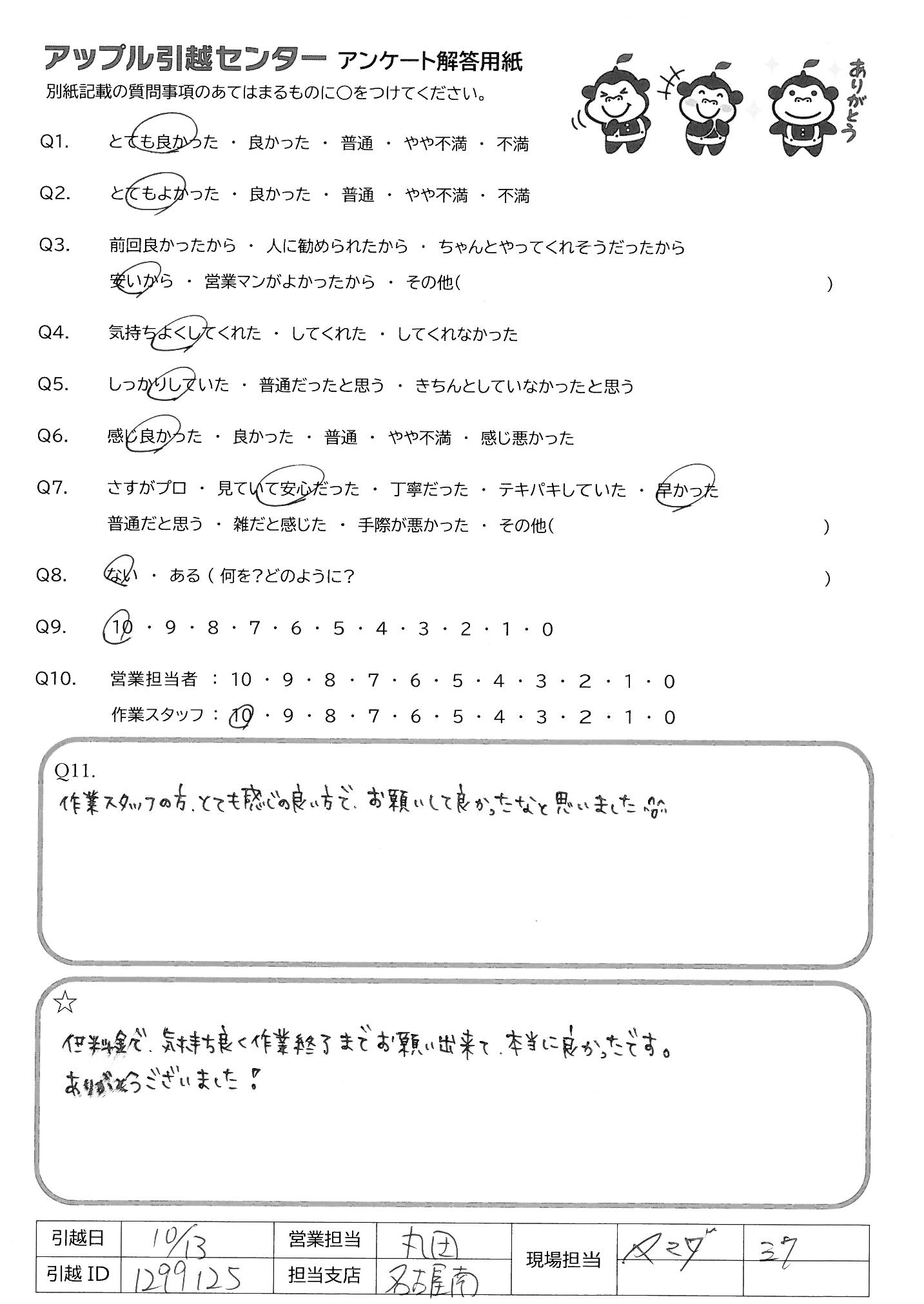 A.不用品の数を何回も変えてしまい、その度にコールセンターへお電話していたのですが、とても丁寧な方が対応してくださり、金額もしっかり教えていただけたので安心でした。 引越し業者の方がこんなに丁寧で笑顔も素敵で、最後までしっかりと対応してくださるなんて思っていませんでした。 次回引越しをする際も、絶対アップル引越センターさんでお願いします! 荷物も多く、ロフトにも上げたいものを上げてくださり本当にありがとうございました!!