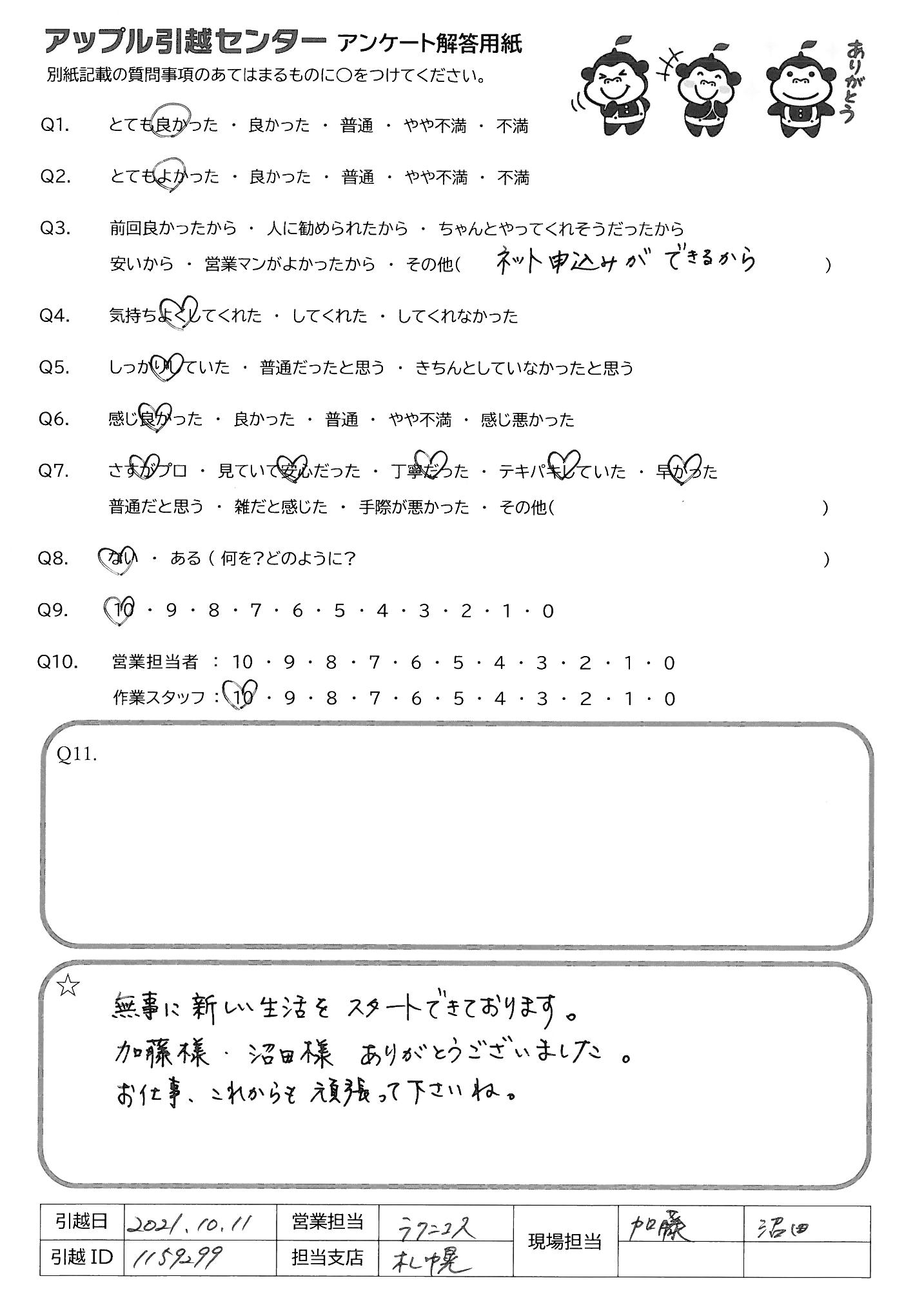 引越し日:2021年10月11日 エリア:北海道札幌市手稲区