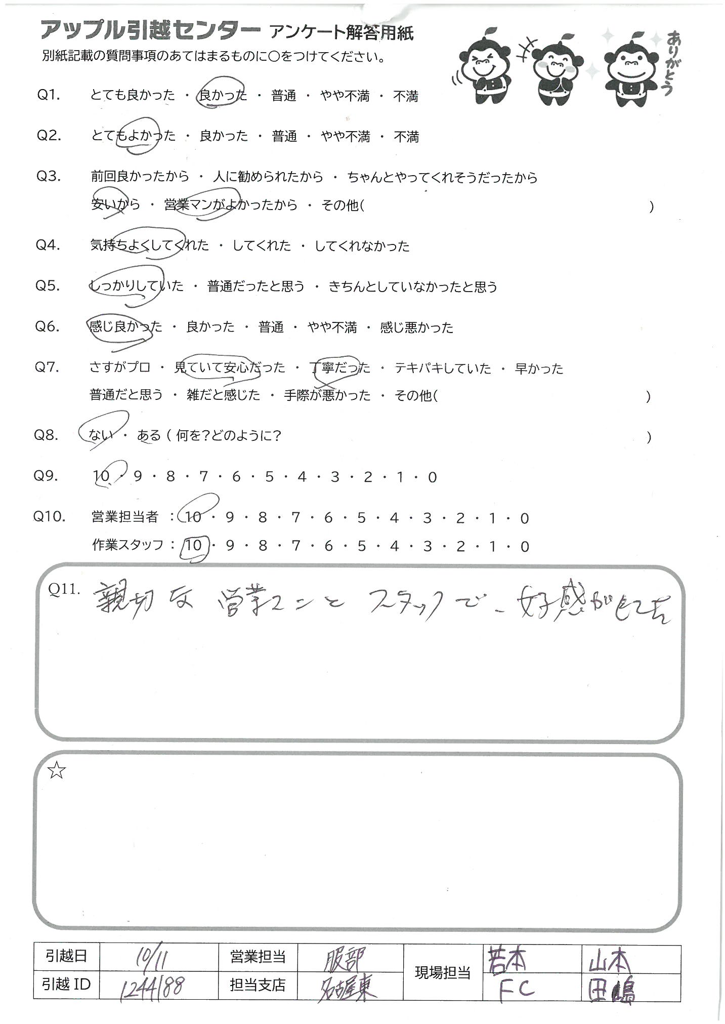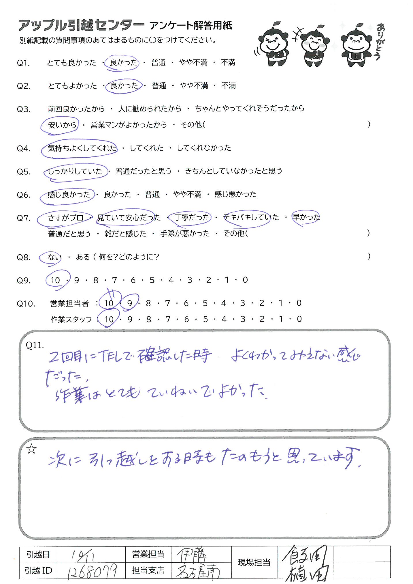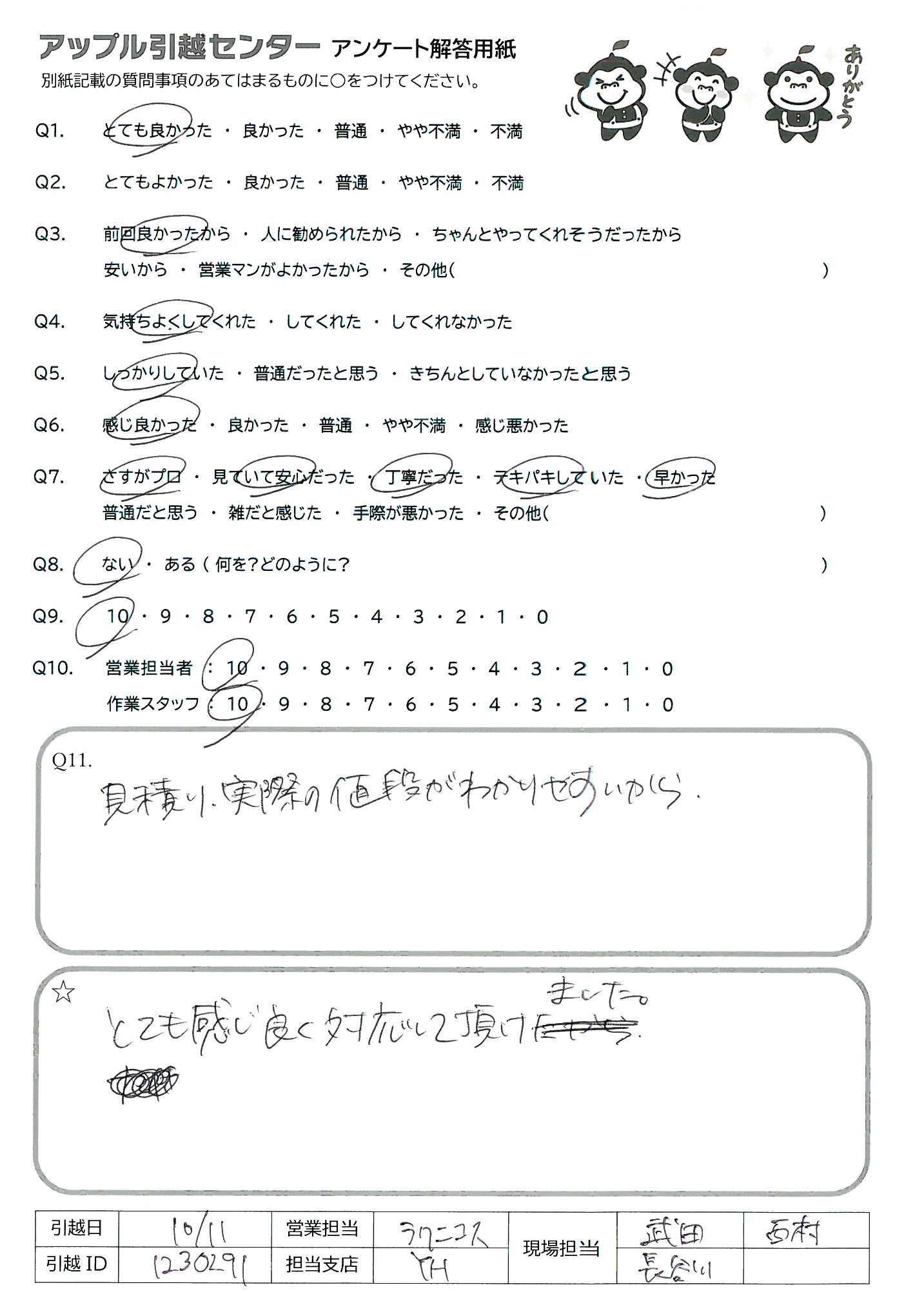 A.他の引越し会社がどんな感じかわからないのでQ9、10は5にしました。