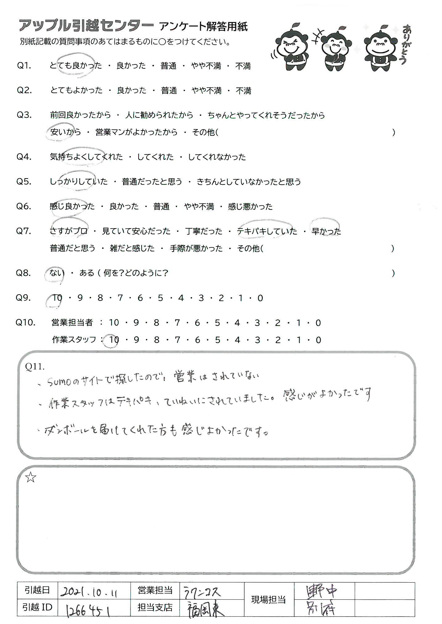 引越し日:2021年10月11日 エリア:福岡県福岡市中央区