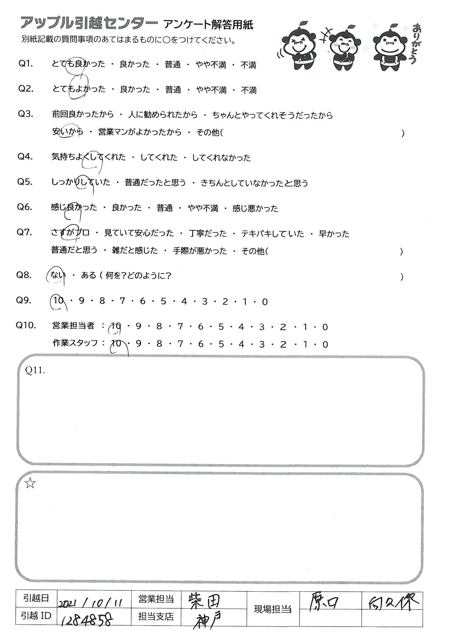 引越し日:2021年10月11日 エリア:兵庫県神戸市中央区