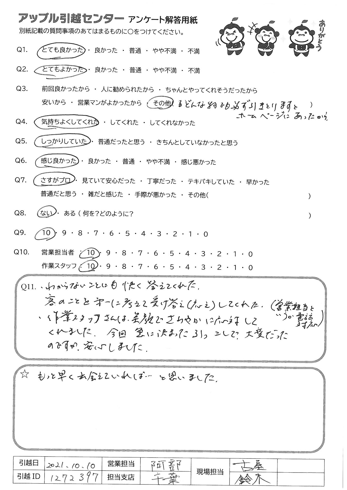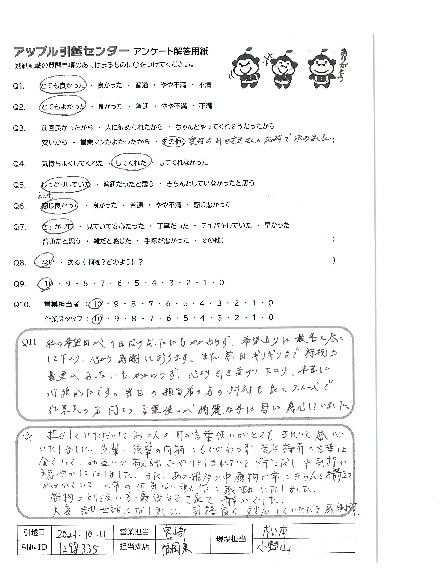 A.お二人とも、とても感じが良く、動きは速いし、びっくりする程、力持ちで流石だなぁと感心しました。とても安心感がありました。アップルさんにして良かったと心から思いました!