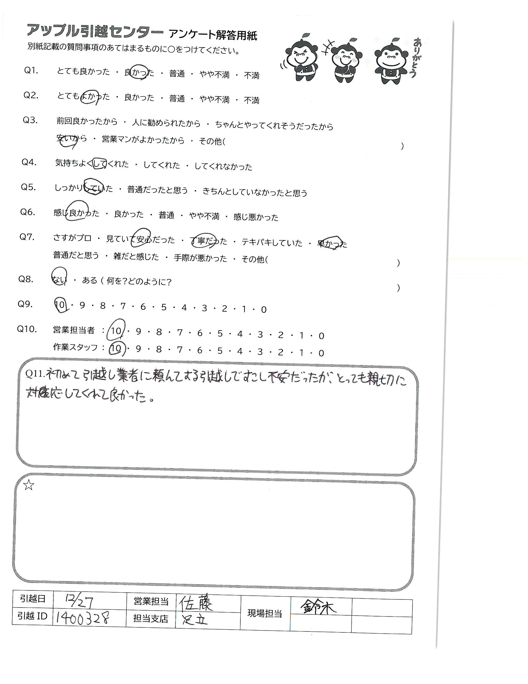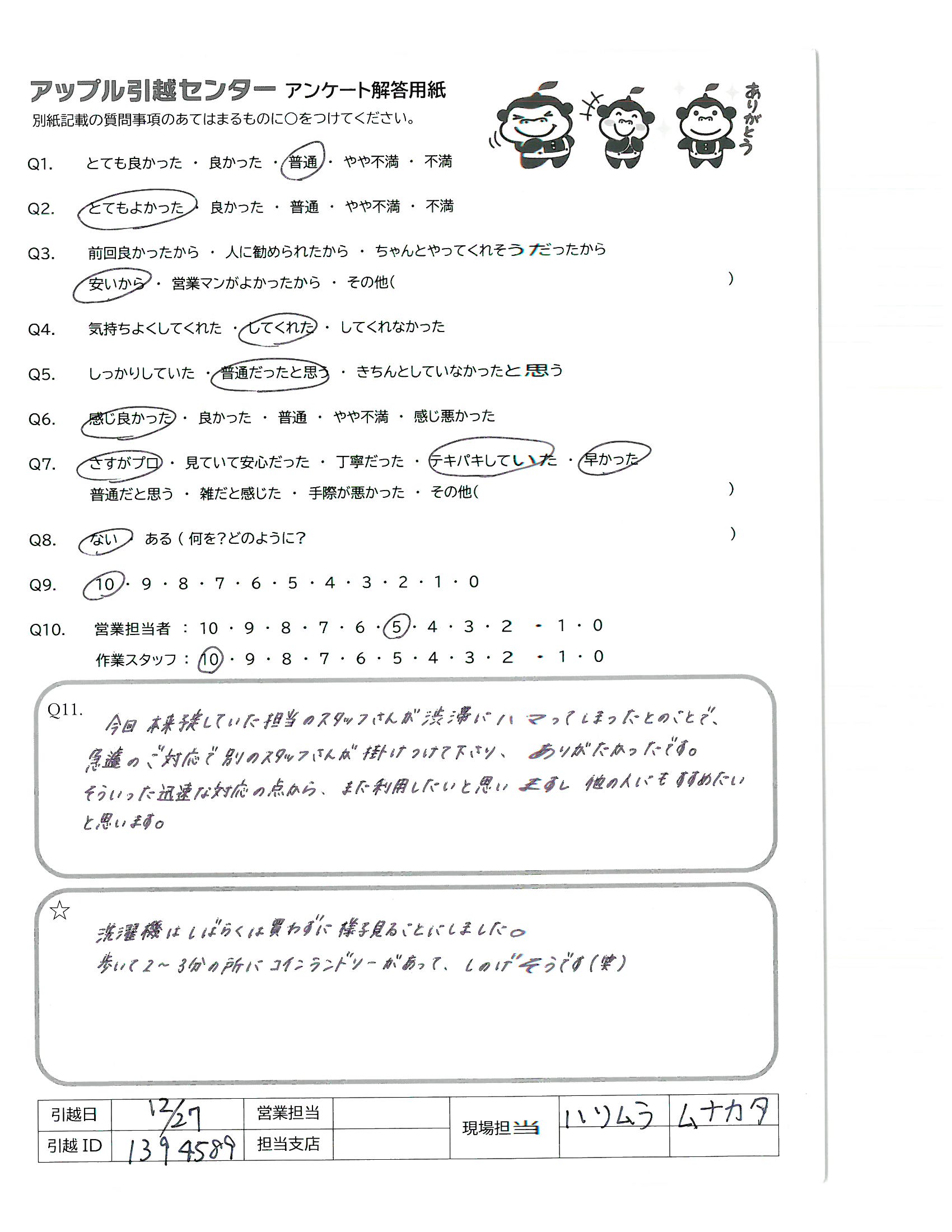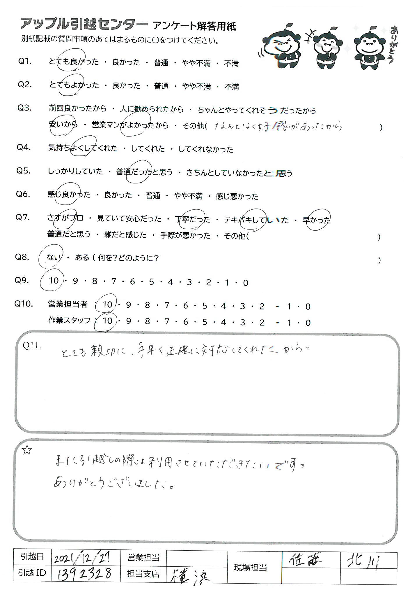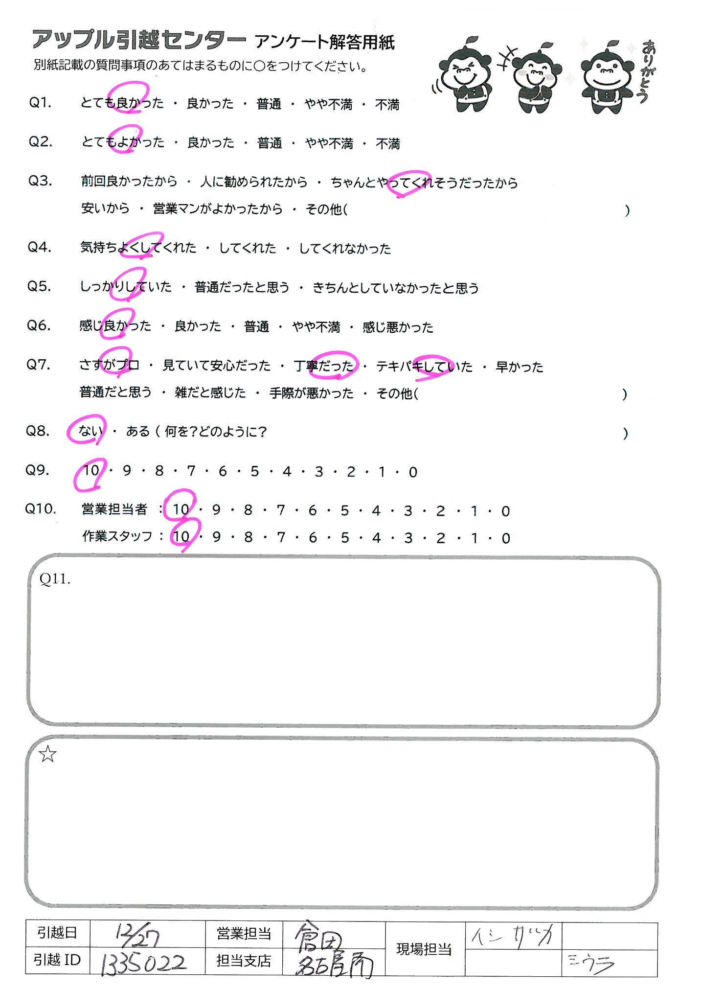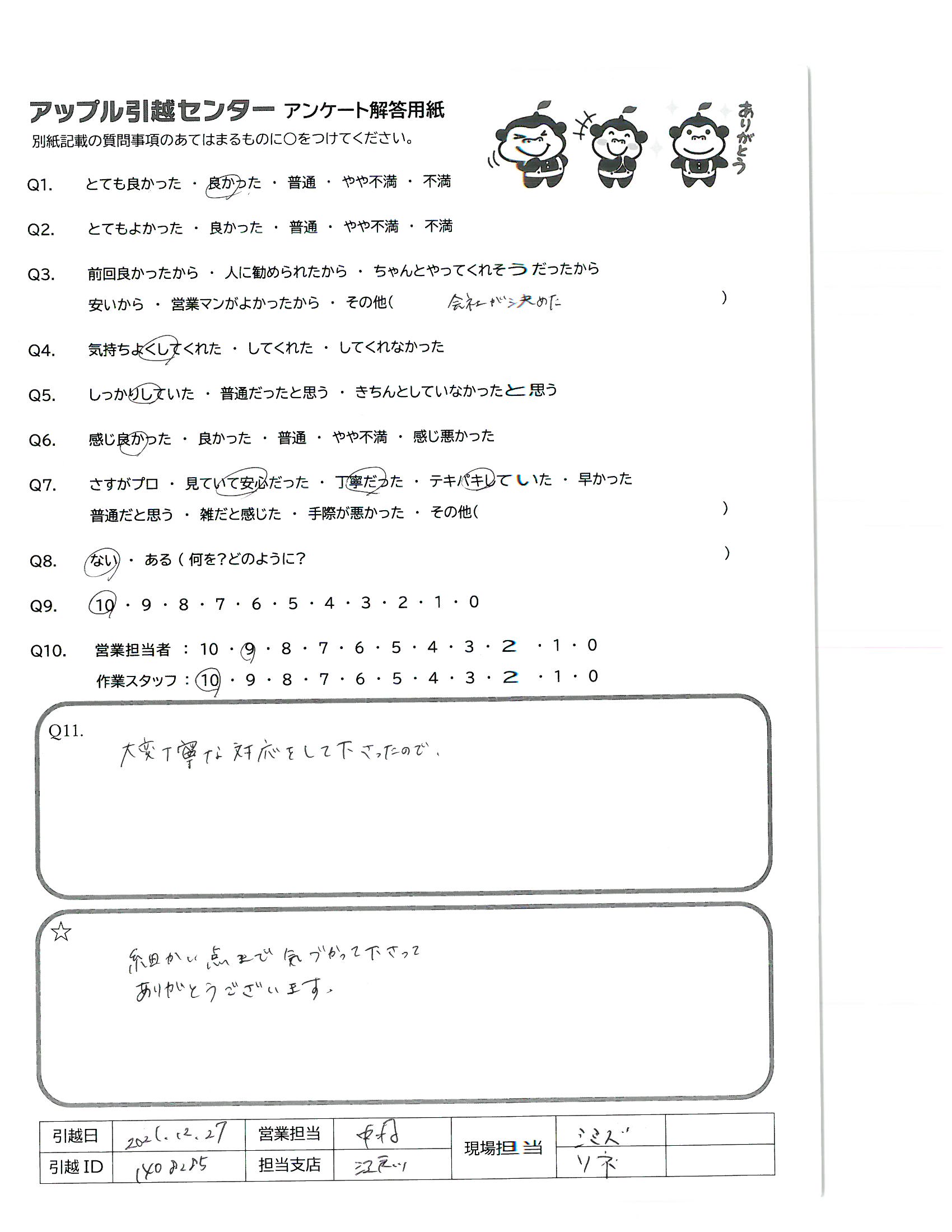 A.引越について丁寧に説明してくれ、他社との違い(エアコン工事など)も教えてくれたので見積比較の参考になった。4社見積をとったが、きちんと座って説明してくれたのは久家さんだけで、アップルは初めてきいた社名だったけれど、きちんとした会社なのだろうなと感じました。金額も希望を聞いていただきありがとうございました。 当日作業してくださった方々も、引越先のマンションの管理人からの問い合わせにも丁寧に対応してくれたため、安心して任せることができた。 皆さん気持ちよく作業してくれました。 ありがとうございました。