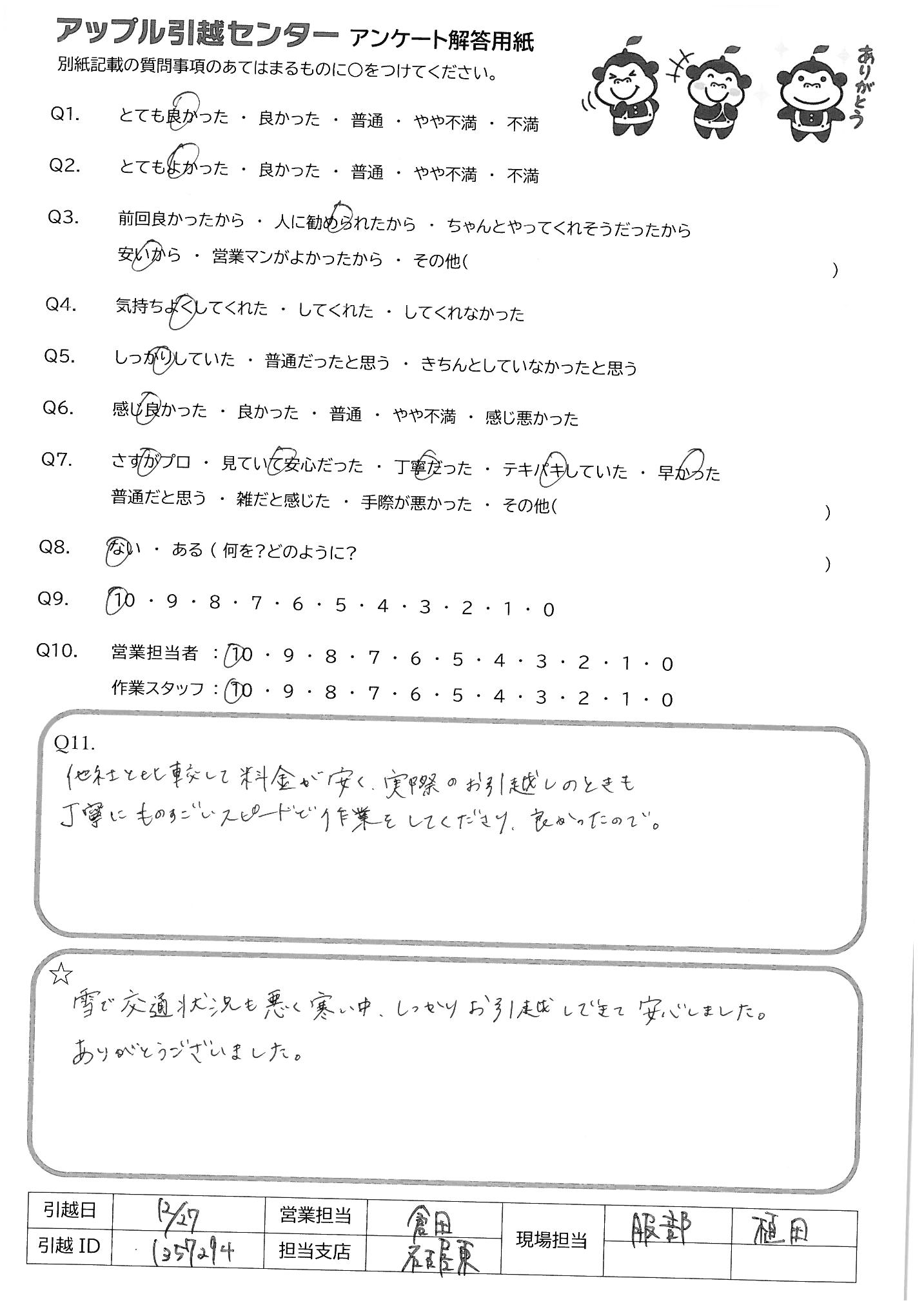 A.雪で交通状況も悪く寒い中、しっかりお引越しできて安心しました。 ありがとうございました。