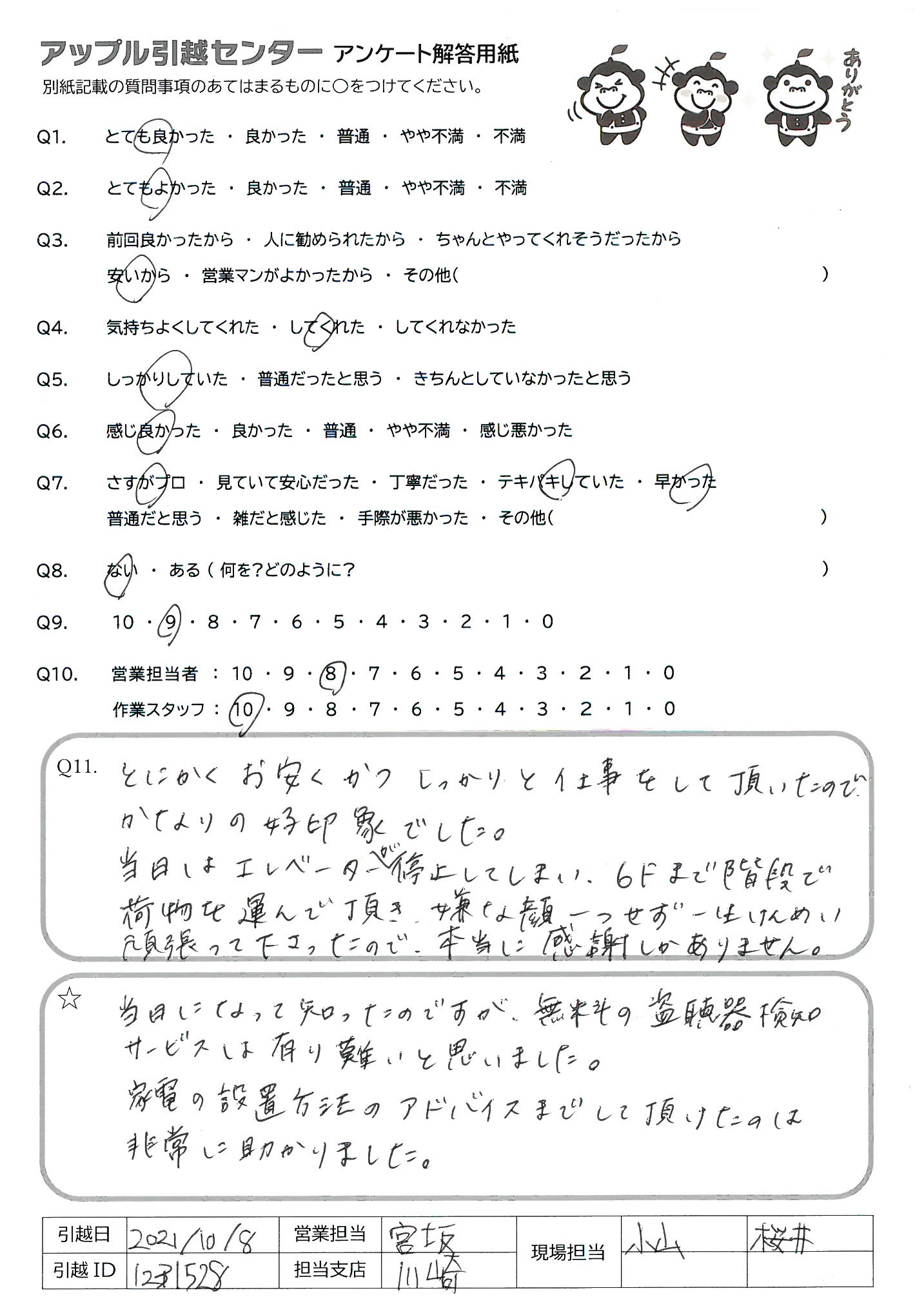 A.引き取りの時電話番号の誤記入で 連絡が来なくて予定時間より早く到着して慌ててしまいました。でも仕事は丁寧でしっかりとしてもらい感謝です。また新居ではアドバイスもいただきありがたかったです。