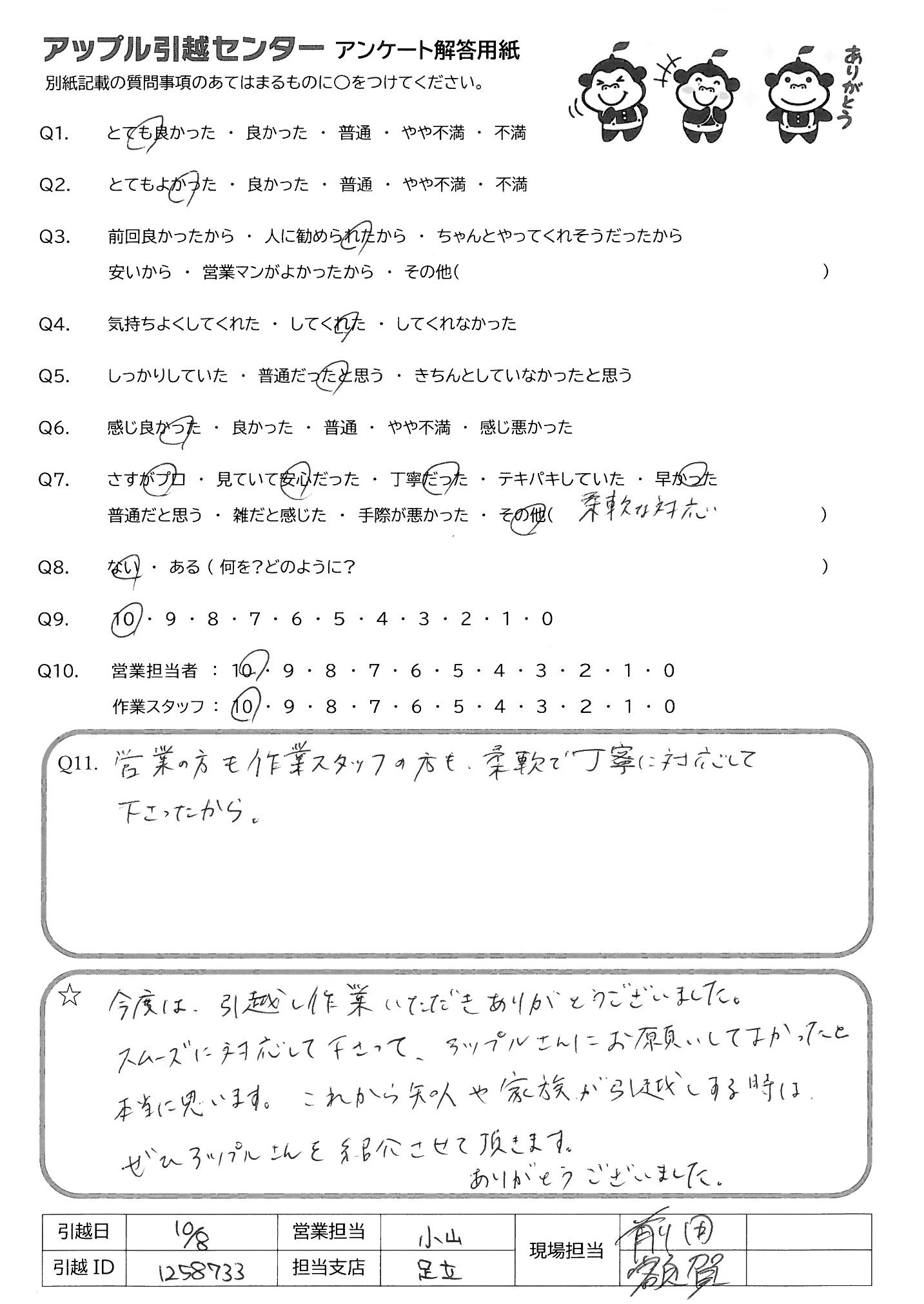 A.引っ越し作業をしてくださりありがとうございました。手際が良く効率的でした。 家具や段ボールの扱いが雑だったこと以外はとても良かったです。 IKEA家具の組み立てをしてくださったのがとても助かりました。ありがとうございました。
