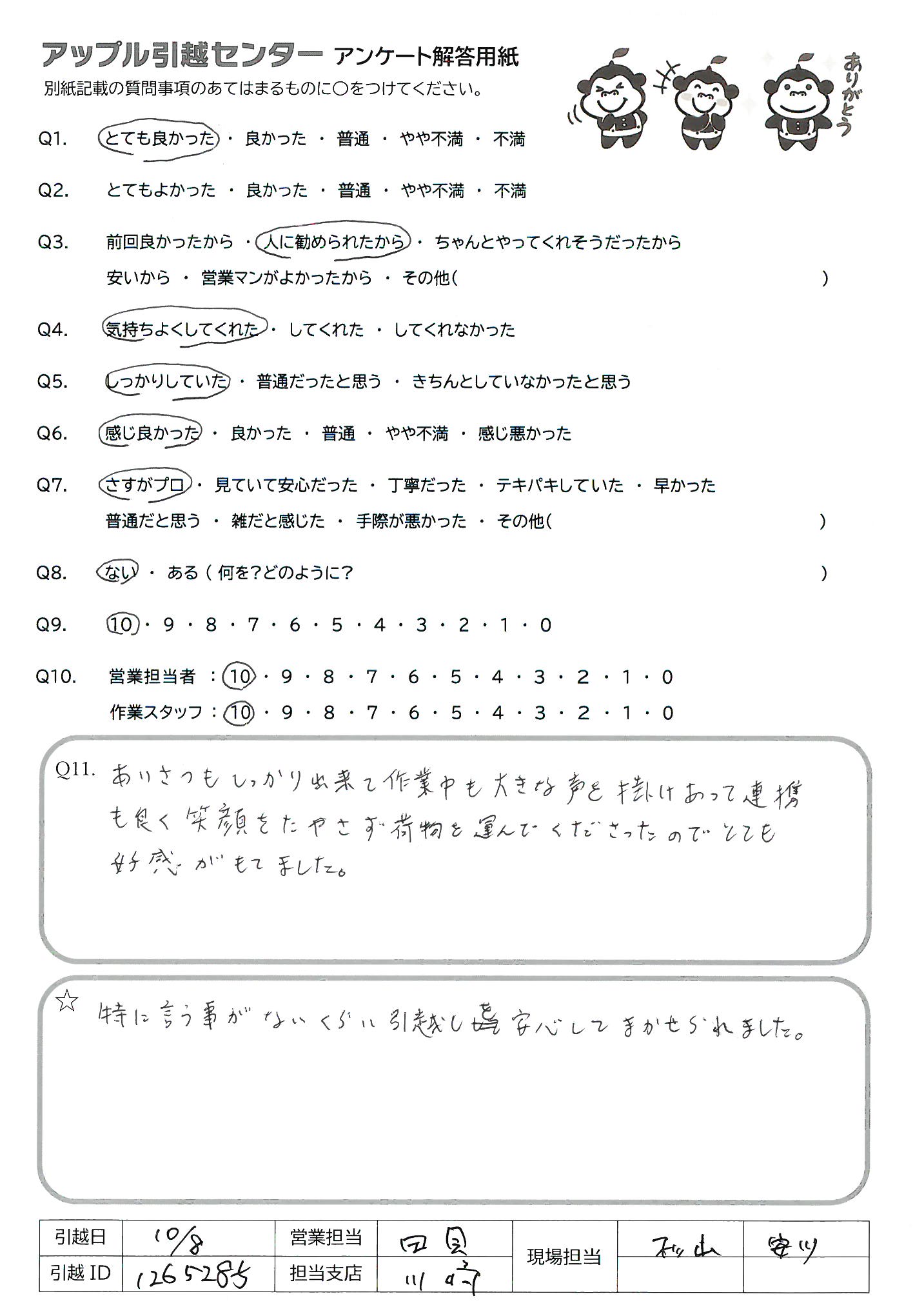 A.電話対応も作業スタッフもとても感じが良くて仕事も丁寧でした。 家族の引越しで3回目になりますがいつも安心してお願いできます。次また引越することがあればまた利用したいです。