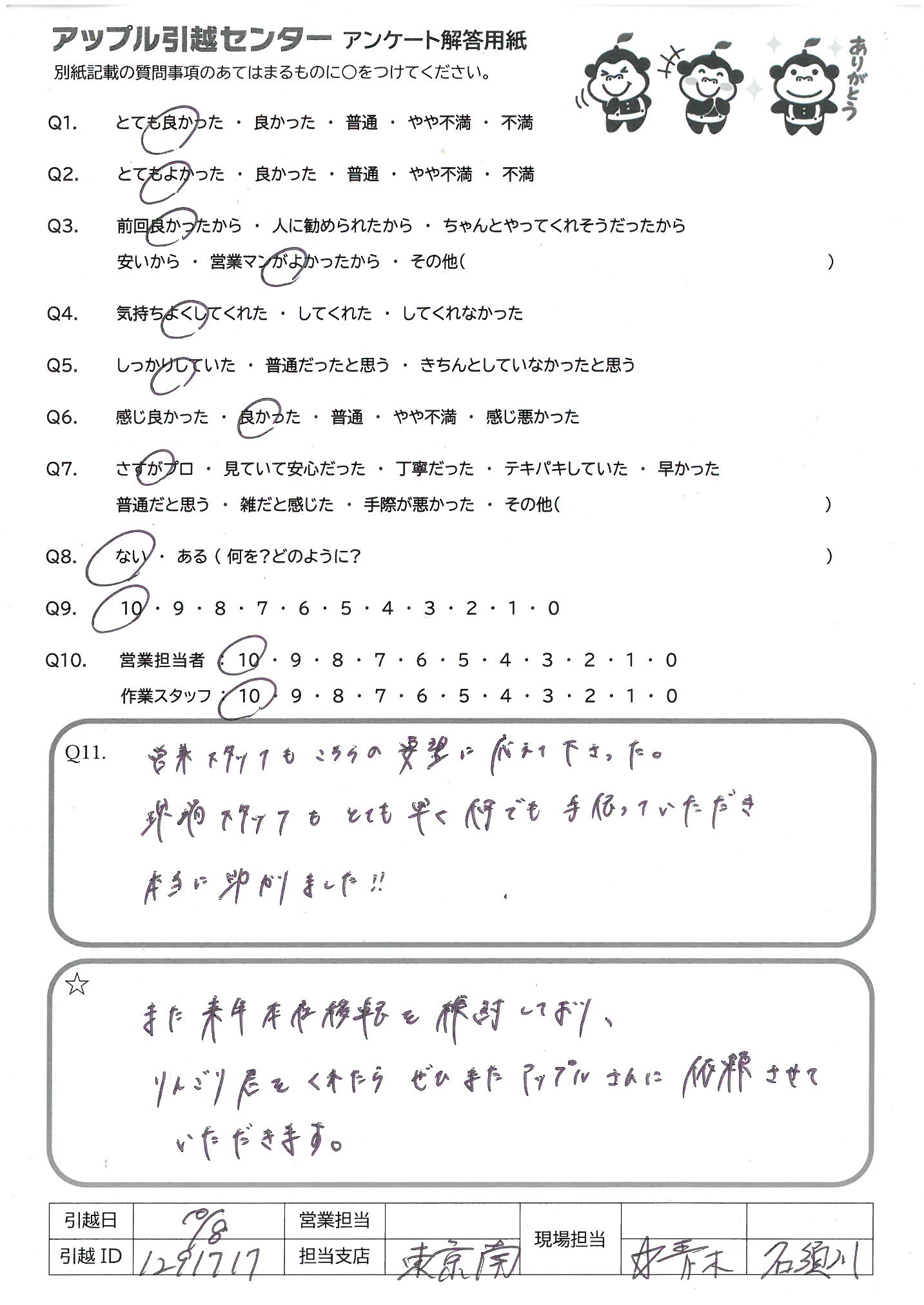 A.今度は、引越し作業いただきありがとうございました。 スムーズに対応して下さって、アップルさんにお願いしてよかったと本当に思います。これから知人や家族が引越しする時はぜひアップルさんを紹介させて頂きます。ありがとうございました。